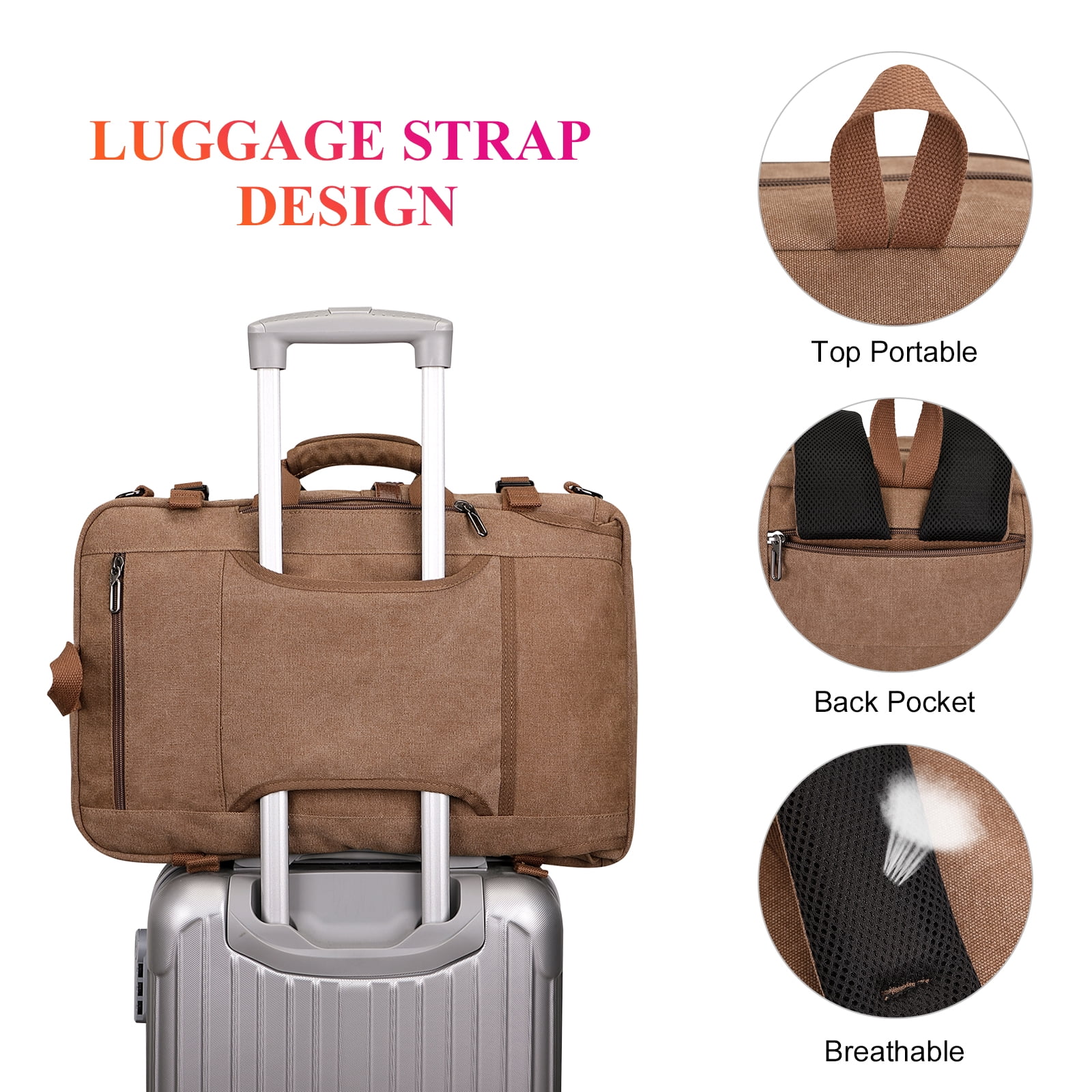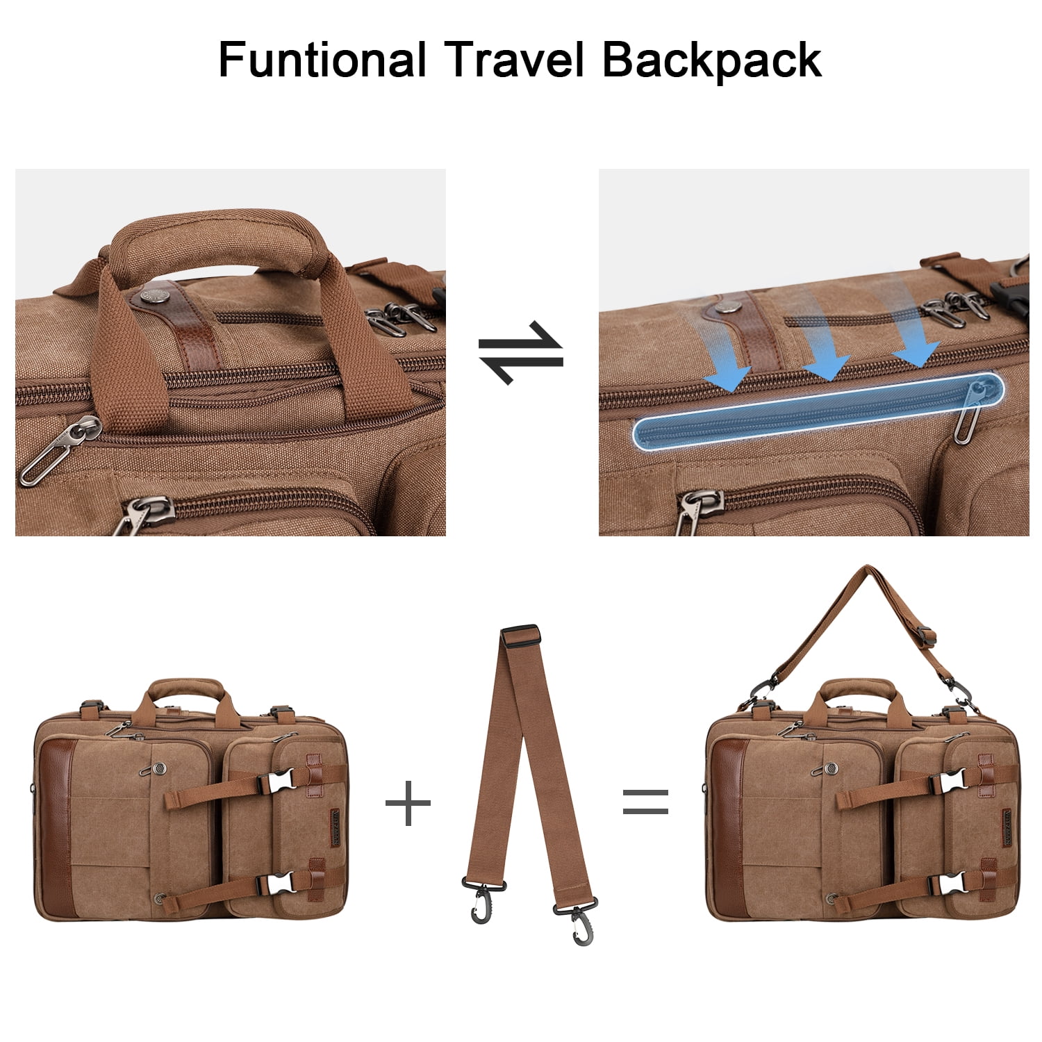 ✈[MATERIAL]: This canvas backpack is made of high quality canvas with PU leather; Polyester lining; Product Dimension:Approx 12.5″L x 19.5″H x 8″ W; Expansion 12.5″L x 19.5″H x 10.15″ W Weight: 1.85kg(4.06 lbs), Come with a inch duffel strap. ✈[EXPANDABLE DESIGN]:Dimensions:15″L x 18.5″H x 8.3″ W, dimensions after extended 19.5x13x11.5inch. You can expand the zipper according to your requirement. The duffel belt on the back allows being slide over the luggage tube,backpack very easy to carry, it is great daily travel. This backpack meets the maximum size allowed by IATA flights, can be fitted overhead and under-seat, is ideal for a weekend trip, business trip. ✈[Multi Practical Pocket Design]: Product External: 6 fornt pockets(2 zippered pockets to hide the duffel handheld), 1 side open pockets, 1 back large zip pocket, 1 main compartment; Internal structure: 2 laptop pockets + 2 open pockets + 1 large zip pocket , 1 zipper pocket on the back that hides the backpack strap to convert briefcase, duffel bag. ✈[MULTIFUNCTIONAL BACKPACK]: You can easily convert this backpack into a Backpack ,Duffel Bag, Crossbody Bag, Tote Bag; This canvas rucksack come with a woven removable &adjustable duffel strap.The backpack straps can be hidden in the back strap pocket when you carry this bag as duffel bag,or crossbody bag or tote bag,or carry on backpack. ✈[EASY TO ORGANIZE]: The travel backpack’s main compartment with a laptop pocket for 12-17 inch laptop, and an Ipad pocket, and roomy space to store different travel gears. The front compartment with many various pockets can be used to store pens, keychain, and other small items for quick pick out.