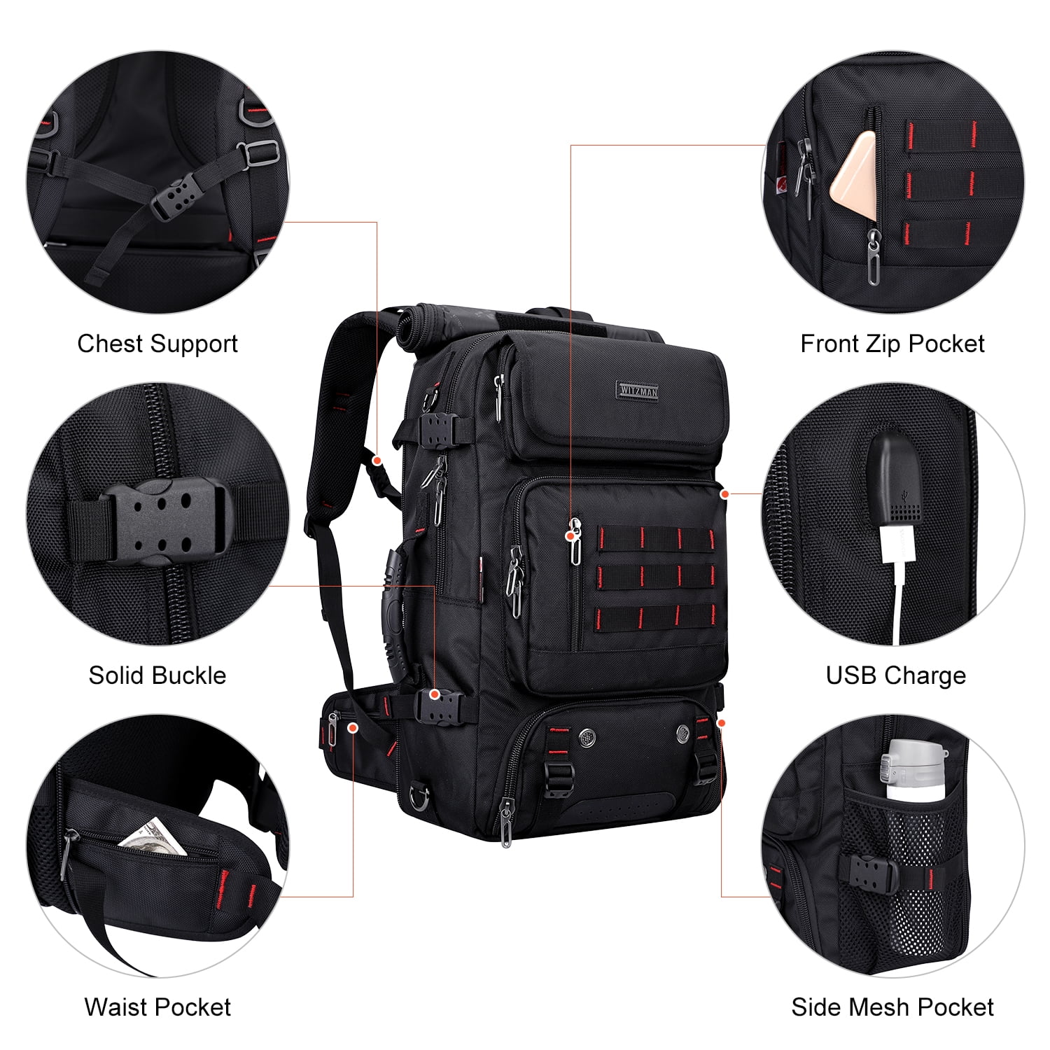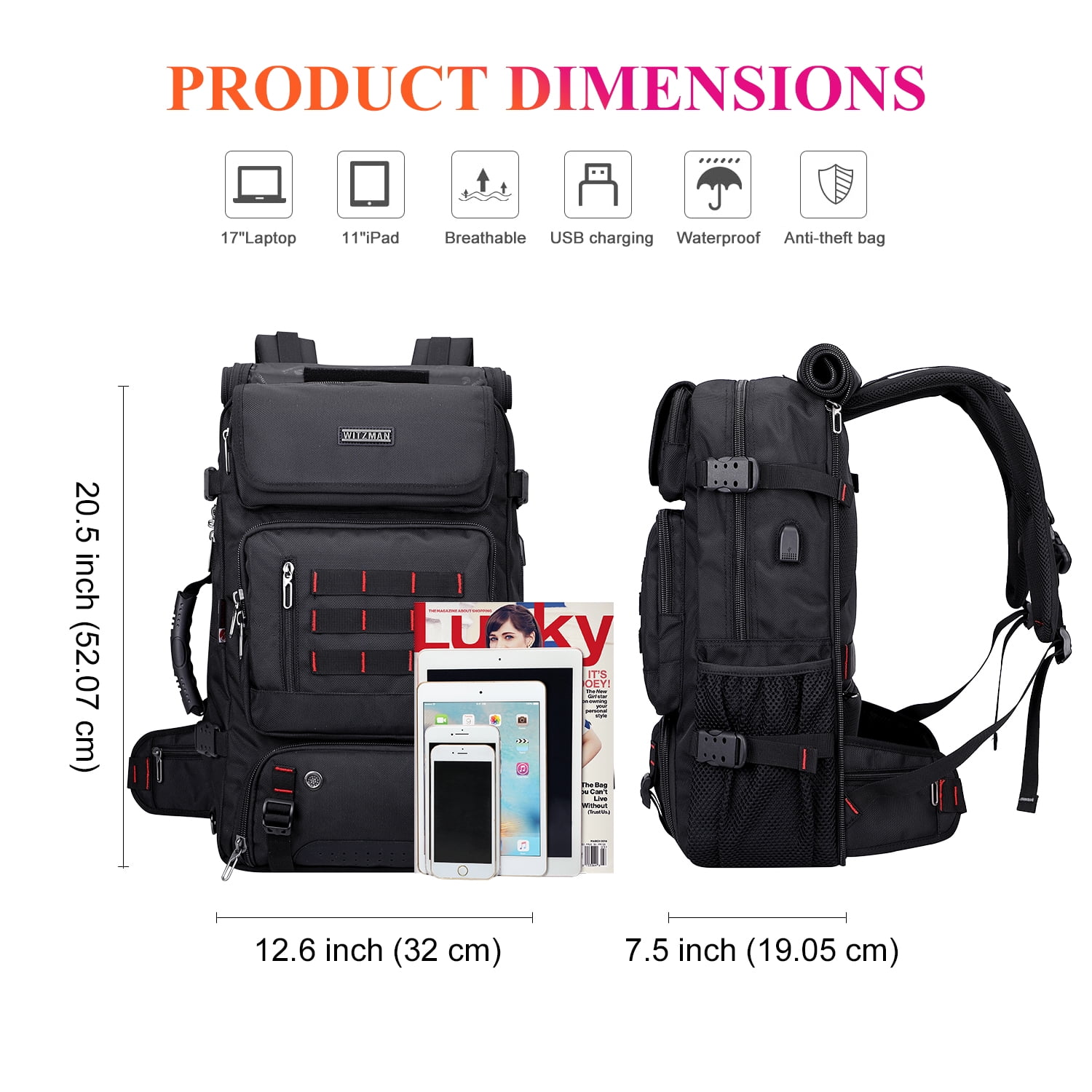 ✈[Material]: This travel backpacks made from high quality nylon fabric. Black polyester lining with soft decompression foam. ✈[Dimension & Large Capacity]: Approx 12.6″L x 20.5″H x 7.5″ W; Weight: 1.78kg (3.91 lbs). A 29-52 inch removable and adjustable shoulder strap; Can hold your 17 inch laptop, 2 sets of clothes, shoes, water bottle, umbrella. ✈[Backpack Structure-Multi Pocket Design]: 1 main top U-shaped zipper pocket with 2 open pockets, 1 charging pocket, 2 large zip pocket, 1 18 inch laptop pocket and ipad pocket inside; 1 front medium zip pocket with 2 open pockets and pocket inside; 1 front large flap zipper pocket, 1 bottom shoe compartment; 1 side mesh pocket;1 zipper pocket on the back that hides the backpack strap. ✈[Multifunctional Carrying On Backpack]: This men rucksack come with an adjustable and removable shoulder strap, can be used as a duffel bag. Versatility pocketto keep your items organized and easy to find. Suitability travel gifts for men women who like international travel, camping,overnight trip. ✈[Convenient USB Port and Headphone Port Design]: With built in USB charger port outside and built in charging cable inside, great convenience for charging your electronic items via connecting your own power bank. Offers you a more convenient way to charge your phone go with hands free. ✈[Multiple occasions]: The large capacity backpack is a great travel backpack for OUTDOOR/INDOOR activities and perfect for camping, hiking, vacations, travel, trekking, hunting,fishing, cycling, mountaineering, weekend getaways, occasional travel, overnight trips and many outdoor activities.