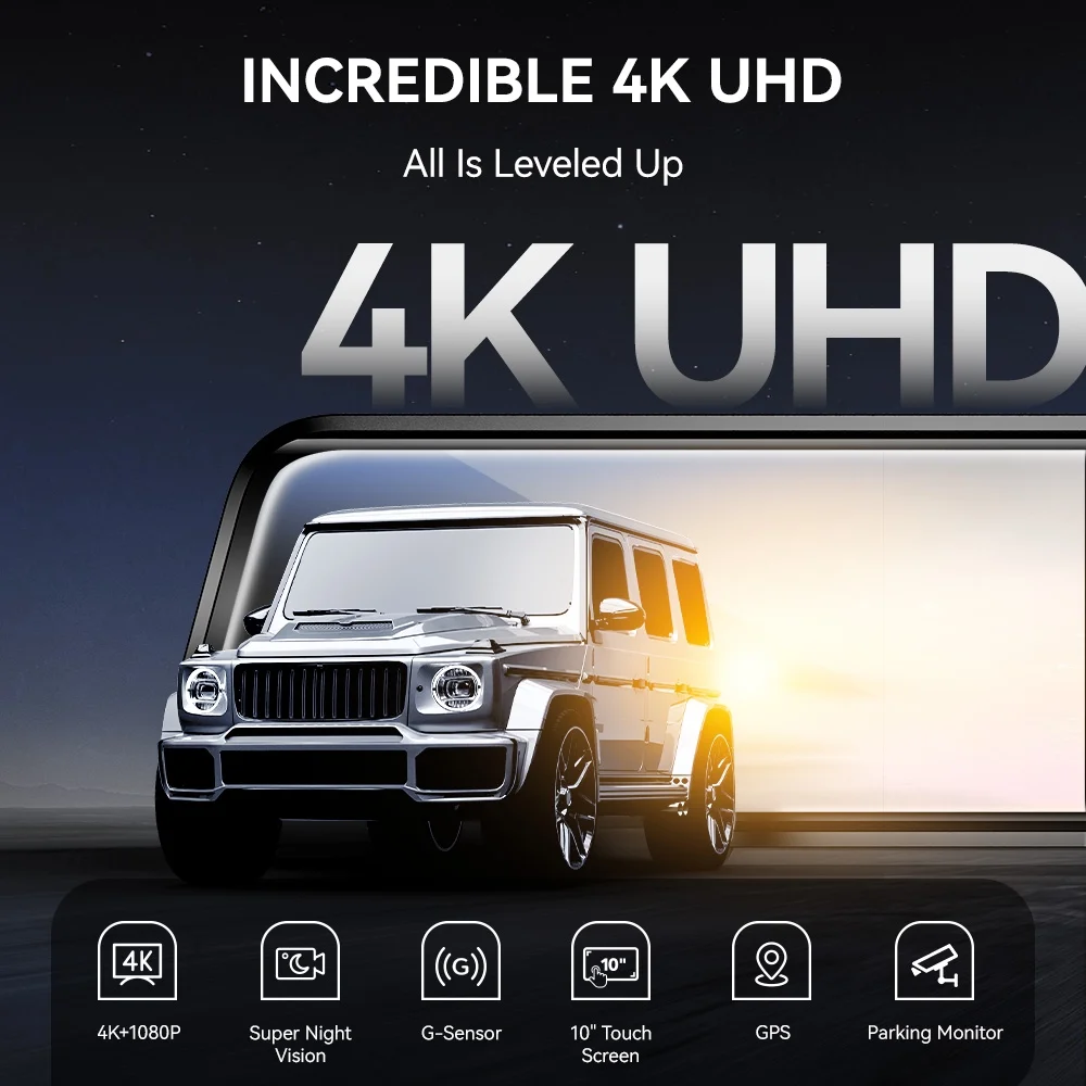 [Smart Split Screen Dash Cam] The rearview mirror dashcam is equipped with 4K front and 1080P rear resolution. The front dashcam can choose between 4K, 2.5K and 1080P for perfect recording quality. Easily customize your viewing angle by swiping up and down on the screen. Swipe left and right to switch between the front image, rear image, or front and rear split screen images. [Streaming Technology] Our rear view mirror backup camera uses streaming technology. The recorded footage is displayed in real time, expanding your field of view and eliminating blind spots. Compared with traditional rearview mirrors, streaming rearview mirrors have a wider field of view, ultra-clear images without distortion, ensuring a safer driving experience. [GPS Tracking, Night Vision & Parking Monitoring] Plug a GPS receiver into our rearview mirror dash cam and view real-time speed and direction on the screen to stay up to date and easily track your journey. In addition, we use WDR technology to balance light to ensure a clear view when driving at night. Connect our hardware kit (hardware kit is sold separately) to activate 24-hour parking monitoring, which provides an extra layer of security for your vehicle. When parking, the rearview mirror dash camera automatically starts to capture any potential accidents or surprises. [Type-C Port, Loop Recording and G-Sensor] Type-C interface to increase the transmission data rate and support higher current. Enjoy continuous 1/2/3 minutes of video recording with the loop recording function of the rear view mirror dashcam, overwriting the oldest video with the new video to ensure there is plenty of space. The G-Sensor automatically detects a collision and locks the current video, preserving valuable evidence in the locked video. [ 64GB Card & Super After-Sales Service ] WOLFBOX 4K Rearview Mirror Dash Cam comes with a free 64GB card. We offer a 1-year full warranty on our products to ensure your peace of mind. Our dedicated technical support team is available 24/7 to answer any questions or concerns you may have. Contact us to experience our excellent customer service. [ What’s in the package? ] 1× 4K Mirror Dash Cam 1× 64GB TF Card 1× Rear Camera 1× Mount Bracket 1× Car Charger 4× Straps 1× Backup Camera Cable 1× User Manual 1× GPS Receiver 1× Cleaning Cloth