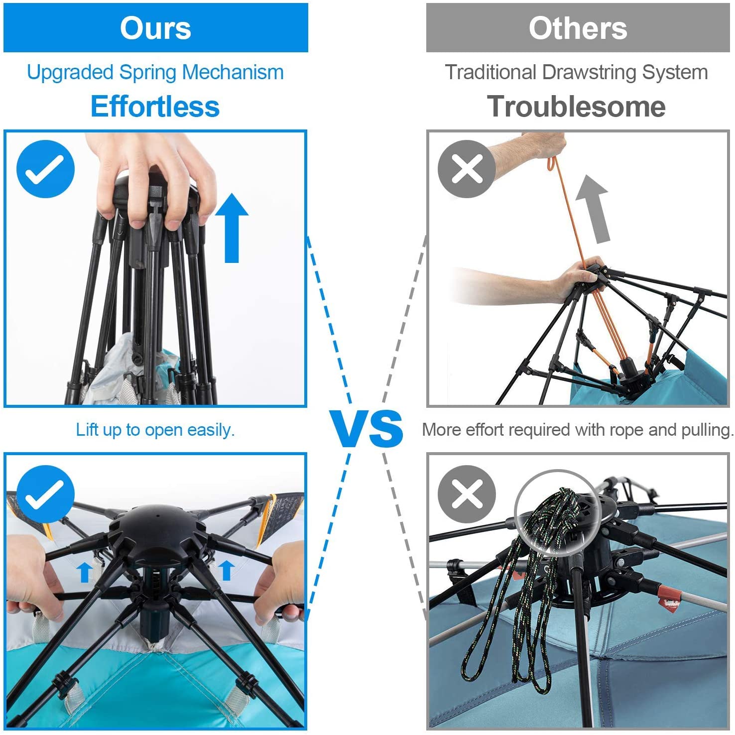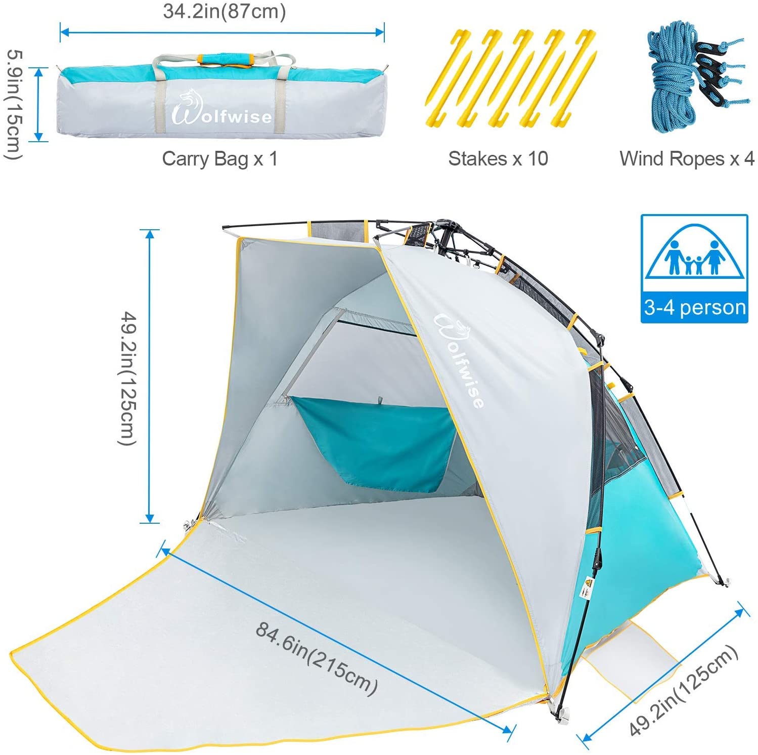 WolfWise 3-4 Person Easy Up Beach Tent UPF 50+ Portable Instant Sun Shelter Canopy Umbrella with Extended Zippered Porch Easy Setup & Super Stable: The specially designed spring opening system shows the industry-leading level improvement. One person can set up the beach canopy easily in seconds. Compared drawstring design, this one is faster, effortless, and saves more time. Spacious Space: This beach shade when open is 84.6″ L x 49.2″ W x 49.2″ H with a 47.2” front porch, providing a spacious internal shelter for up to 3-4 people. You can also place two regular beach chairs inside for rest. When needed, it can be quickly folded to a size of 34.2″ L x 5.9″ W x 5.9″ H. Weighing 6.5 lbs, it can be carried by one hand or on your shoulders, and easily loaded into the trunk of the car. Privacy Guarantee: The zippered door and zippered window design provides you with a private space to change swimming suits; breastfeeding; or any other private moment, allows your family to take a rest when they feel tired after long-time play. In addition, the zipper door can be a beach mat when open, and you can play on it. UPF 50+ & Water repellent: This beach shade is made of water repellent polyester fabric and silver-coated inside, it can effectively block harmful UV rays. You’ll remain cool inside the tent even under the scorching sun. And the water-repellent structure will keep you dry and relaxed when it drizzles, but please avoid using it in heavy rain. Excellent Ventilation: In the hot summer days, some other sun shade tent may make you feel breathless on the beach, but ours are different. Our beach shade tent is equipped with 3 oversized mesh windows, which can maximize air circulation while maintaining shade. In addition, the front doors can be fully opened for heat dissipation.