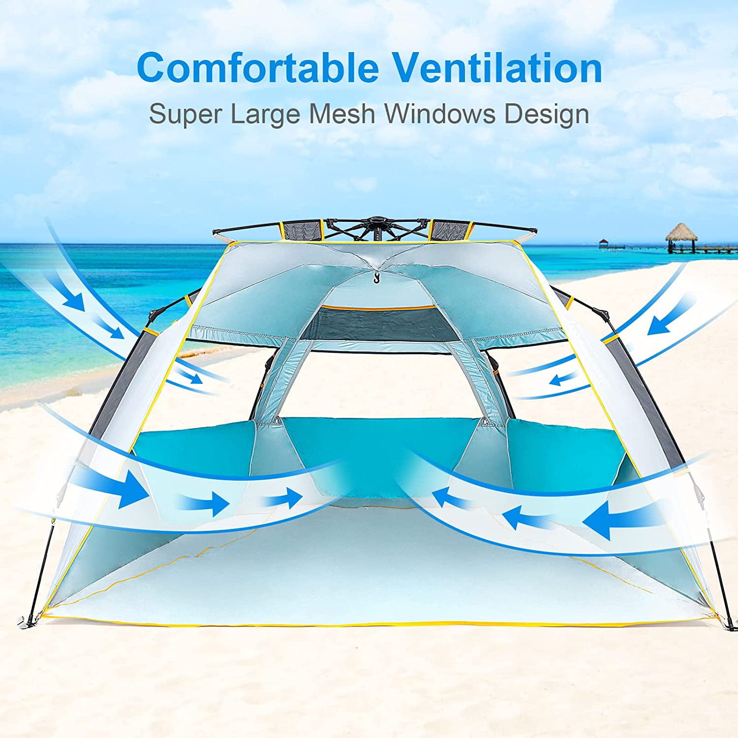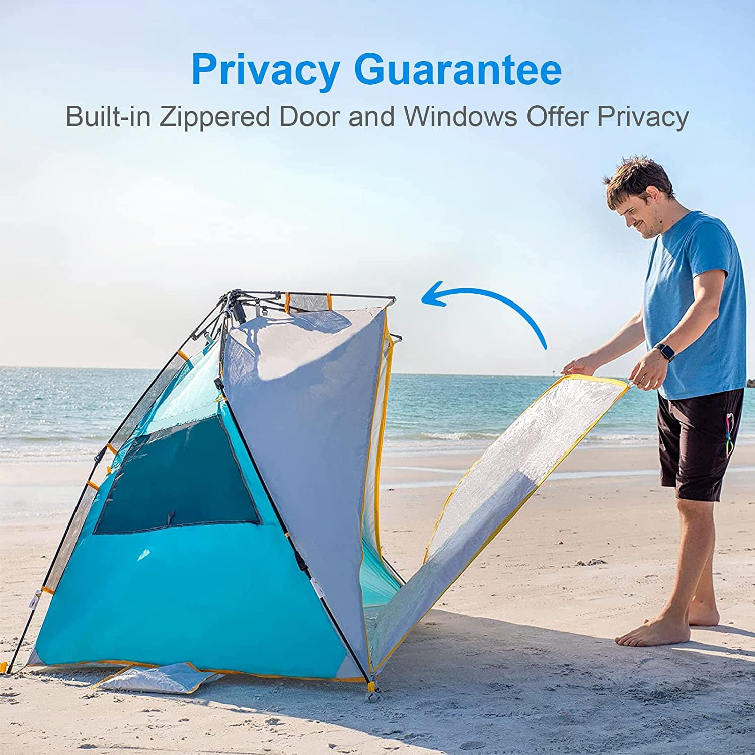 WolfWise 3-4 Person UPF 50+ Easy Up Beach Tent ● The specially designed spring opening system shows an industry-leading level of improvement. One person can set up the beach tent easily in seconds. ● The zippered door and zippered window design provide you with a private space to change swimming suits; breastfeeding. ● Made of water-repellent polyester fabric and silver-coated inside, it can effectively block harmful UV rays. ● Equipped with 3 oversized mesh windows, which can maximize air circulation.