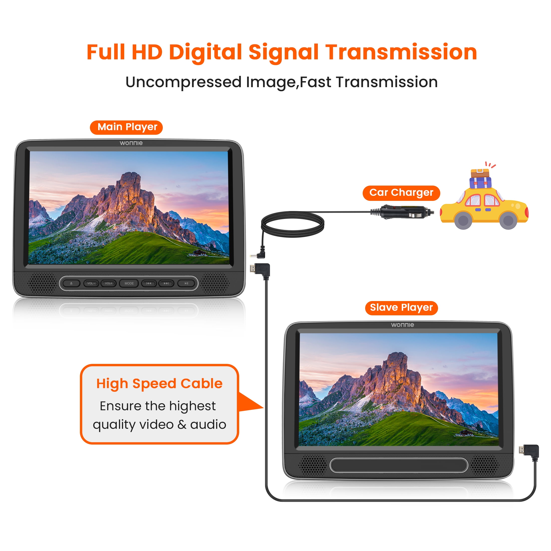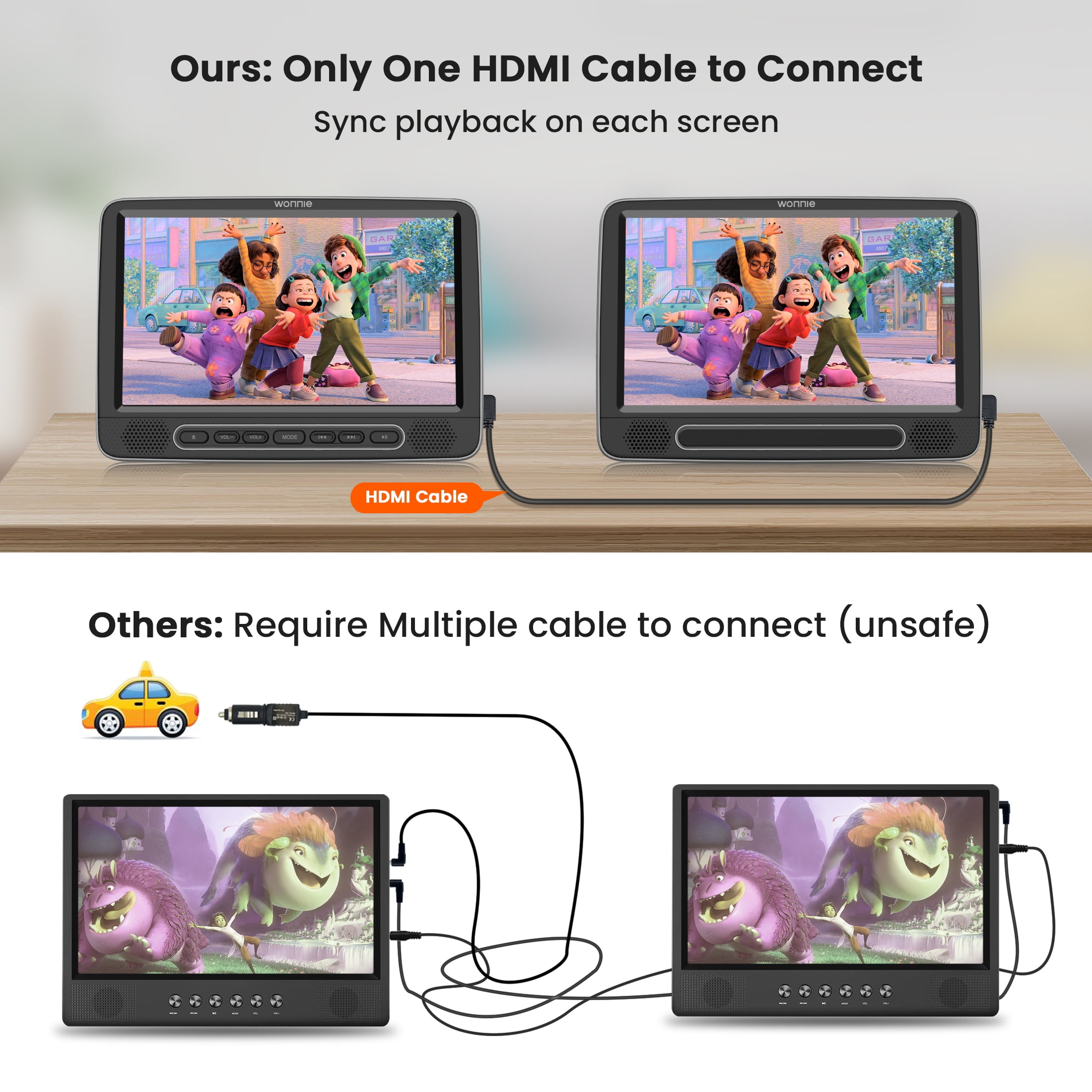 😍【5000mAh Battery Capacity&easy connection】WONNIE portable DVD player have reliable battery capacity ensures continuous playing for up to 5 hours. We also provide AC power adapter and high quality car charger in the package, no more worries about battery dies out when you out.(slave monitor without battery).And our connection method is very simple.Only one HDMI cable is needed to achieve dual screen playback, reducing safety hazards caused by complex circuits.The Kids dual car DVD player supports syncing 1080P videos from your phone, you can share the latest videos and movies as well as music on your phone.