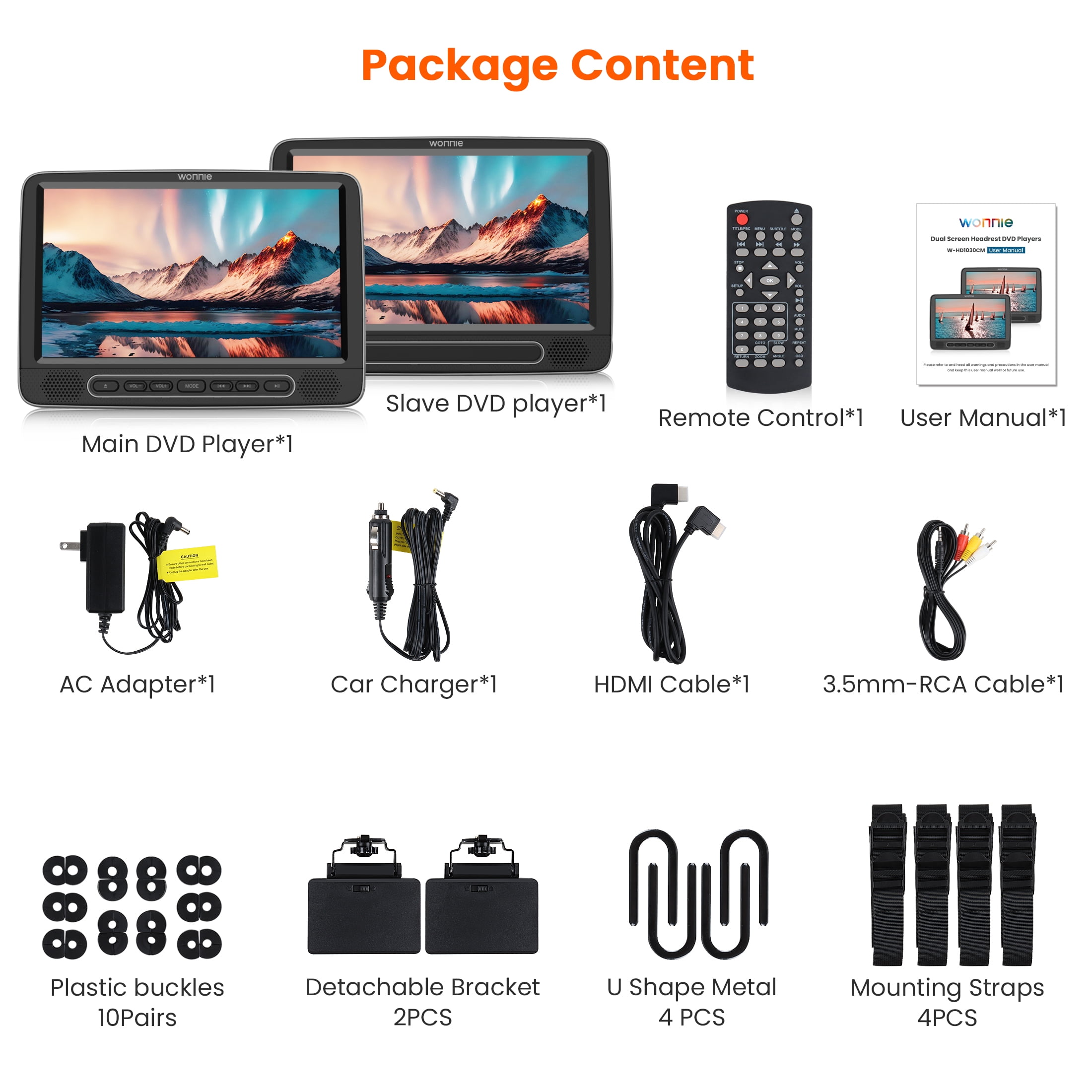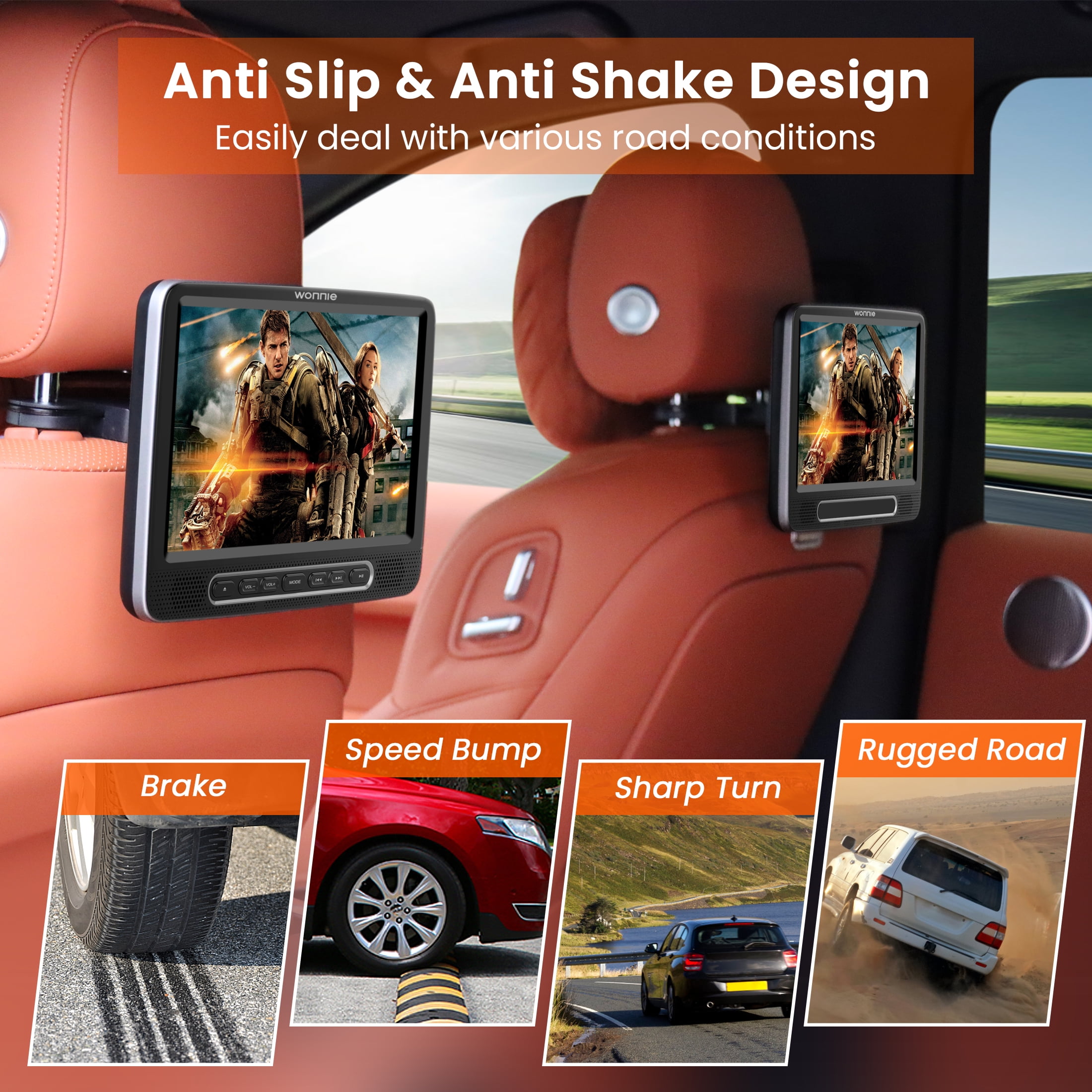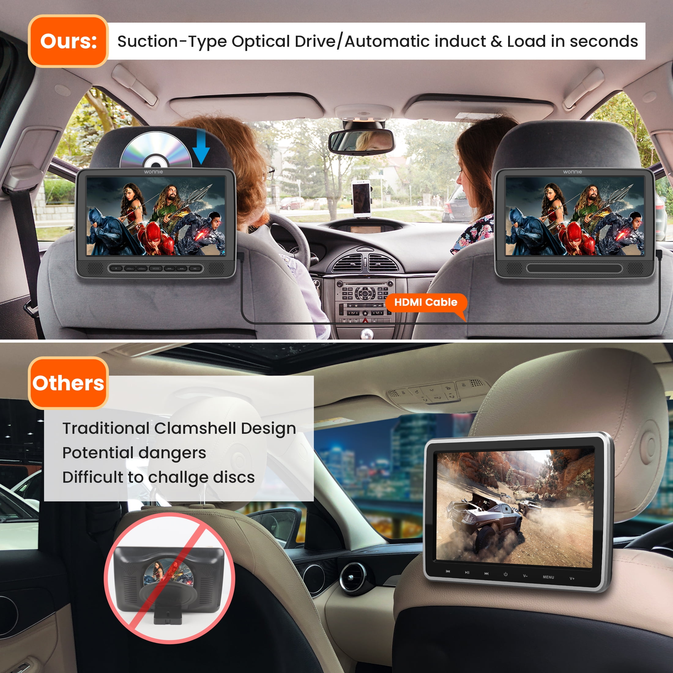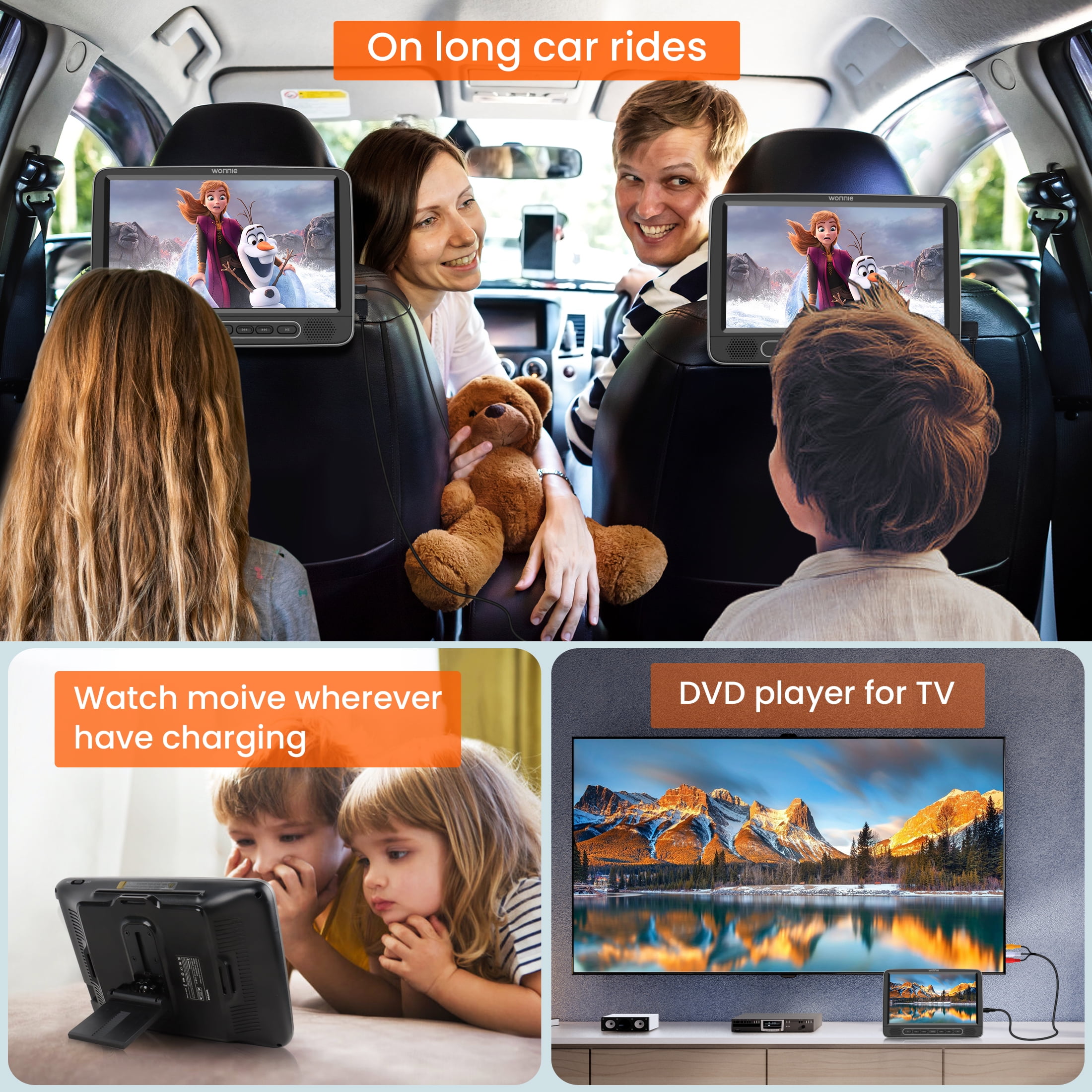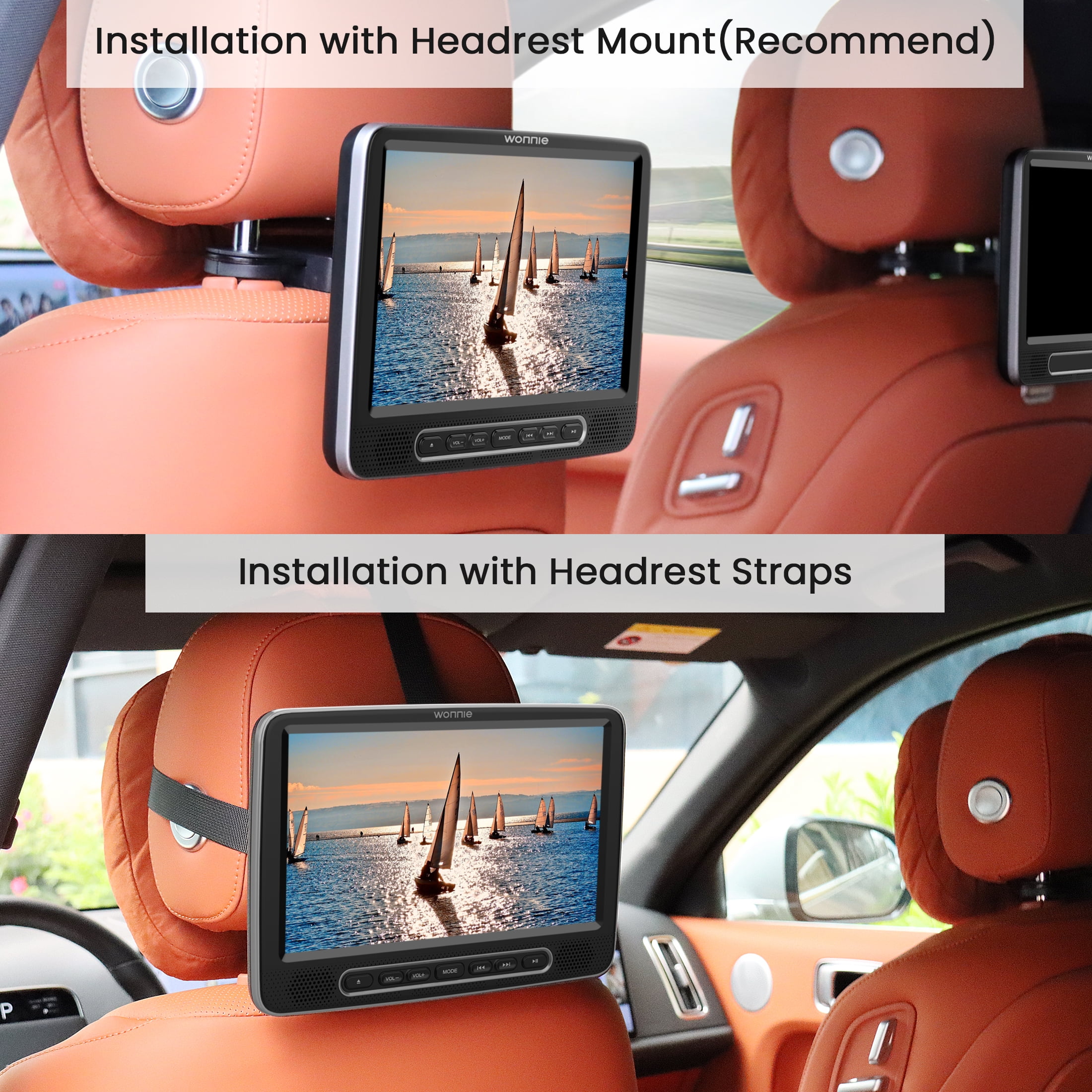 🚗【HD vision & 3s Auto Load Discs】WONNIE 10.5 inch DVD car player support 1080P HD video playback , provides clearly wide open view image to protect kids’ eyes and enhances viewing experience.The Car headrest DVD player with suction disc design is the most prominent feature among other headrest DVD players. 3s Auto Load Discs,super easy for adult on front seat or kids on back seat to change disc. It definitely brings convenience to you while on the road.