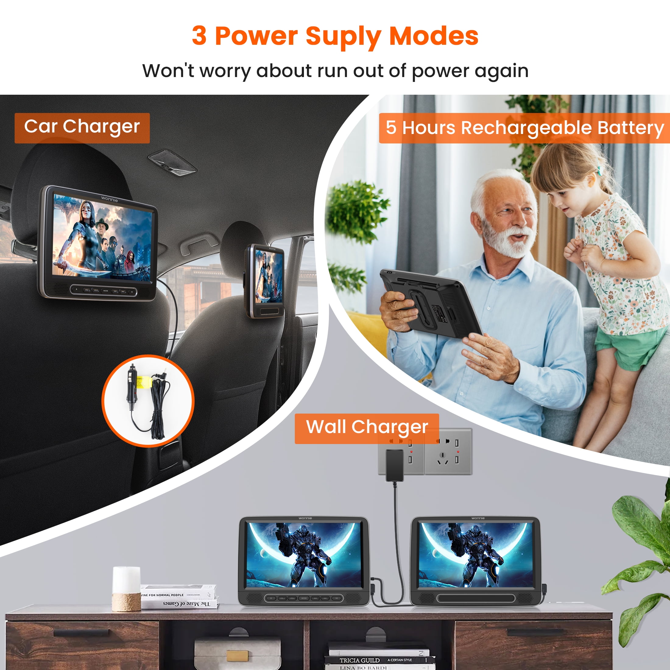 😍【Travel companion&100% Customer Service】WONNIE dual screen dvd player for kids create a happy and entertained space for backseat, makes kids enjoy themselves, eliminates children’s anxiety and restlessness because of boring, so you can drive in peace comfortably and safely.Besides, WONNIE has more than 10 years of experience in car DVD players, if you have any issue about it, please feel free to contact us, we will try our best to reply you within 24 hours and provide the best solution to ensure your profit .