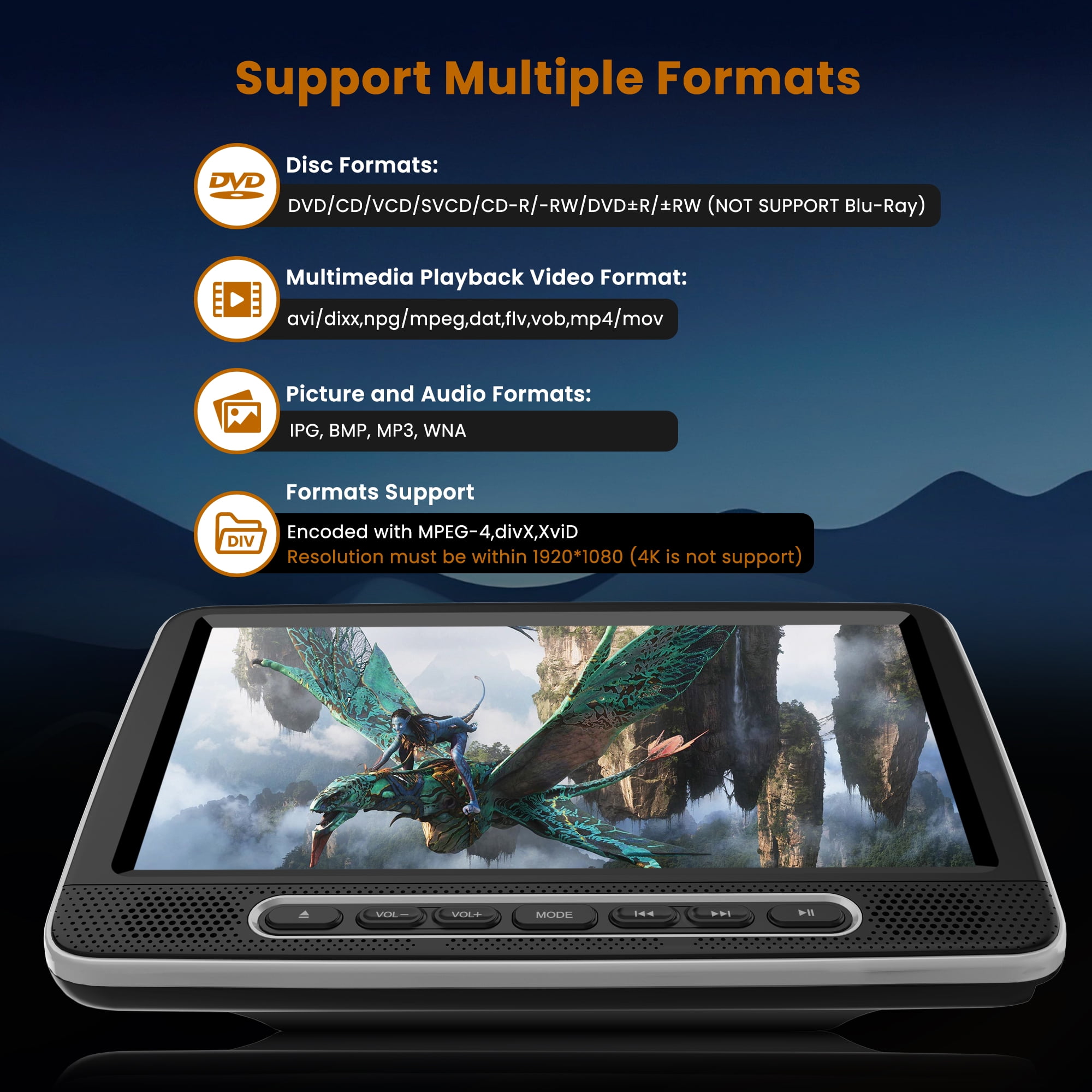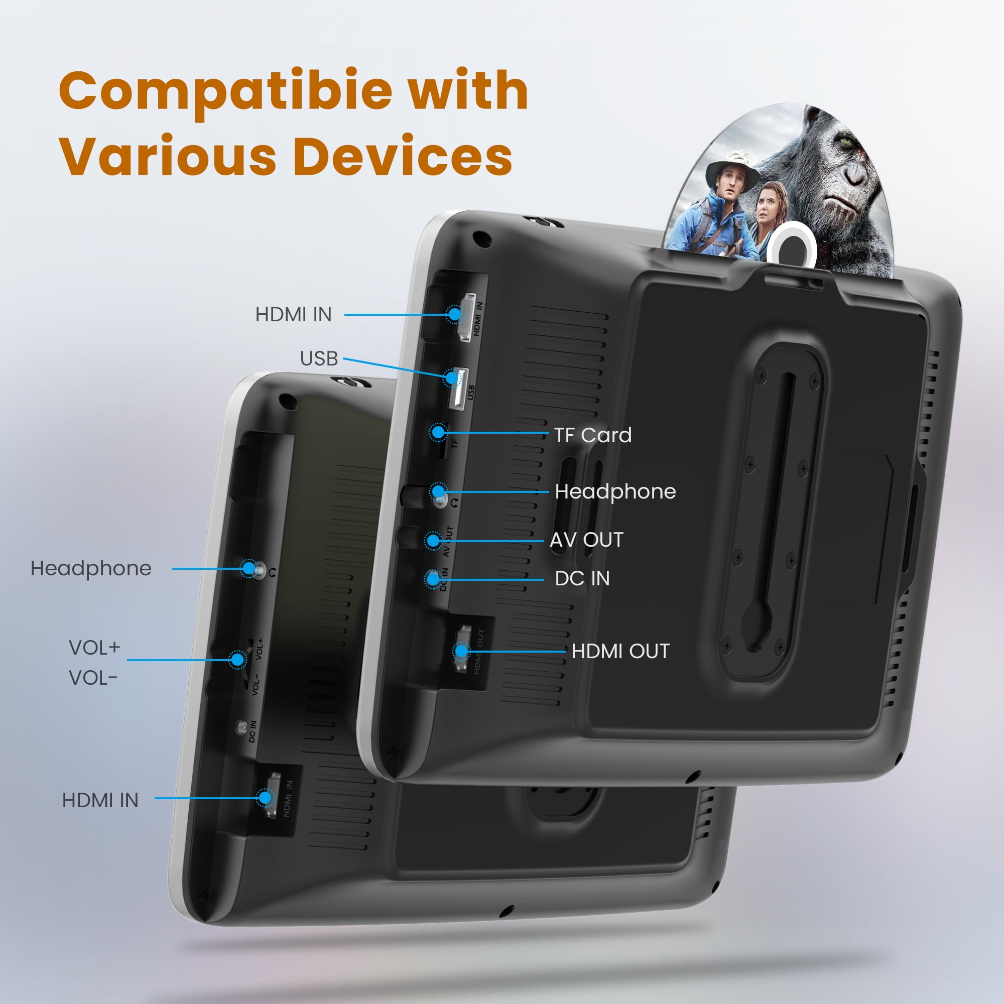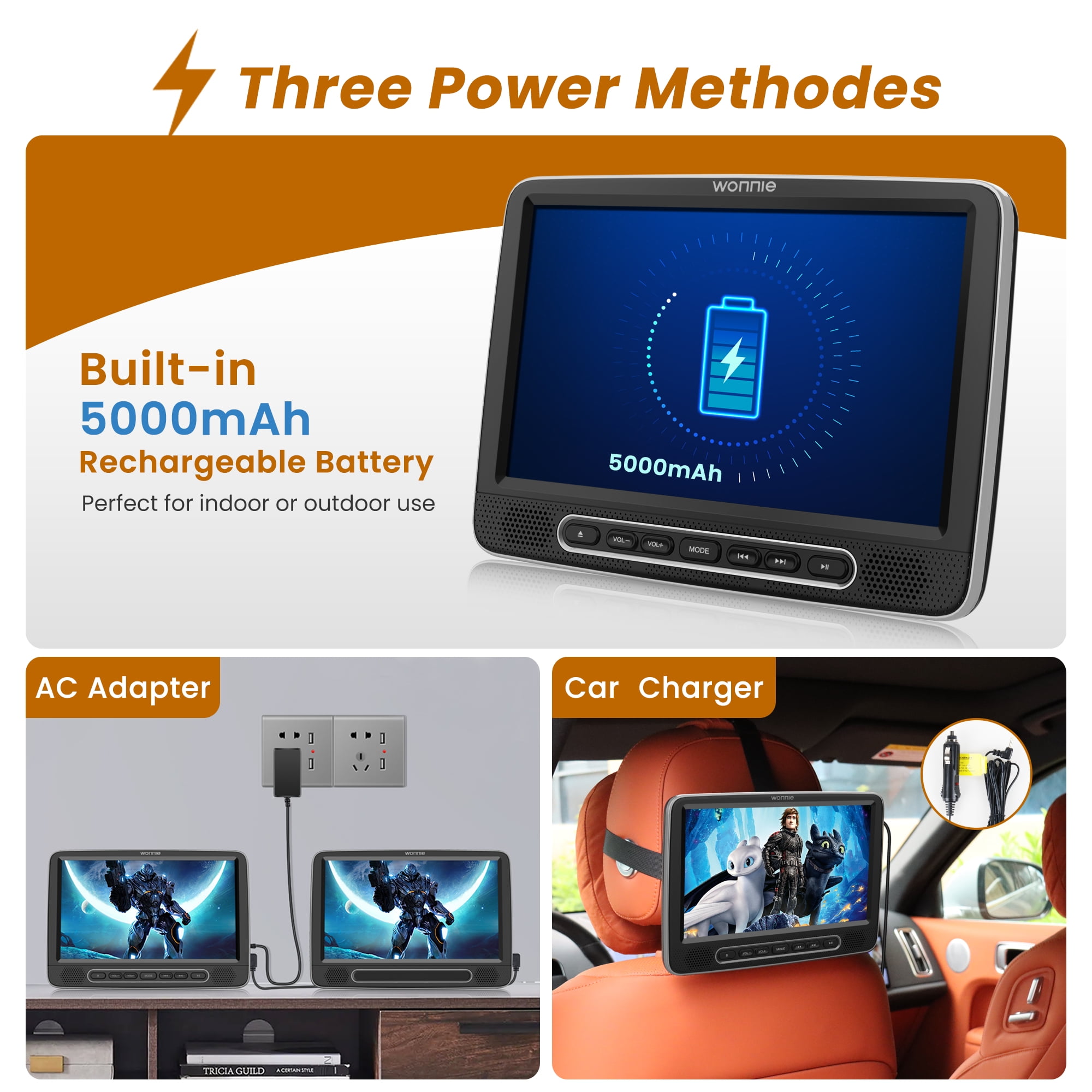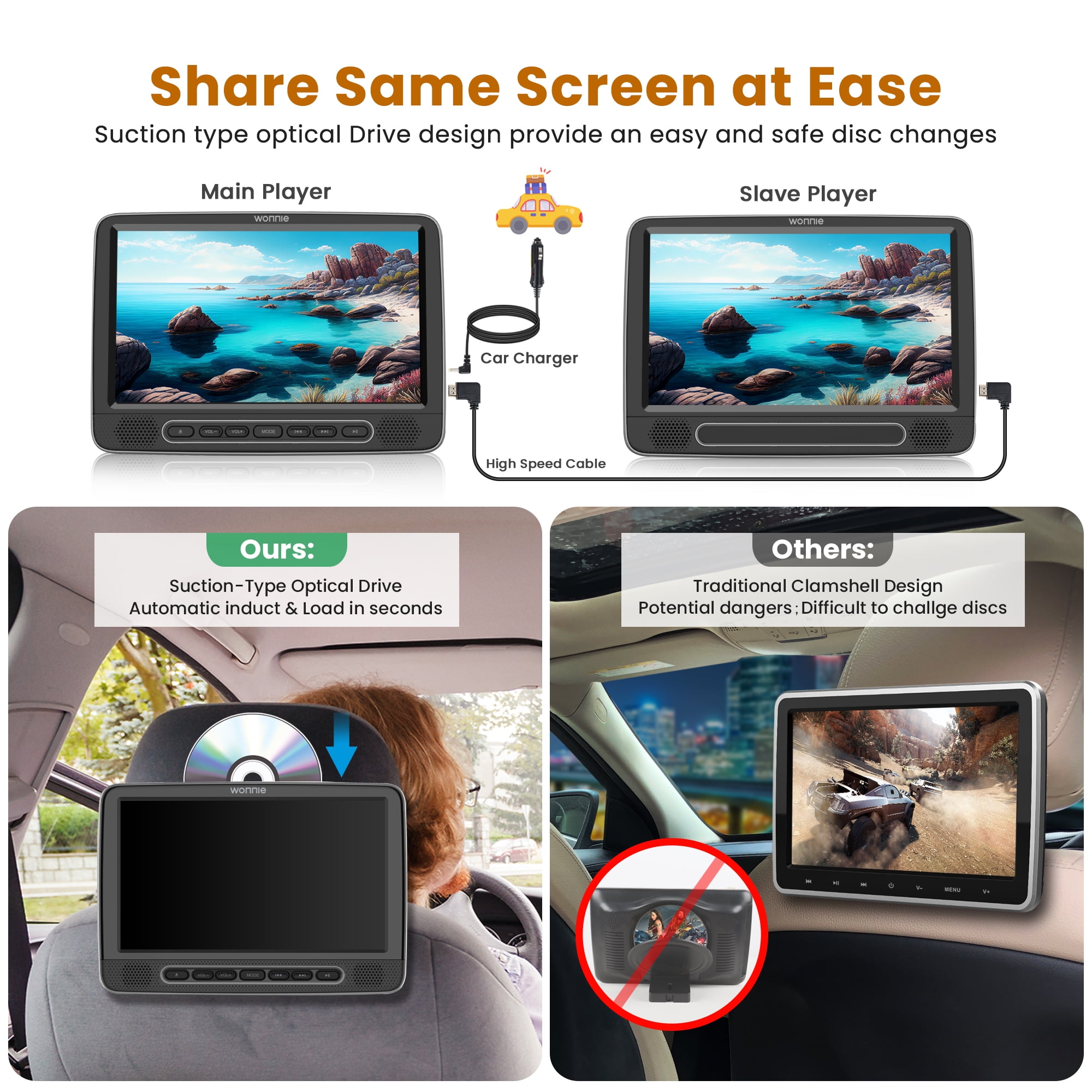 【10.5” HD Vision & Full HD Signal Transmission】WONNIE 10.5inch Dual Screen portable DVD players provides you 1920 * 1080P@60fps( others are 30fps) sharp and detailed HD images, better than other 720P car headrest DVD player. Newly adopt professional Full HD Digital Signal Transmission Technology to transmit identical AUDIO and VIDEO SIGNALS without any loss and compression to play a same movie simultaneously. 【3S Auto Load Discs & Quick Connection】The dual car DVD player for kids feature with Suction-Type Disc in design, it will automatic sucks the disc and loads in seconds,easy for adult on front seat or kids on back seat to change dics. Additionally, wonnie 10.5” dual car dvd player offer you a more easier connection than others. No need much cables , just one HDMI cable can realize the two dvd player for rear seat to play same movie soon. Time saving and easy operation. 【Long Battery Life & Dual Louder Speakers】Our portable car DVD player equipped with 5000mAh Rechargeable battery, support 3-5H continous playing. Extra included car charger and AC adapter provide a flexiable charging choices per using occasions. Besides, the hd video dvd player built in dual stereo speakers can emite a loud and clear sound. No matter you are playing the Portable Dual Car DVD Players at your home or on the car, you will enjoy a great watching and listening experience. 【HDMI Input & Sync TV】 WONNIE car headrest dvd player with HDMI input function makes it can sync up to 1080P video from phones, computers, Raspberry Pi, Xbox or kindle fire etc.(Pls. confirm your phone supports HDMI output before ordering), comes with AV out interface design supports to sync to your home TV to enjoy a bigger screen with your whole family. 【Wide Compatibility & Perfect stability】 Our headrest DVD player for car owns wide compatibility and can play free regions discs from CD, DVD,CD±R, DVD±R, DVD±RW, VCD to SVCD (but not Blu-Ray DVD). USB/SD card supports playing MP3,WMA,VOB,AVI,DAT,MPEG4,MPG,JPG,JPEG (max to 32GB FAT32 & 1920*1080 pixel). besides, with having portable dvd player headrest mount brackets, you can quick fixing the dvd player firmly without no shaking or droping in the car even driving on a hard road