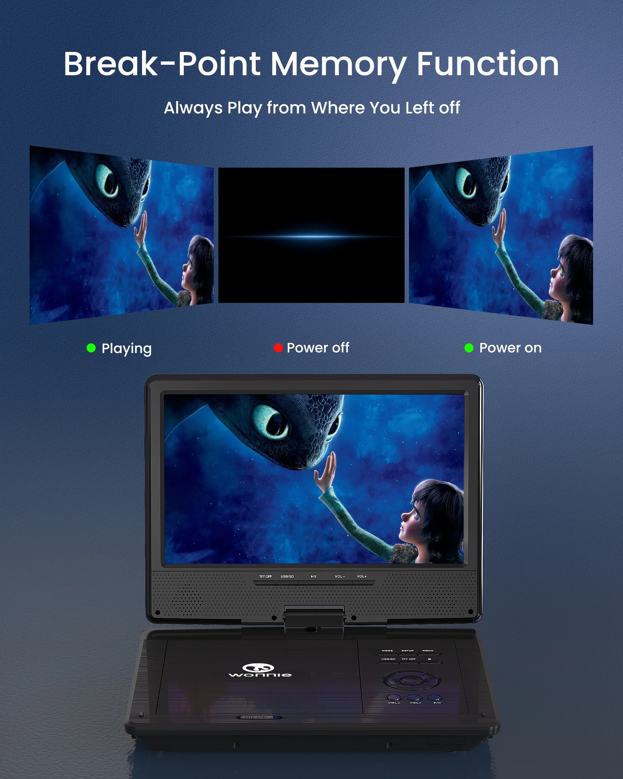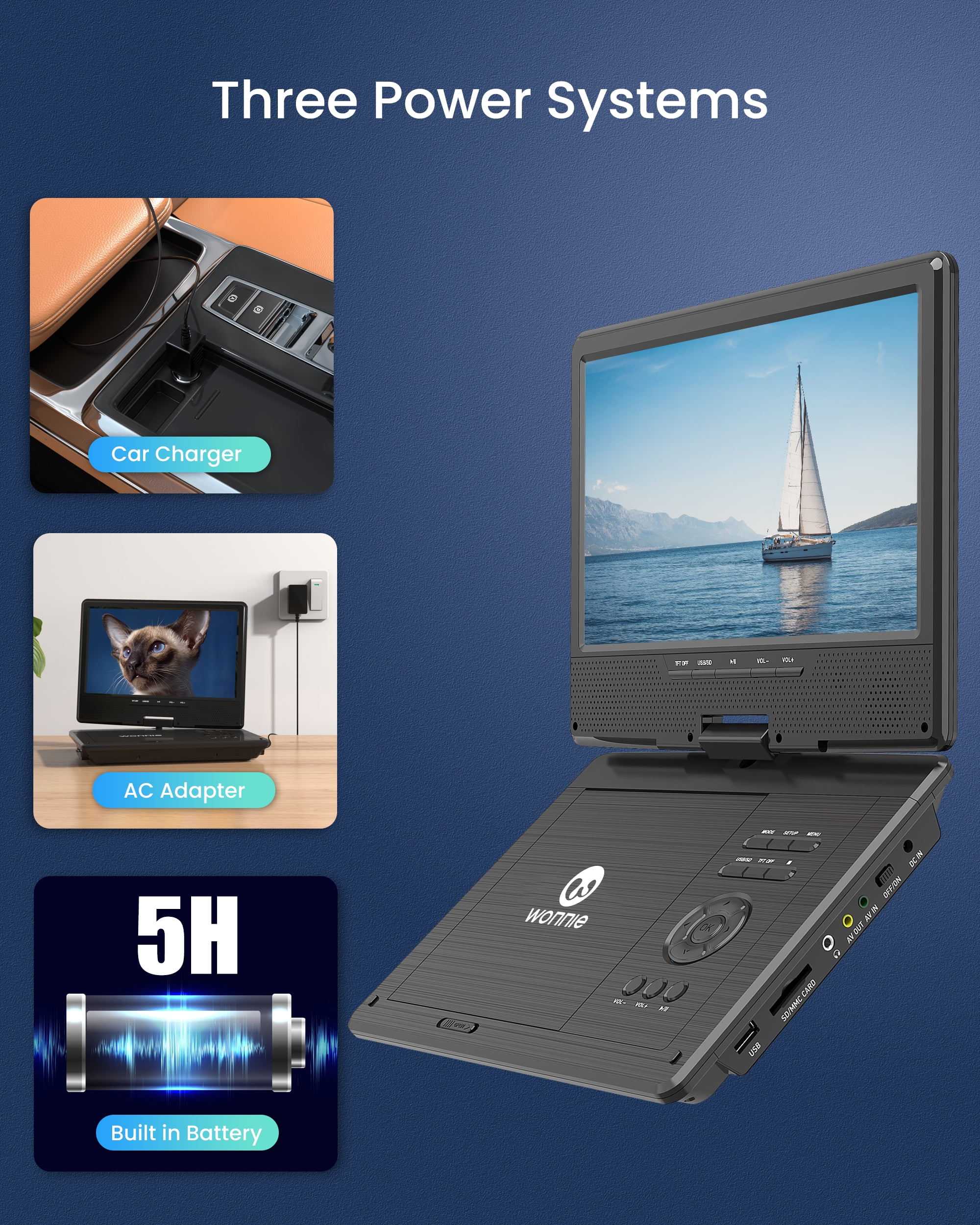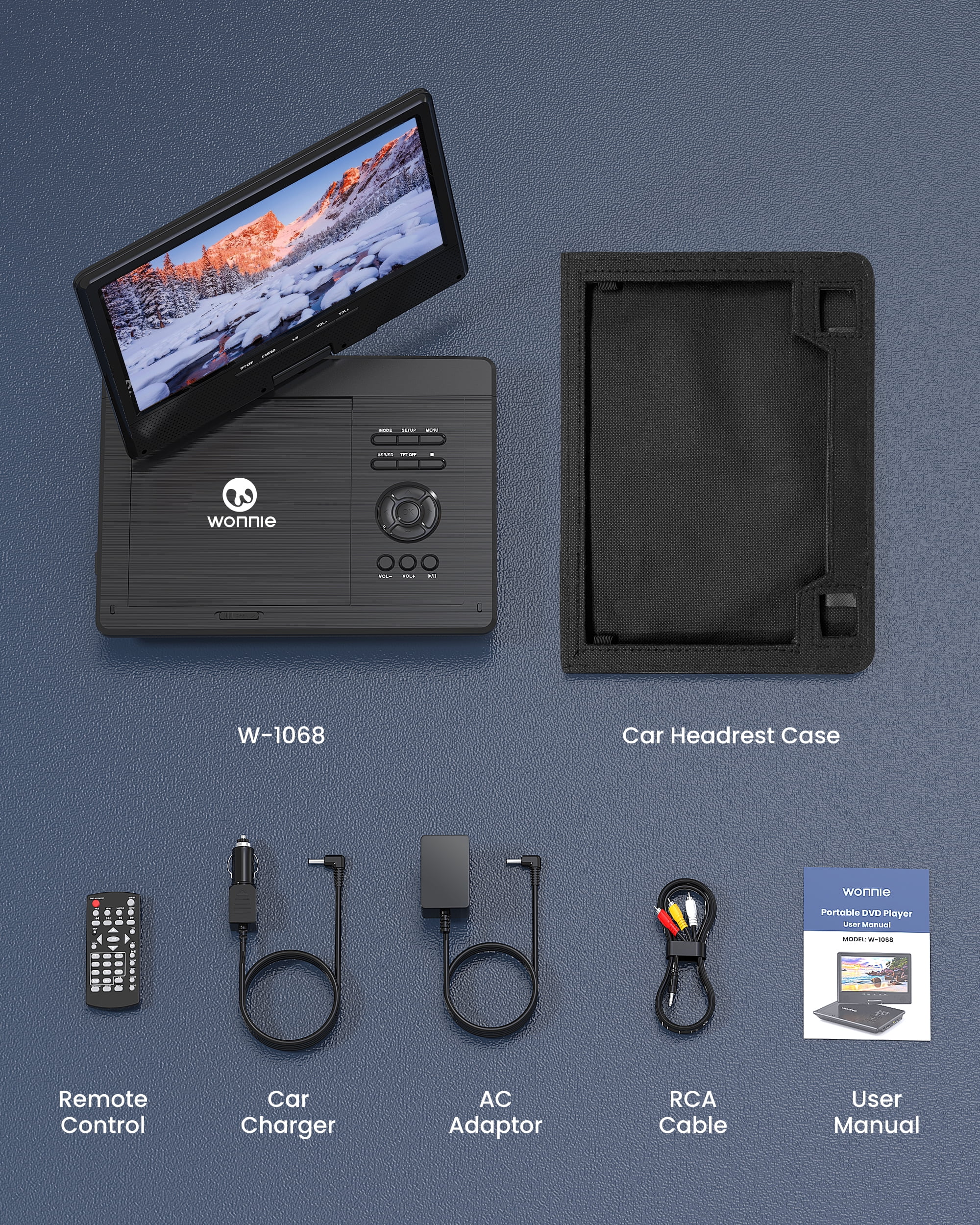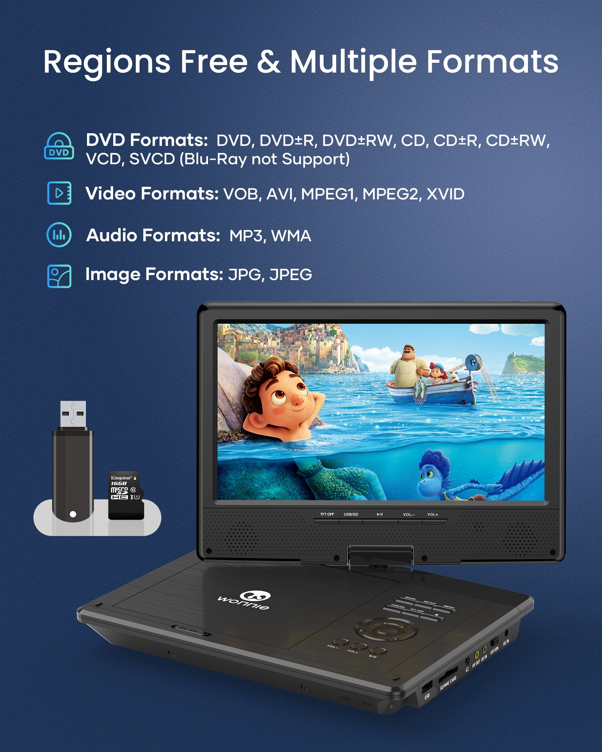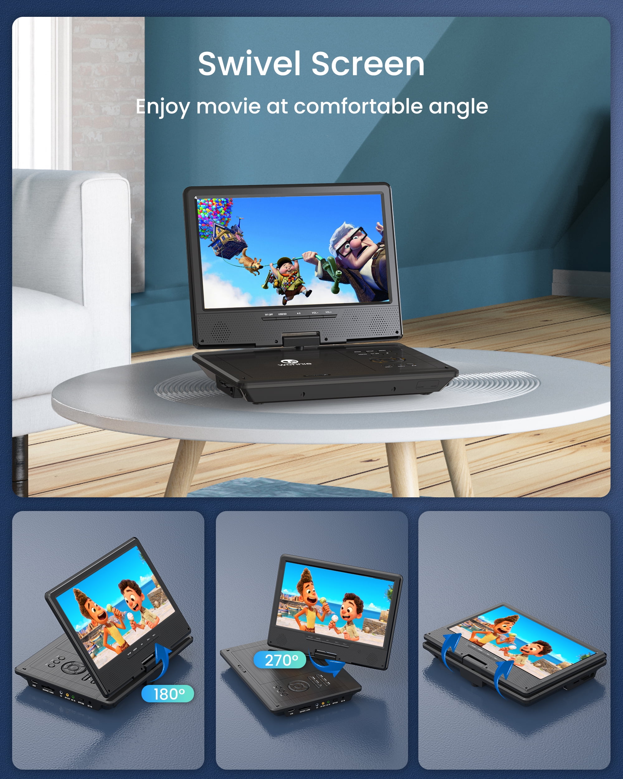 This portable DVD player with a 1024 x 600 high-resolution screen, supports 270 degrees rotation and 180 degrees flip, you can adjust the screen at the most comfortable view anglerelieve eye strain. Also can be easily & firmly mounted to the car headrest by the customized car headrest case included Built-in high-capacity rechargeable battery, the WONNIE 12.5-inch portable DVD player for the car ensures 5 hours of long-lasting movie time after a full charge. The car DVD player is also equipped with a car charger and AC adapter, allowing children to engage in the long-lasted movie time, bringing you a pleasant car trip The DVD player portable adopts a unique button design. You can not only use a remote but also press buttons under the screen to control the portable DVD player. Make it more convenient for you & your kids to use in the car This DVD player for cars can play free regions discs from CD, DVD, CD-R/RW, DVD -R/+R, DVD+RW/-RW, VCD, SVCD (RW), CD-R (RW) (Except Blu-ray disc & MP4). Design with USB & SD (Max to 32 GB FAT32 and 720 x 576 pixels), you could play pictures (JPG, JPEG), audio (MP3/ WMA), videos (VOB, AVI, MPEG 1, MPEG 2, XVID, MPG, 3GP, DAT) WONNIE portable DVD player is specially designed with upgraded dual power speakers, making sound louder and clearer. The portable DVD player for kids also has a 3.5 mm earphone jack that you can plug in headphones to immerse in the audio feast. The break-point memory function allows a portable DVD player with a screen to pick up each exciting scene from where you left off last time With the AV In/Out function, you can connect the car headrest DVD player to the TV via RCA cable included, share movies on a large screen with the whole familyenjoy the home theater viewing experience. Also can sync playback to other DVD players via AV cable includedenjoy favorite cartoon time with close friends