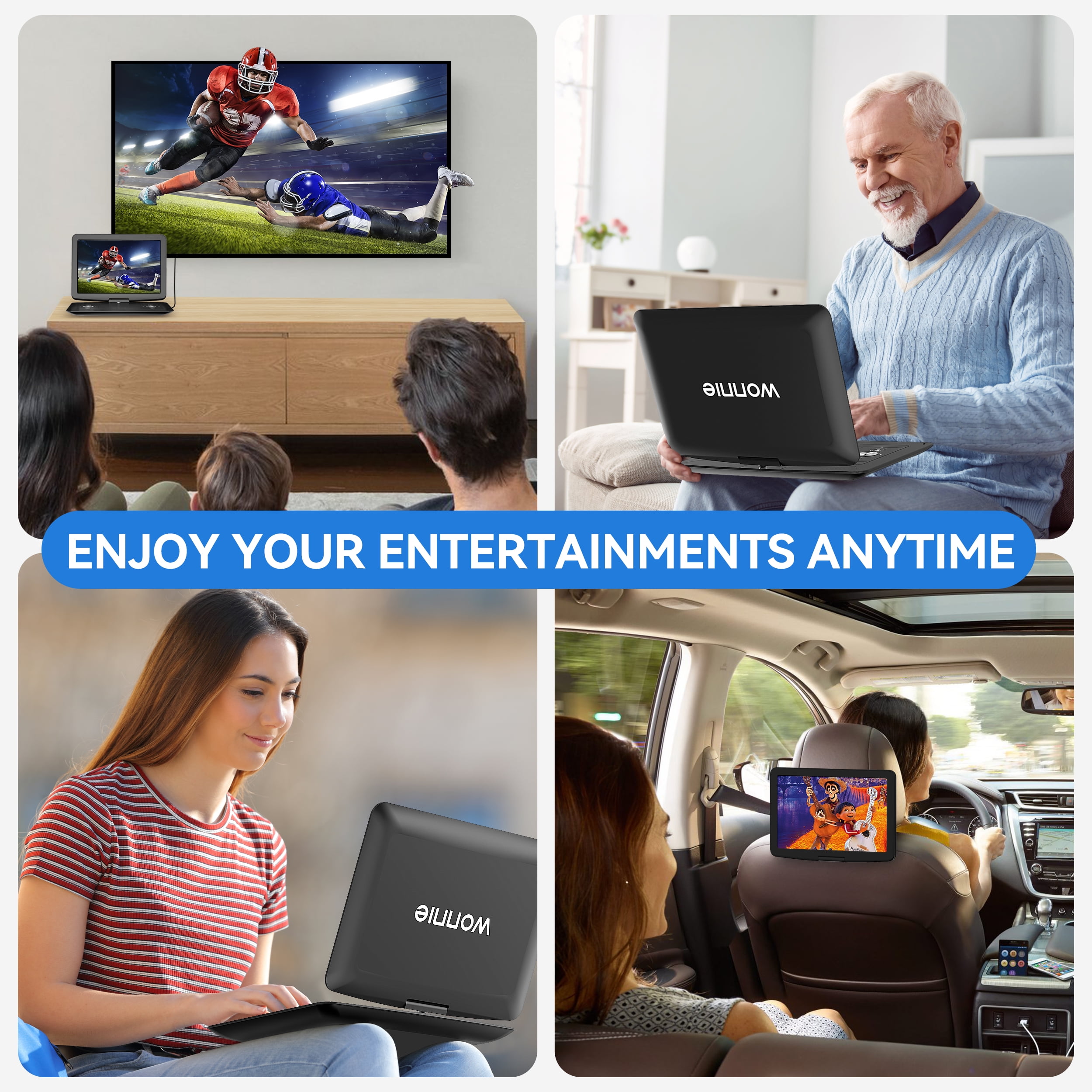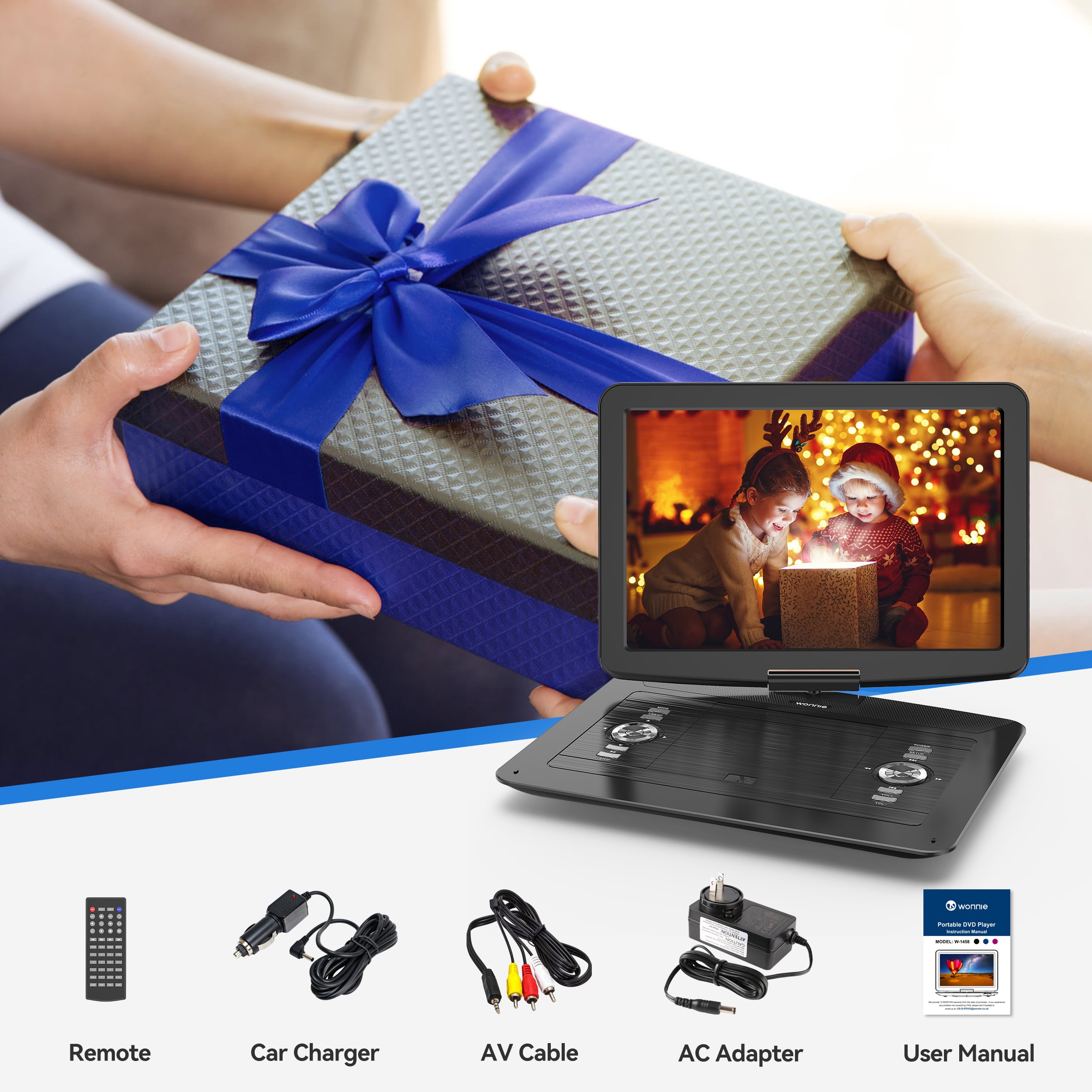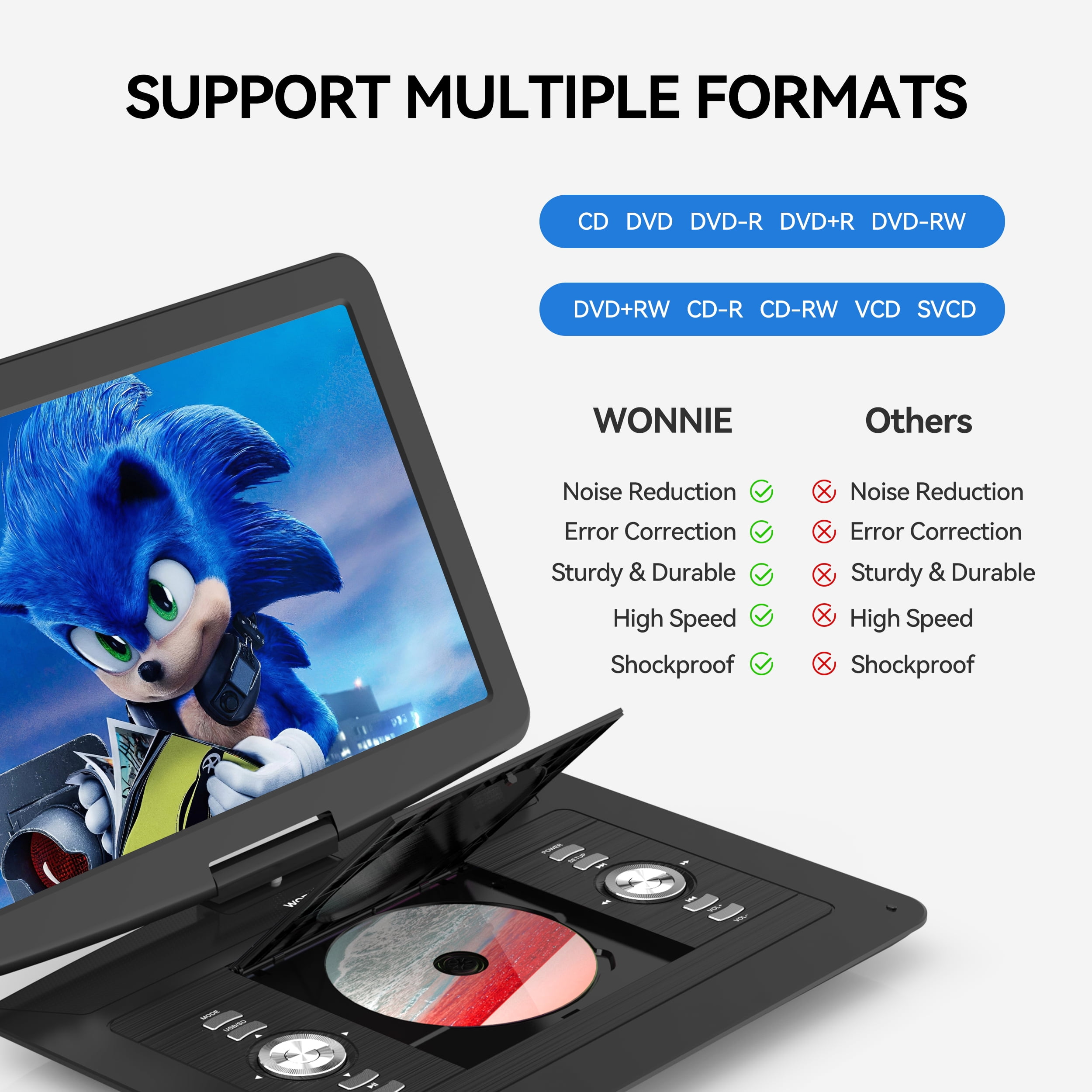 【Swivelable HD Screen】WONNIE 2024 New Updated 17.9” Full size and inner 15.4” widescreen with HD resolution 1024×800 give you clear viewing and 1366*768 TFT LCD with its 270° rotation and 180° flip feature, providing a more comfortable viewing experience and relieving visual fatigue from prolonged movie watching. 【5 Hour Rechargeable Battery】The portable DVD player has a built-in durable and safe Li-polymer rechargeable battery that allows about 5 hours. This personal DVD player is equipped with a certificated AC adapter and car charger, ensuring you can use it for longer anytime, anywhere. 【Dual Powerful Stereo Speakers】The portable video player has built-in two powerful stereo sound speakers and a headphone jack design that will give you a powerful new listening experience. You can enjoy leisure and a happy time with family and friends. You can also adjust the volume through the remote controls and connect wired earphones/headphones or speakers for a clear and loud sound. 【Sync Screen & Last Memory Function】You can sync the screen to a TV or projector for larger watching views with provided RCA cable. The portable DVD player with large screen has built-in Last Memory, you will always start from where you left off. No need to worry about replaying from the beginning, the fun can continue! 【100% Customer Service】We provide fas reply within 24 hours and full refund within 30 days. Whenver you have issue, feel free to contact us, we have the professional customer service team,your any issue will get our best solution soon .