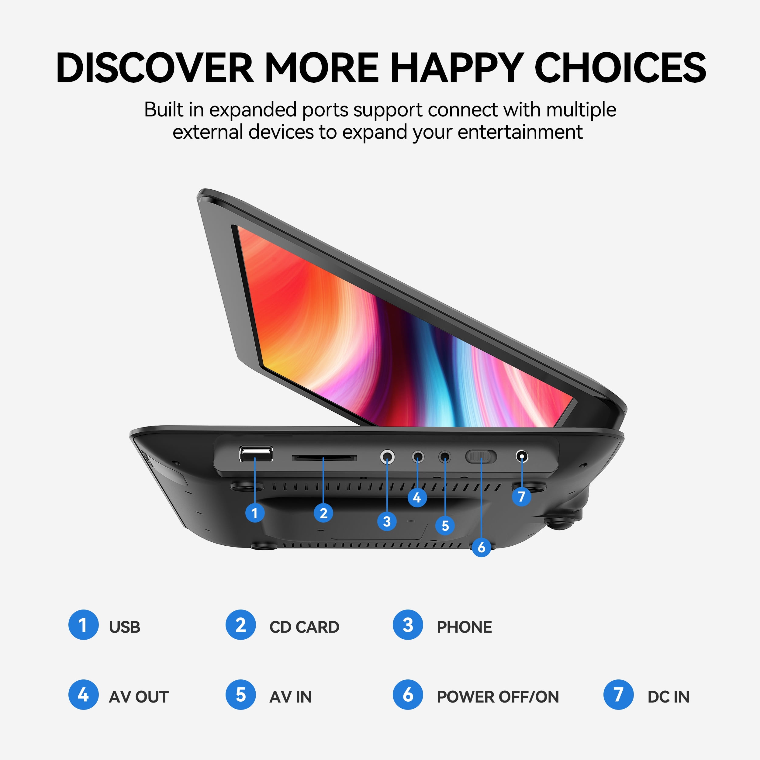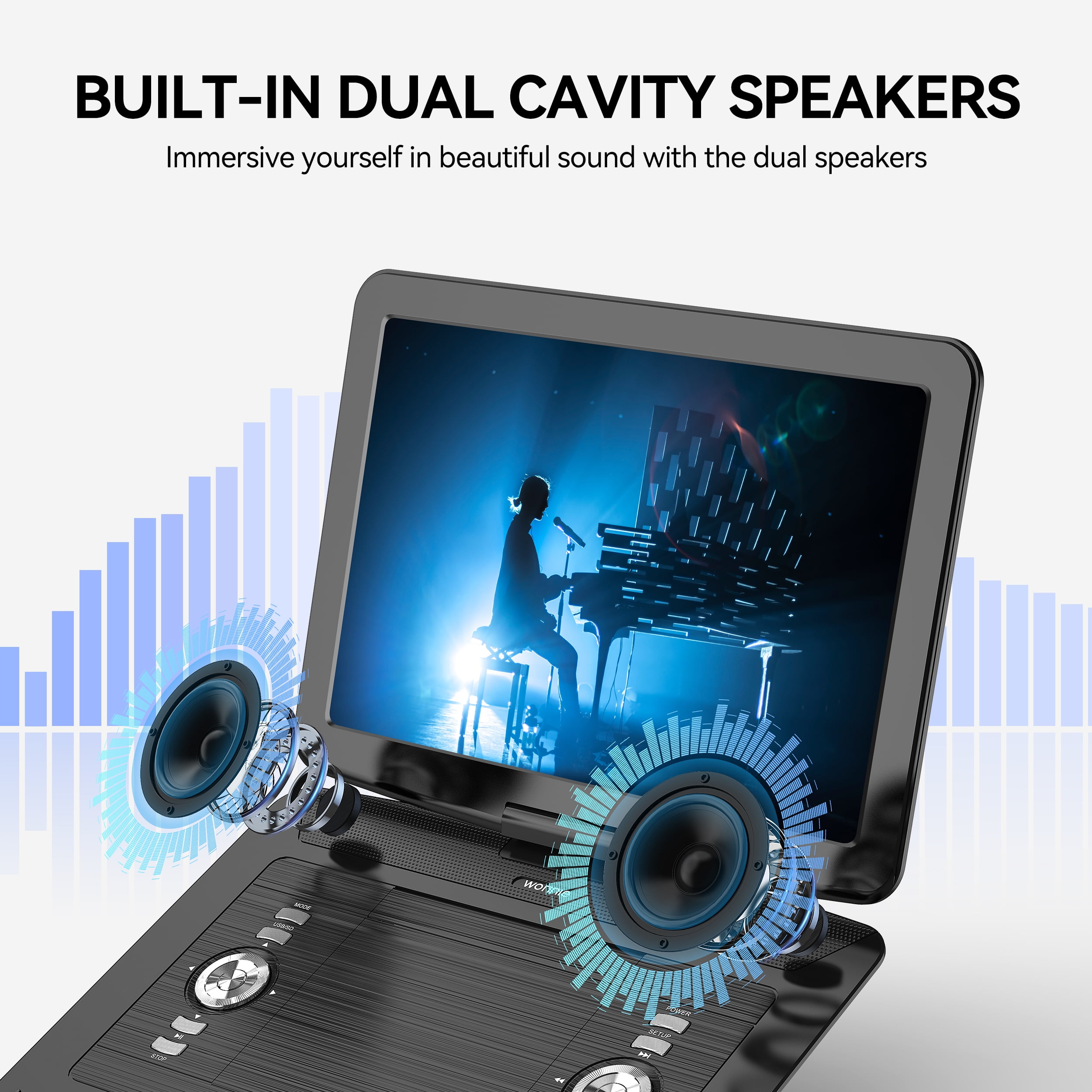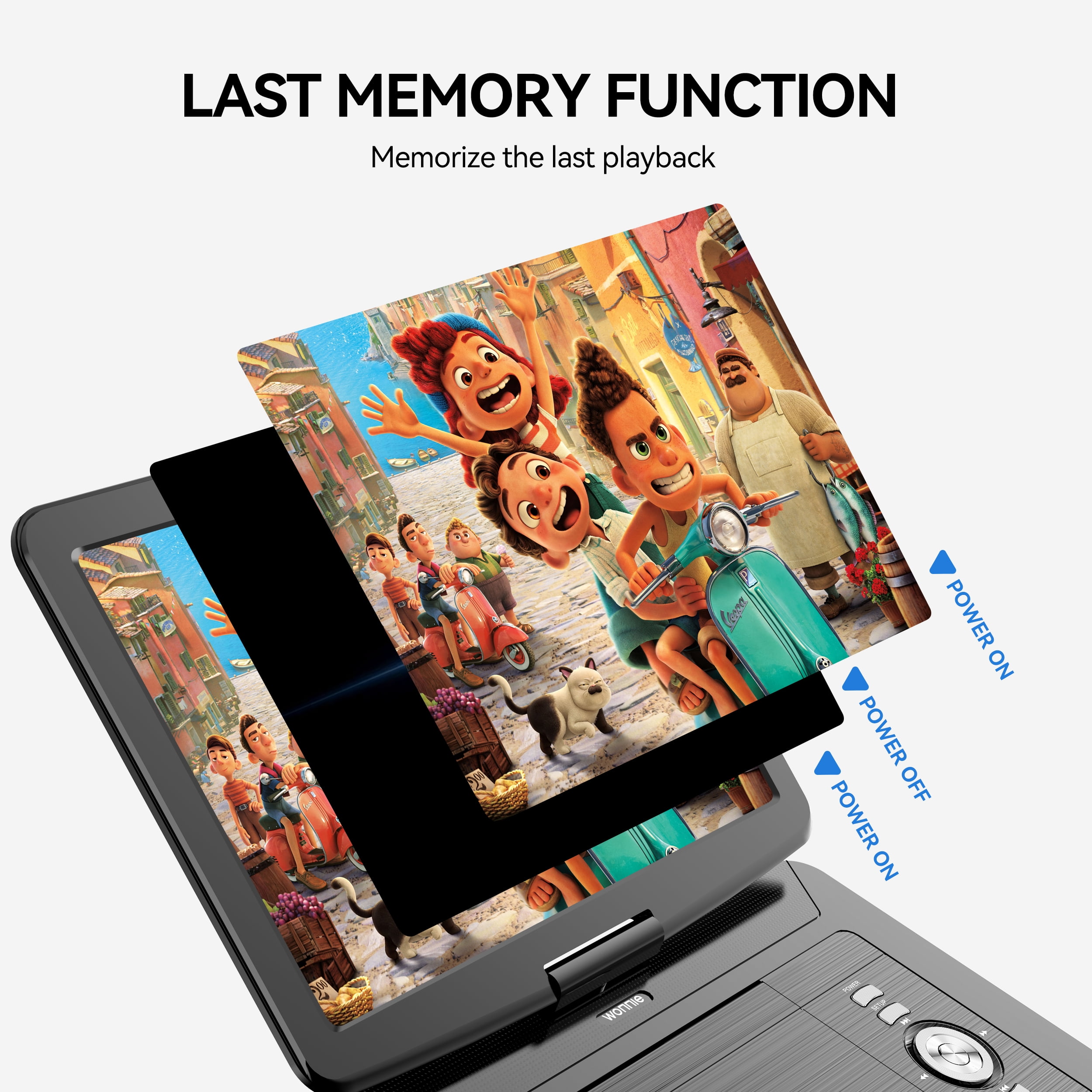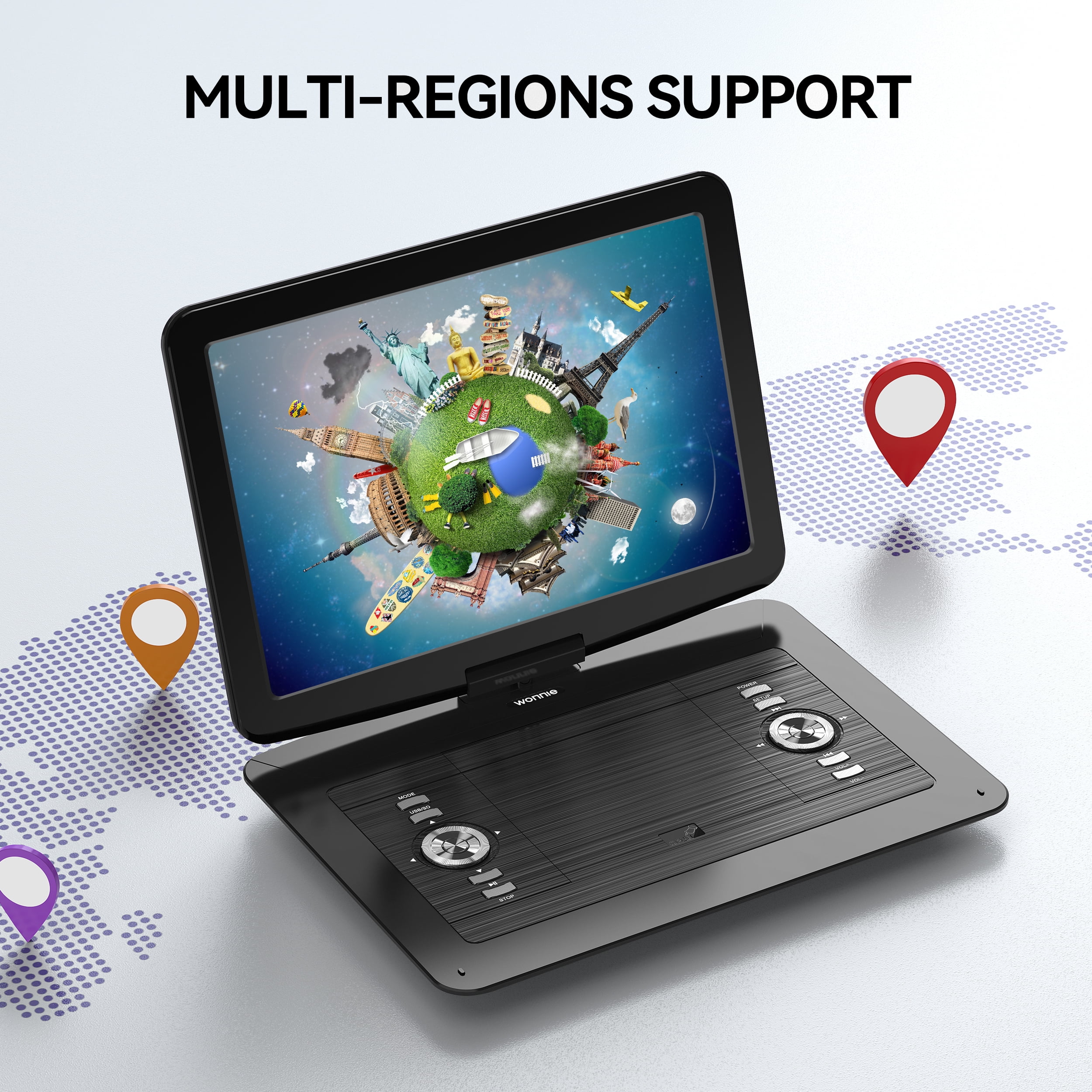 【Swivelable HD Screen】WONNIE 2024 New Updated 17.9” Full size and inner 15.4” widescreen with HD resolution 1024×800 give you clear viewing and 1366*768 TFT LCD with its 270° rotation and 180° flip feature, providing a more comfortable viewing experience and relieving visual fatigue from prolonged movie watching. 【5 Hour Rechargeable Battery】The portable DVD player has a built-in durable and safe Li-polymer rechargeable battery that allows about 5 hours. This personal DVD player is equipped with a certificated AC adapter and car charger, ensuring you can use it for longer anytime, anywhere. 【Dual Powerful Stereo Speakers】The portable video player has built-in two powerful stereo sound speakers and a headphone jack design that will give you a powerful new listening experience. You can enjoy leisure and a happy time with family and friends. You can also adjust the volume through the remote controls and connect wired earphones/headphones or speakers for a clear and loud sound. 【Sync Screen & Last Memory Function】You can sync the screen to a TV or projector for larger watching views with provided RCA cable. The portable DVD player with large screen has built-in Last Memory, you will always start from where you left off. No need to worry about replaying from the beginning, the fun can continue! 【100% Customer Service】We provide fas reply within 24 hours and full refund within 30 days. Whenver you have issue, feel free to contact us, we have the professional customer service team,your any issue will get our best solution soon .