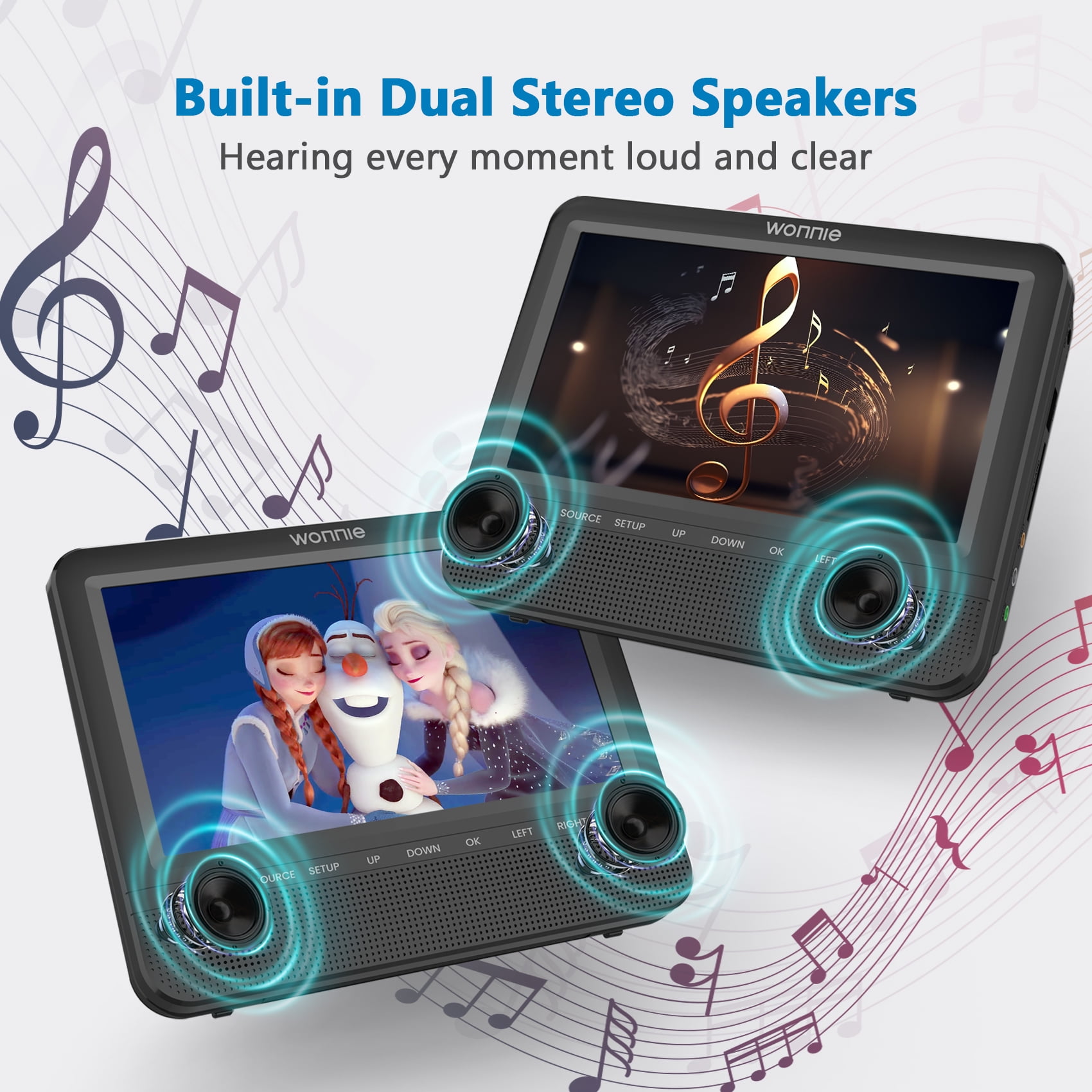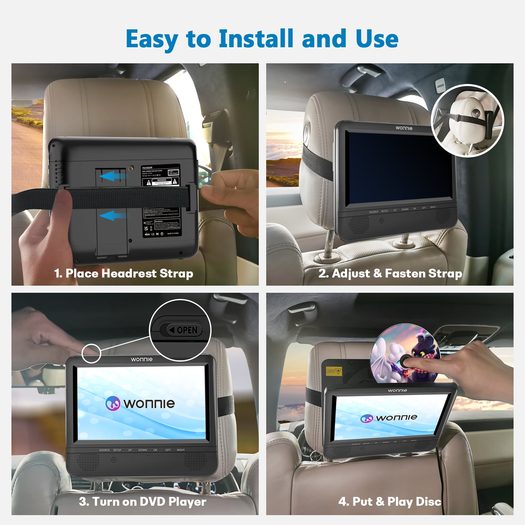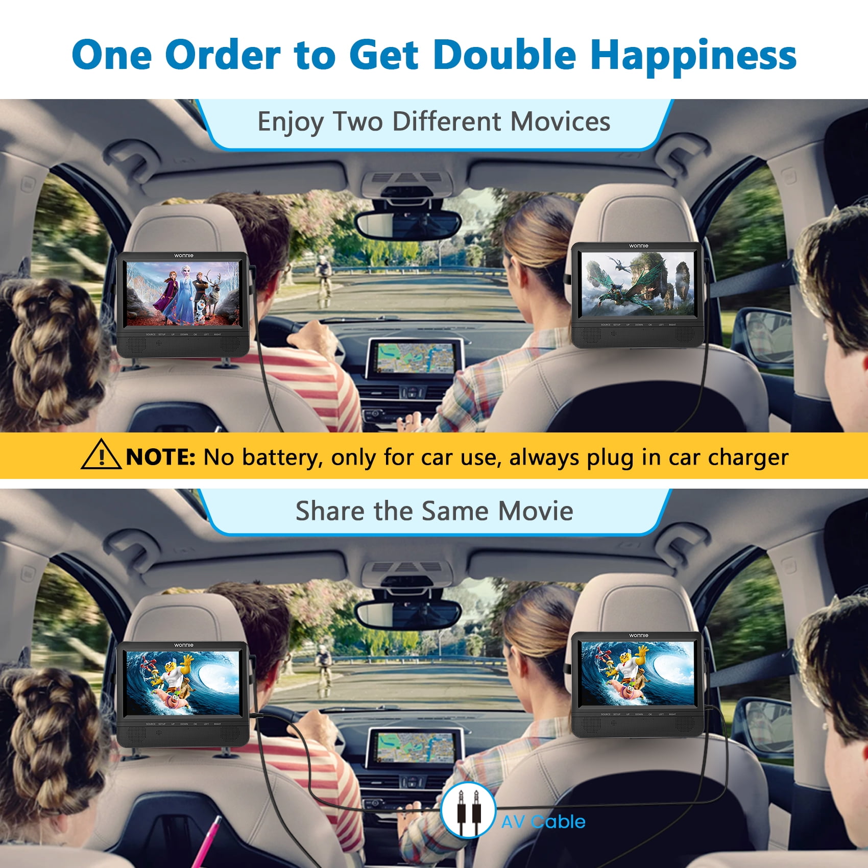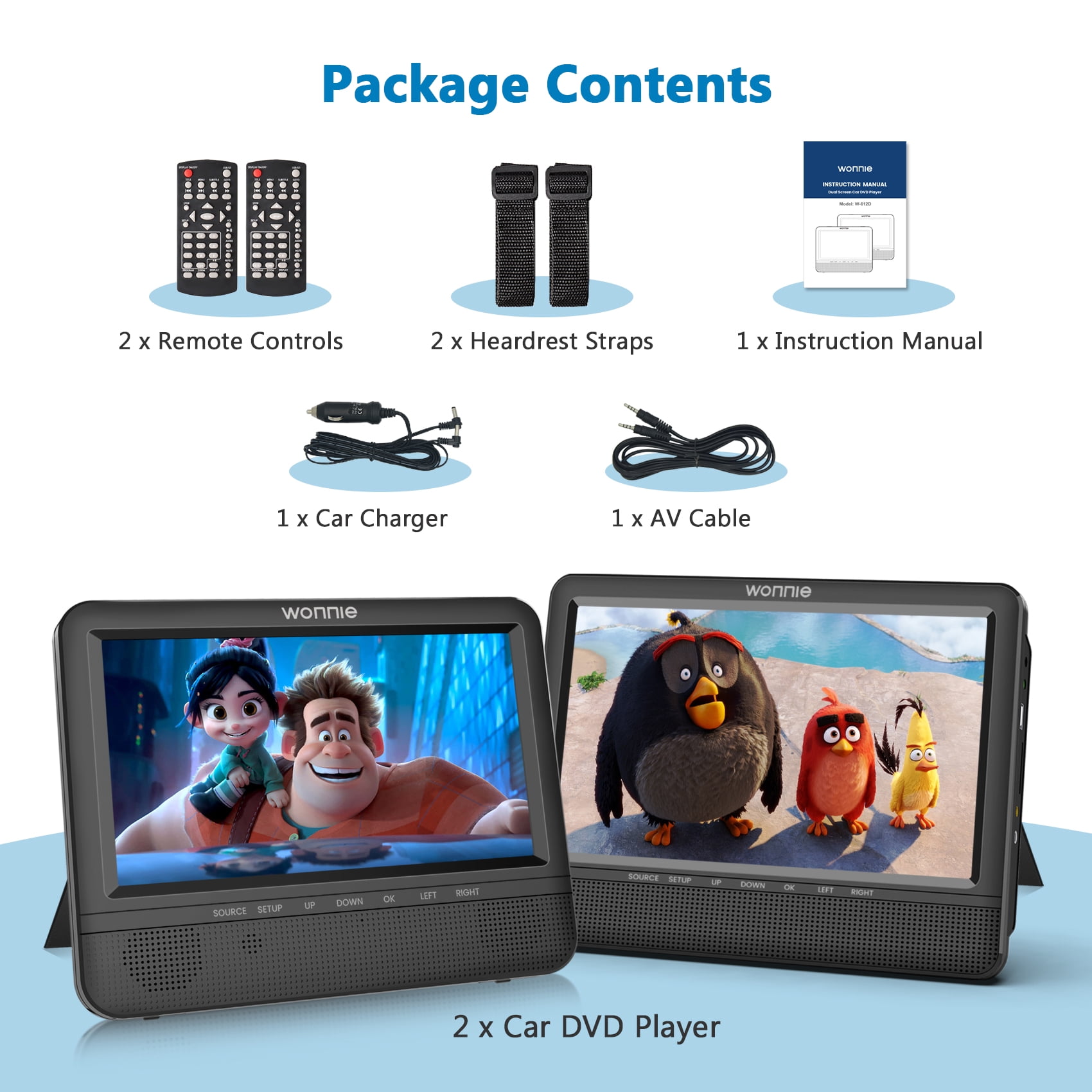 ⛱️【Dual Portable DVD Player】 WONNIE 7″ dual portable DVD players give you Clearer HD Images, support playing different movies for two kids or playing the same movie via AV cable connection. (Equipped with 2 IN 1 high quality car charger, only use for car, without built-in battery) 🚕【Small But Powerful】 WONNIE headrest car DVD player with upgraded dual front stereo speakers not only provides clear sound and stereo sound effects, but also prevents the sound from disturbing the driver and front passenger. The volume can be adjusted individually from the player or the remote control. Each player has a headphone jack and has a last memory function to ensure that each time you can continue watching from where you last left off, so the kids won’t miss any of the action. 🚕【Wide and Friendly Compatibility】 WONNIE dual screen car DVD player supports playback of multiple formats.①DVD Formats: DVD, DVD+R, DVD-R, DVD+RW, DVD-RW, CD, CD+R, CD-R, CD+RW, CD-RW, VCD, SVCD (Blu-Ray not Support). ②Video Formats: VOB, AVI, MPEG1, MPEG2, XVID. ③Audio Formats: MP3, WMA. ④Image Formats: JPG, JPEG. ⑤ Supports up to 32GB USB/SD card to play music and movies (Maximum resolution cannot exceed 720*576 pixels ) 🚕【Easy to Carry and Install】 WONNIE portable headrest DVD player is a lightweight design with two customized headrest straps, takes less than two minutes to install, requires no tools, and can be easily moved to another backseat or vehicle. ❤️【Excellent customer service】 WONNIE 7 inch dual screen DVD player is specially designed to be used only in the car, provide 90 days free return service, so that you can enjoy the safety of the pleasant long-distance travel, if you encounter any problems in the process of use, please feel free to contact us, we will try our best to give you a reply within 24 hours, and provide the best solution to ensure your profit.