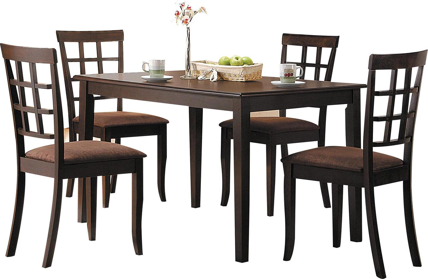 Wood and Fabric Side Chairs With Open Grid Pattern Back, Espresso Brown, Set Of 2- Saltoro Sherpi This set of 2 lovely Dining Side Chairs will be a great addition to your casual contemporary dining ensemble. The chairs have high back with an open grid pattern for a distinctive style, above sleek square tapered legs. Crafted of solid hardwood finished in an espresso brown, the chair features a padded seat covered in soft dark brown colored microfiber that adds to the comfort and durability of this chair. Use these chairs to complete your warm and inviting dining room ensemble. Dimensions: 36in height.