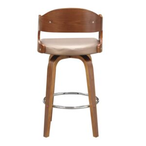 The simple mid-century design of this barstool is a gem not to be missed. Featuring curved wood, this counter height barstool is guaranteed to make a statement in your kitchen or any living space. The back and seat-cushion have been beautifully upholstered with copper faux leather that defines the very essence of style. Designed with care, this wooden dining chair features sturdy construction and a footrest to reinforce its strength. Don t forget that the seat swivels 360 degrees.