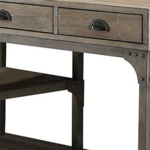 Wood And Metal Desk With Three Drawers And Two Side Shelves, Oak Brown And Gray- Saltoro Sherpi Add a stimulating industrial flair to your home office with this writing desk. Designed with versatility and style, this desk will blend masterfully in your office work space as well. Carefully constructed with selected engineered wood and veneers in Weathered Oak brown Finish, this has a contrasting metal base in antique silver gray finish giving this piece a industrial and sleek appeal. This desk also includes three top drawers with cup handles and two side shelves to allow you to organize paper files or important office treasures in one go. Does not include any featured product other than one desk only.