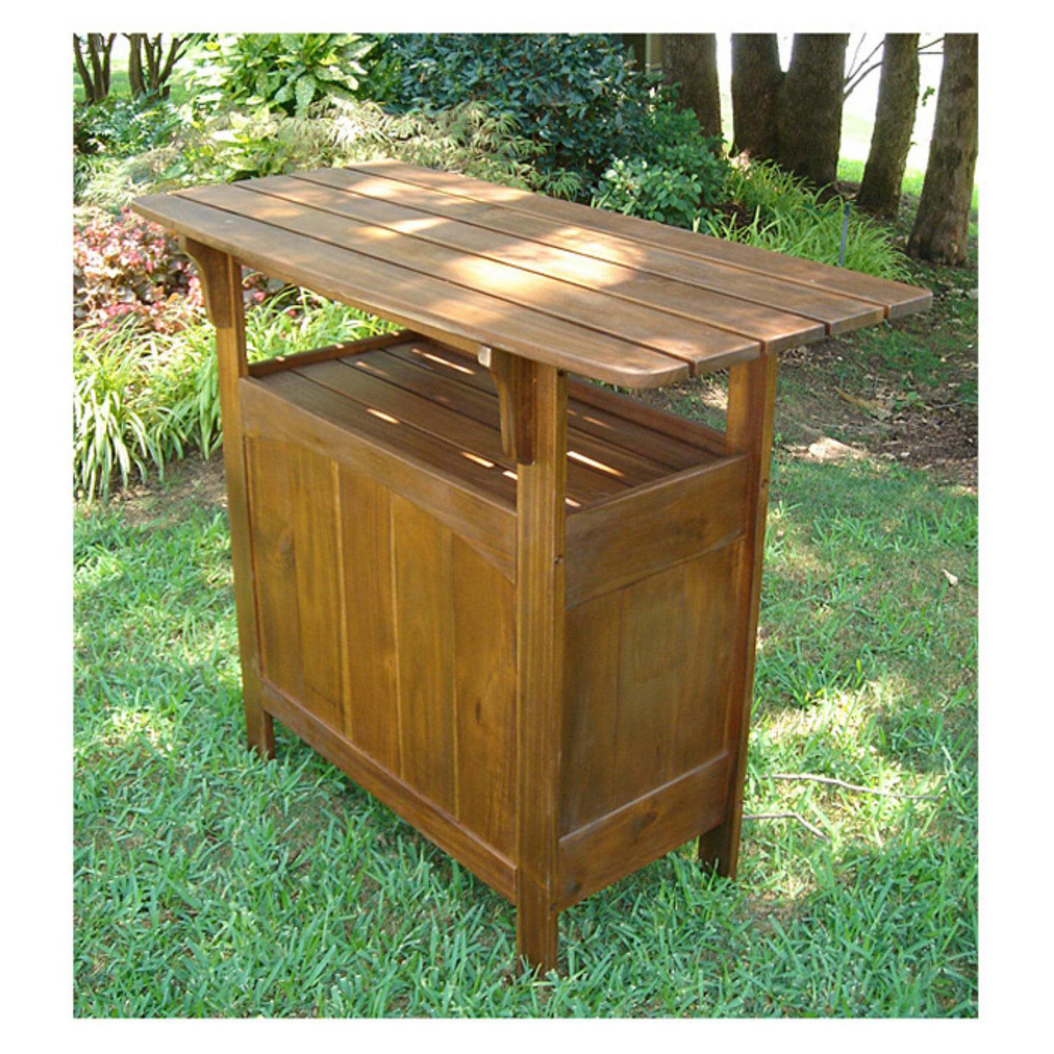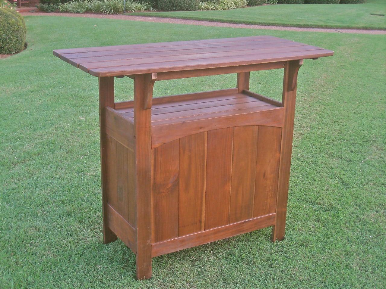 Made from solid Acacia hard wood with a brown oil stain finish that gives it a classic natural wood look. Has a large top surface area for serving. Comes with three shelves for storage with one that is exposed.