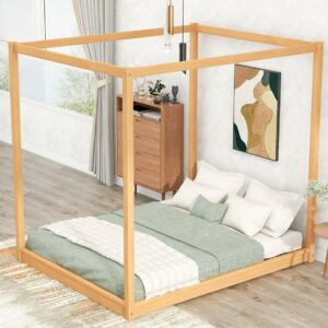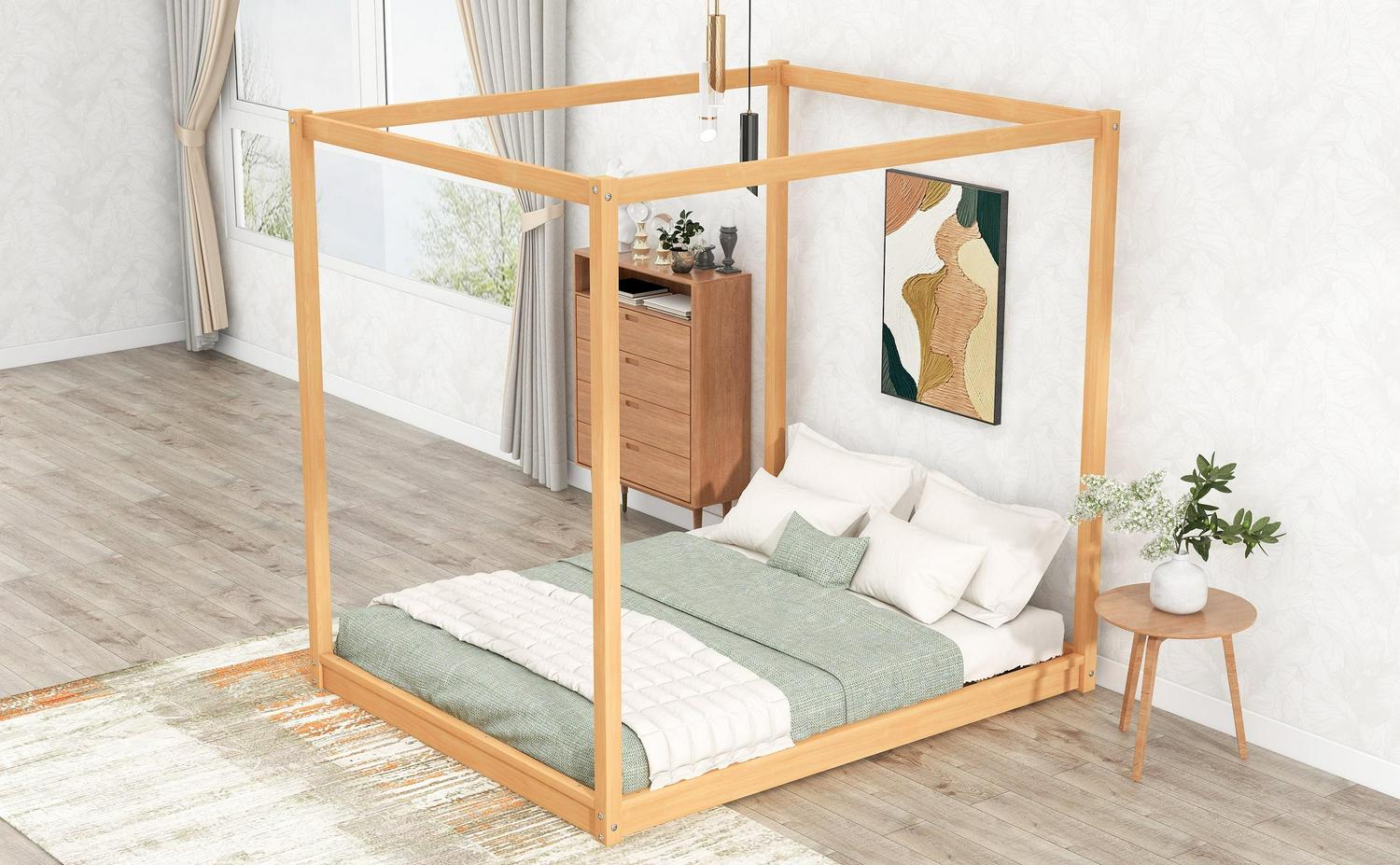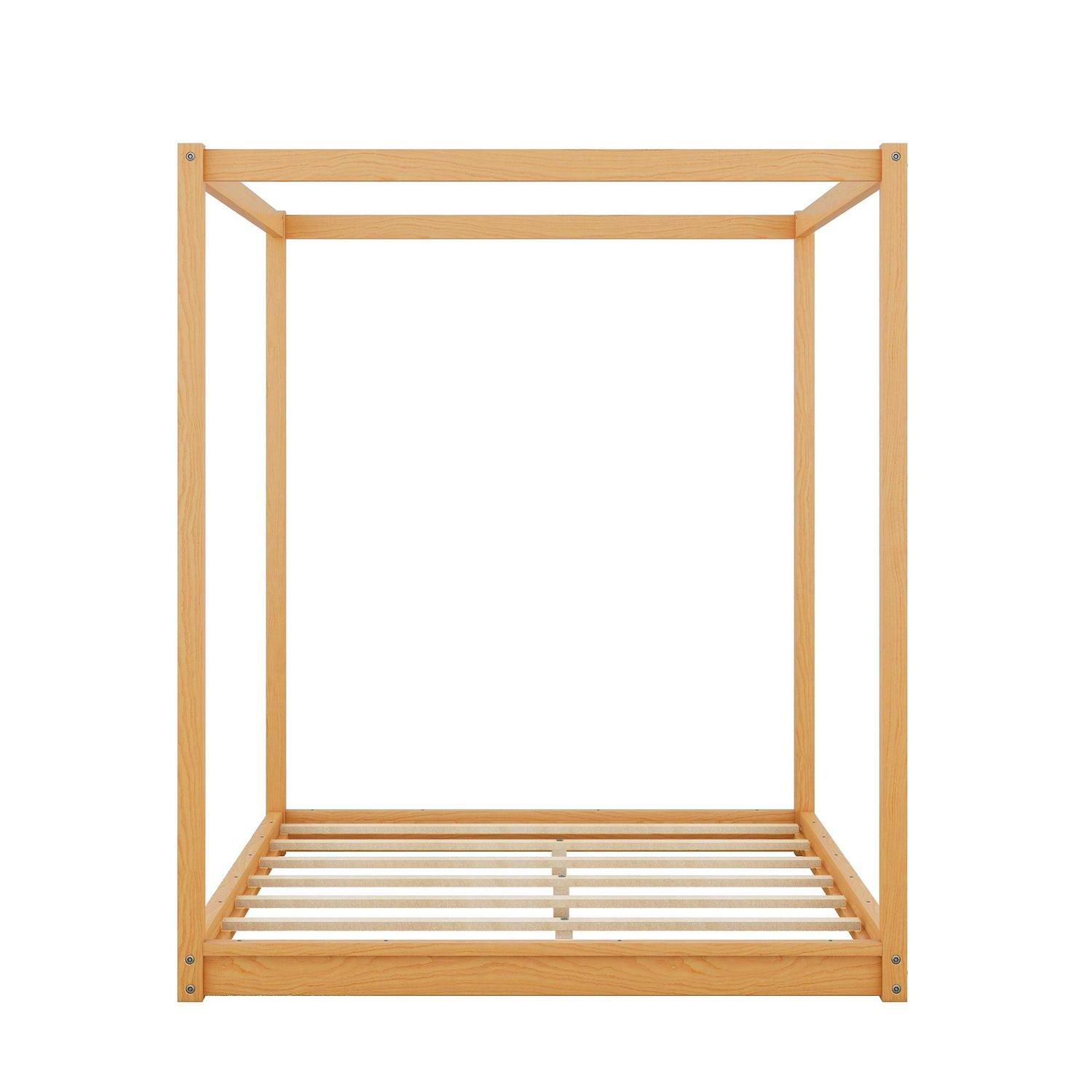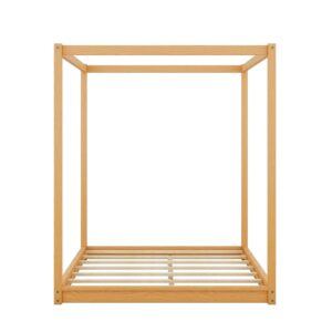 Wood Queen Size Canopy Platform Bed with Support Frame for Bedroom, Natural