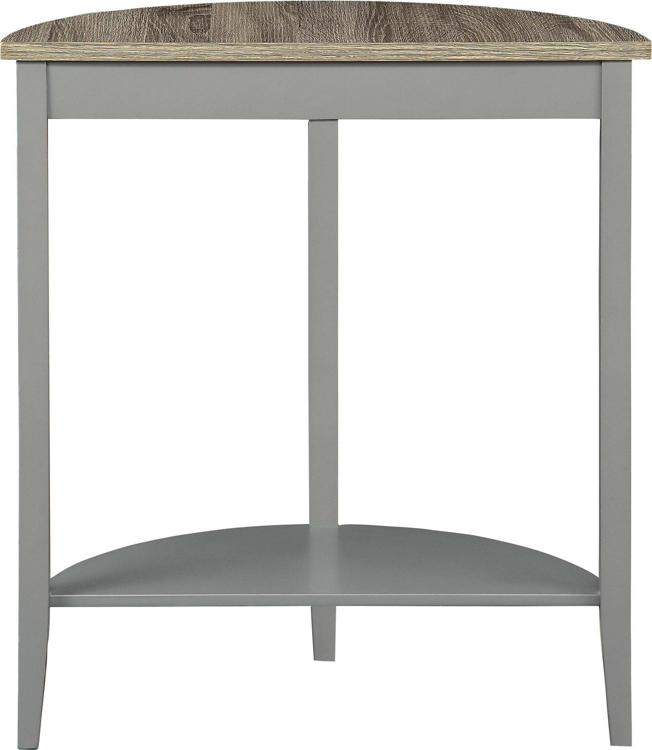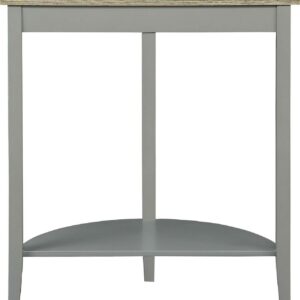 Wooden Half Moon Shaped Console Table with One Open Bottom Shelf, Oak Brown and Gray- Saltoro Sherpi This console table makes a connection between vintage details and modern designs to make it useful in the present life. This gray finished wooden constructed half moon shaped console table features oak brown table top and one open bottom shelf. The table with its unique design will add to the glamour of any place be it bedroom, living room, study room or hallway. The top of the table can be adorn with small vases, lamps, photo frames, decorative trays.