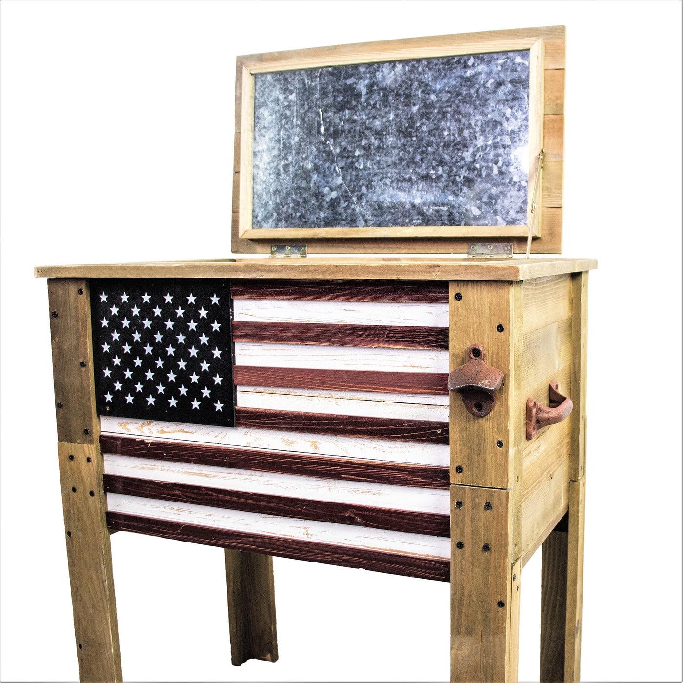 - The wooden ice chest features a painted American Flag with a Rustic antique finish