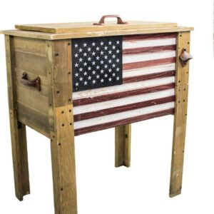 – The wooden ice chest features a painted American Flag with a Rustic antique finish