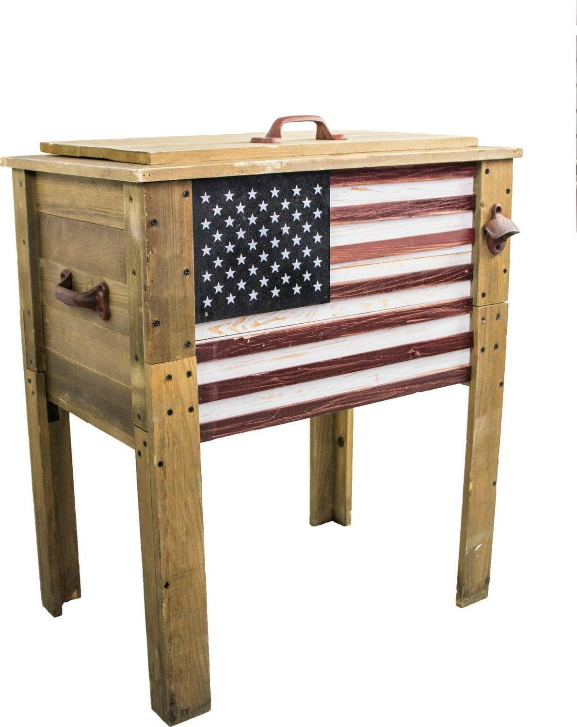 Backyard Expressions’ 57 Qt. Decorative Outdoor American Flag Cooler| The Backyard Expressions 57 Quart Wooden American Flag Cooler features a sturdy wood construction, a painted United States Flag Emblem and is sure bring life to your next party or gathering. This decorative and functional ice chest works great on decks, patios or even indoors! Included with the ice box is a bottle opener, drain plug, decorative cast iron emblem, and a galvanized steel liner with foam insulation designed to keep your drinks colder for longer! Show your USA Pride by adorning your outdoor patio area with the symbol of our nation.