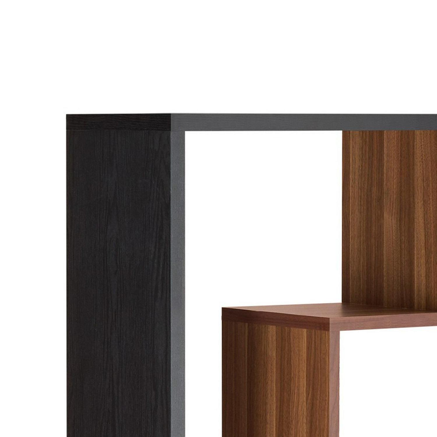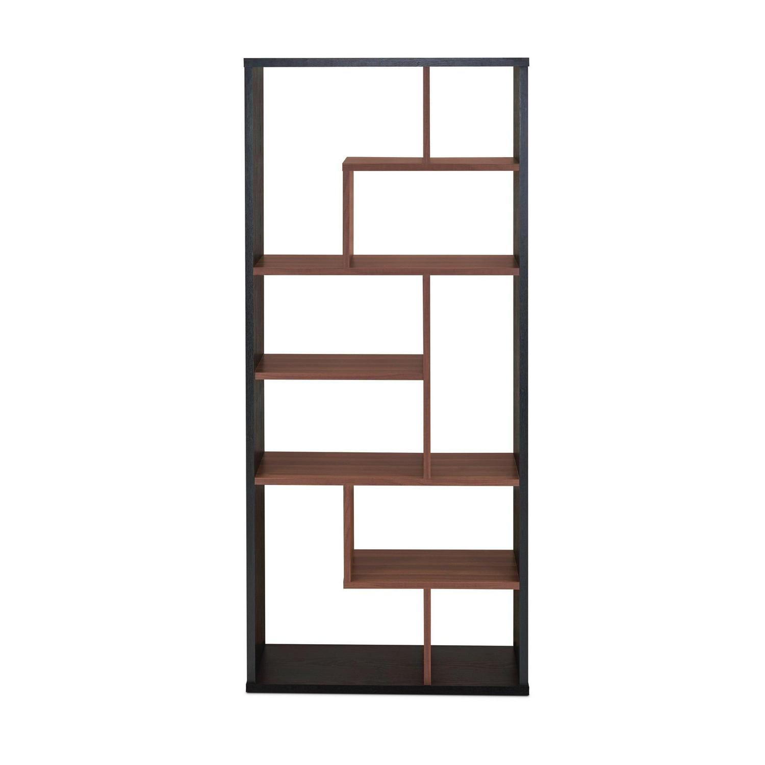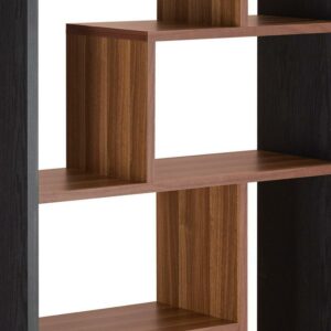 Wooden Rectangular Cube Bookcase, Natural Brown & Black- Saltoro Sherpi This rectangular cube bookcase features 9 staggered cubes in different sizes. This bookcase is made up of wood and is in elegant white finish. You can adorn this in any of your living space. Not only books you can also adorn some decorative pieces in these shelves.