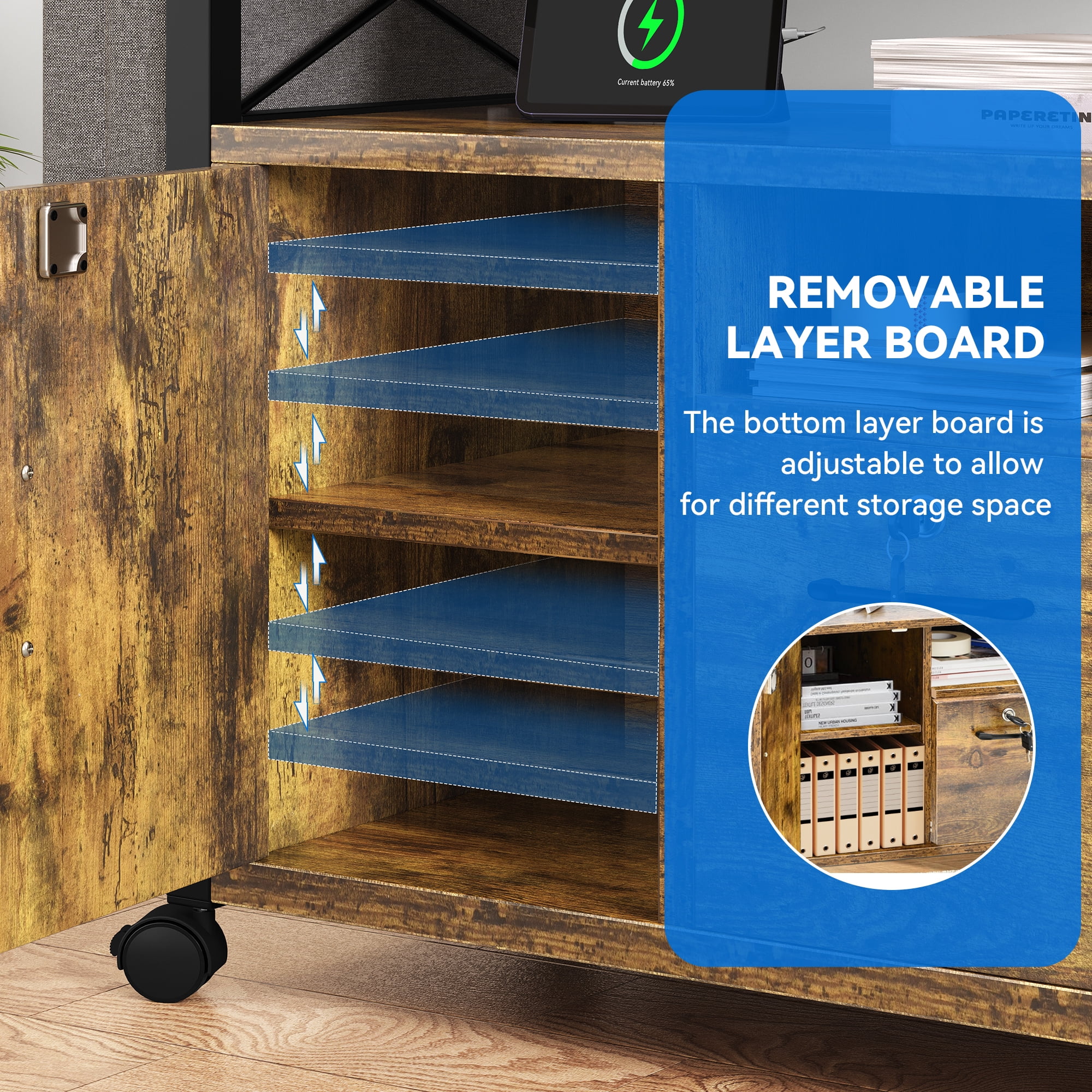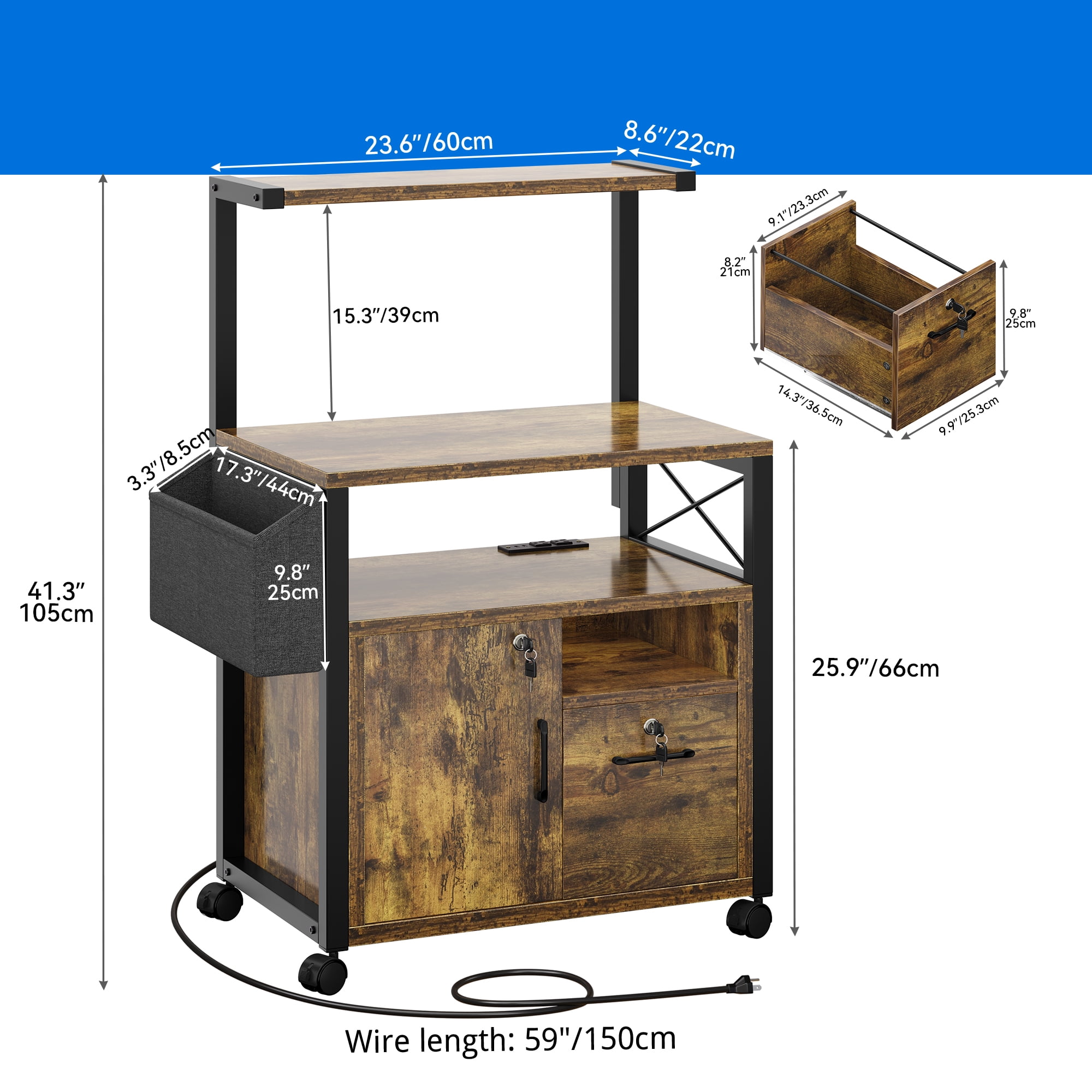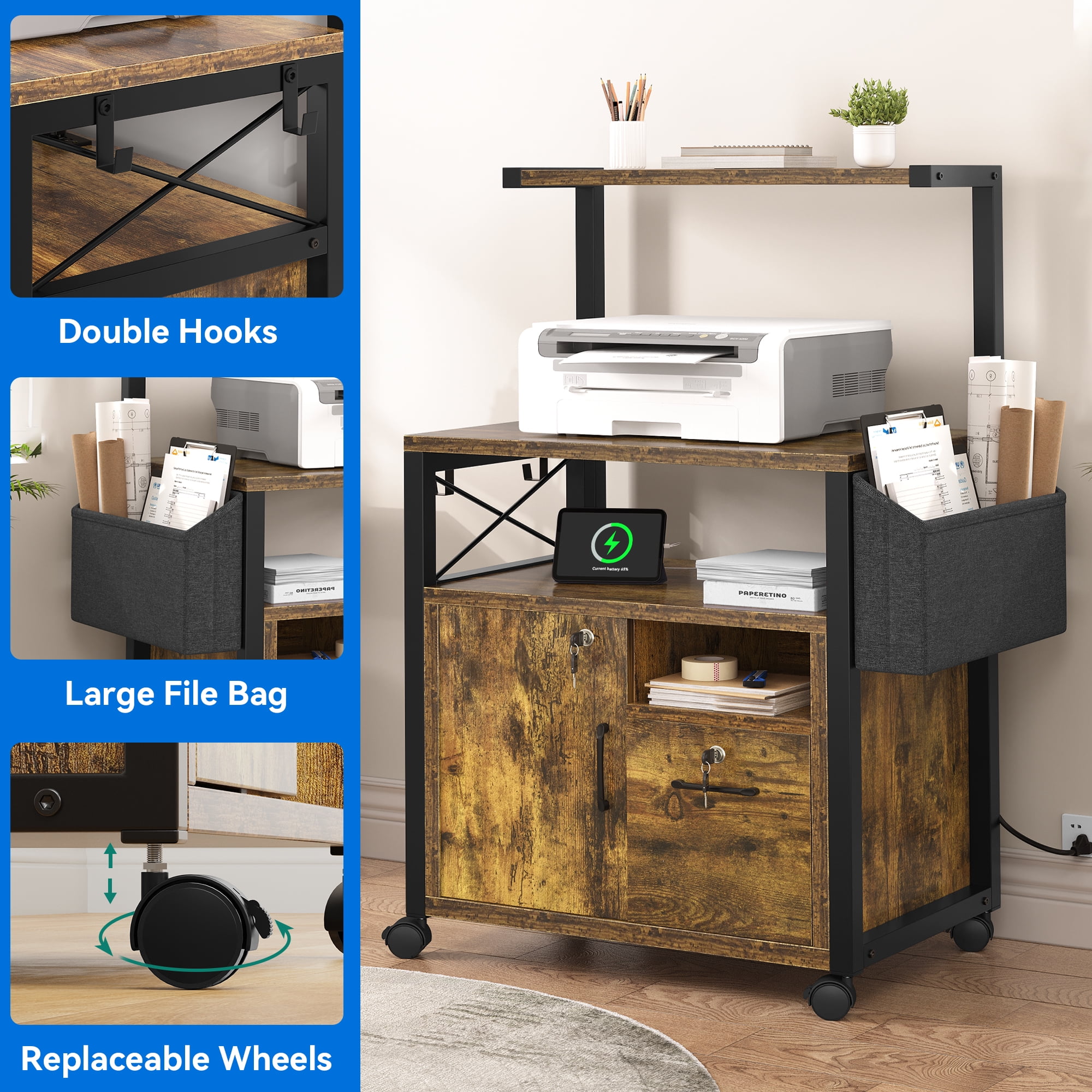 Ample Storage Space: This versatile printer table boasts additional shelves for plants or small items atop its standard storage area. Customize the left-side shelf to your preferred cabinet height. With a lower file hanging drawer and side pockets, it efficiently organizes office and daily essentials. Mobile or Stationary Options: Equipped with four casters (two lockable and two flexible) and four adjustable stationary feet, this mobile printer table offers both flexibility and stability according to your needs. Built to Last: Crafted from high-quality MDF board and a durable metal frame, this office storage cabinet is corrosion-resistant and sturdy enough to hold heavy items, ensuring long-lasting reliability. Convenient Charging Ports: The home office file cabinet features two built-in power outlets and two USB charging ports for effortless charging of your printer, scanner, phone, headset, tablet, or other office electronics, so as to ensure uninterrupted work efficiency. Multi-Purpose Design: With its spacious doors and drawers, this filing cabinet is designed for organizing office files. It’s versatile, suitable for use in bedrooms, living rooms, studies, or as a storage cabinet, sideboard, bookcase, showcase, console table, or computer desk, offering multiple functionalities.