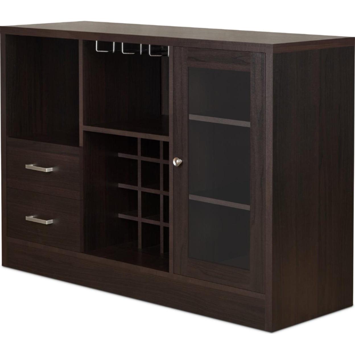 Wooden Server with One Side Door Storage Cabinets and Two Drawers, Espresso Brown- Saltoro Sherpi Add functionality and storage to your living space with the inclusion of this versatile wooden constructed server. Load with multiple storage options, it features 2 drawers with metal bar handles, one open storage cubby, wine rack for up to 16 bottles, stemware racks for bottles, and a cabinet with 2 shelves.