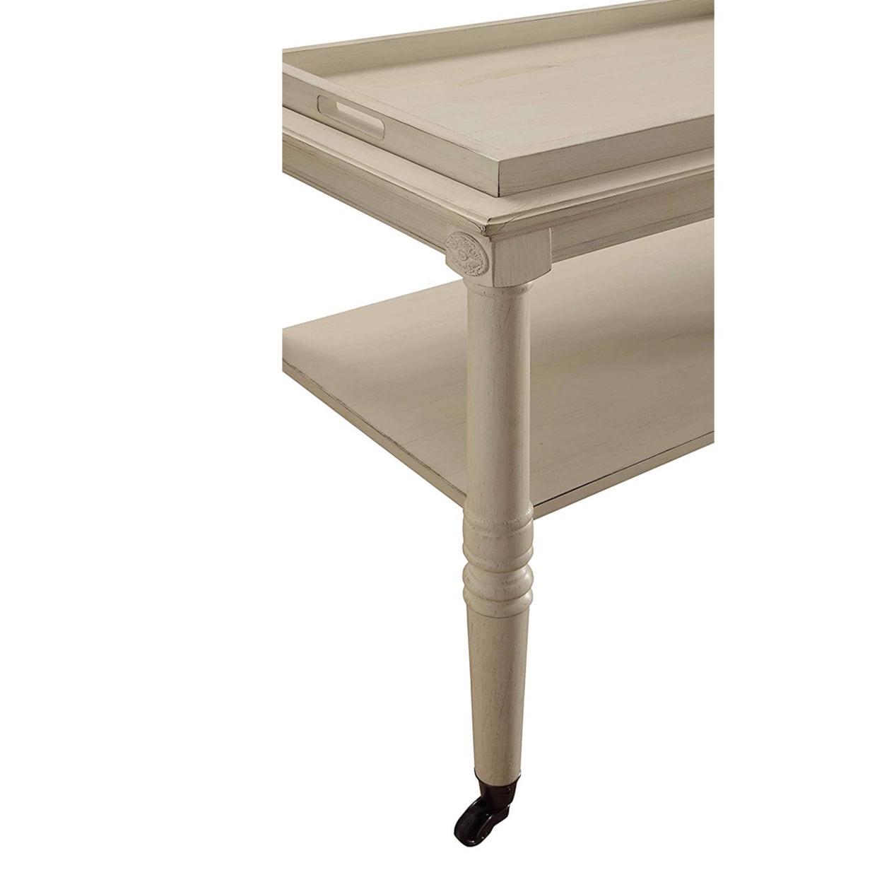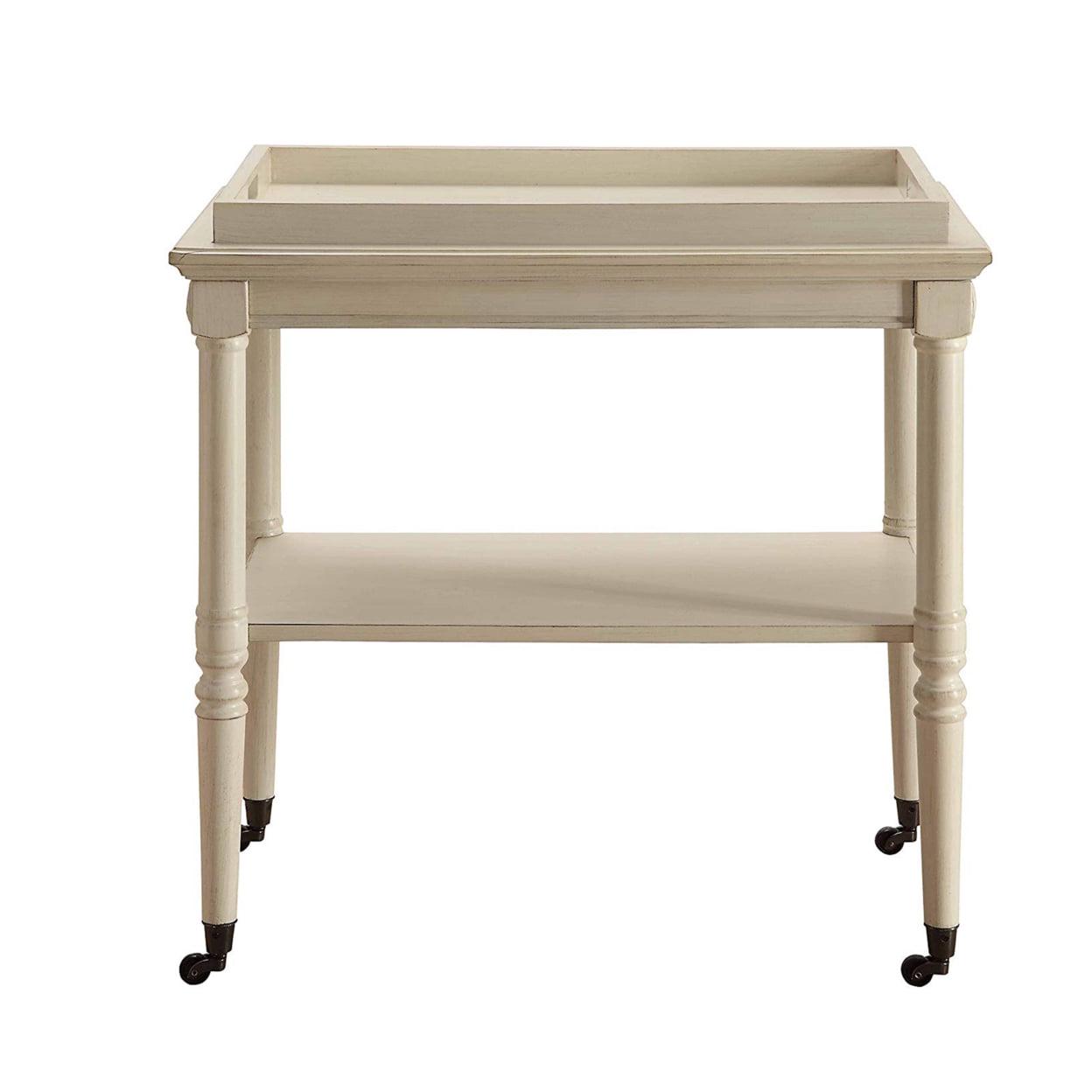 Wooden Serving Tray Table, Antique White- Saltoro Sherpi Pulling inspiration from traditional French design, the serving tray table collection is elegantly scaled and very functional. Featuring a removable tray and lower open storage, the table has fitted metal casters for mobility and in a style to tie in with the table design.