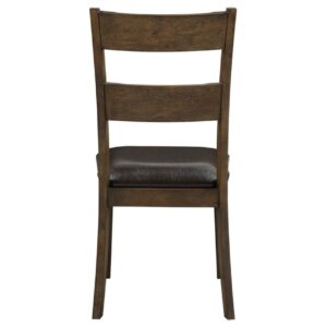 Wooden Side Chairs with Leatherette Padded Seat and Panelled Back, Set of Two, Brown- Saltoro Sherpi Enrich your home furnishing style by bringing this set of two side chairs, with transitional design and appeal. Constructed with sturdy and durable brown finish, these chairs feature a dark brown finished faux leather padded cushion seat perfect for comfortable seating, while has a panel style backrests, adding a visual interest to the chairs. These chairs have straight front and flared legs which provide good support and stability to the overall construction of the chairs. Add these chairs to a dining table or place in your living room or bedroom, for a pleasant seating experience