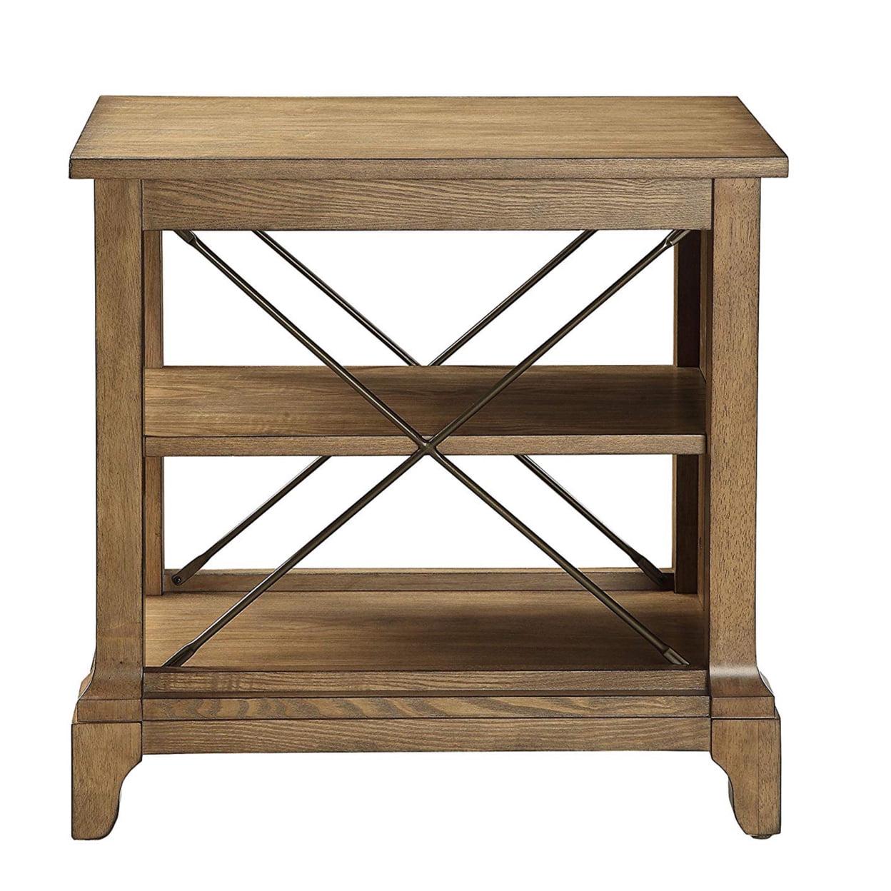 Wooden Side Table With 2 Compartments, Oak Brown- Saltoro Sherpi Enhance your home decor with this end table. This beautiful table features a unique light oak finish with metal “X” design and shaped feet. The extra shelves on this end table would also make a great place to display collectibles and other decorative accents.