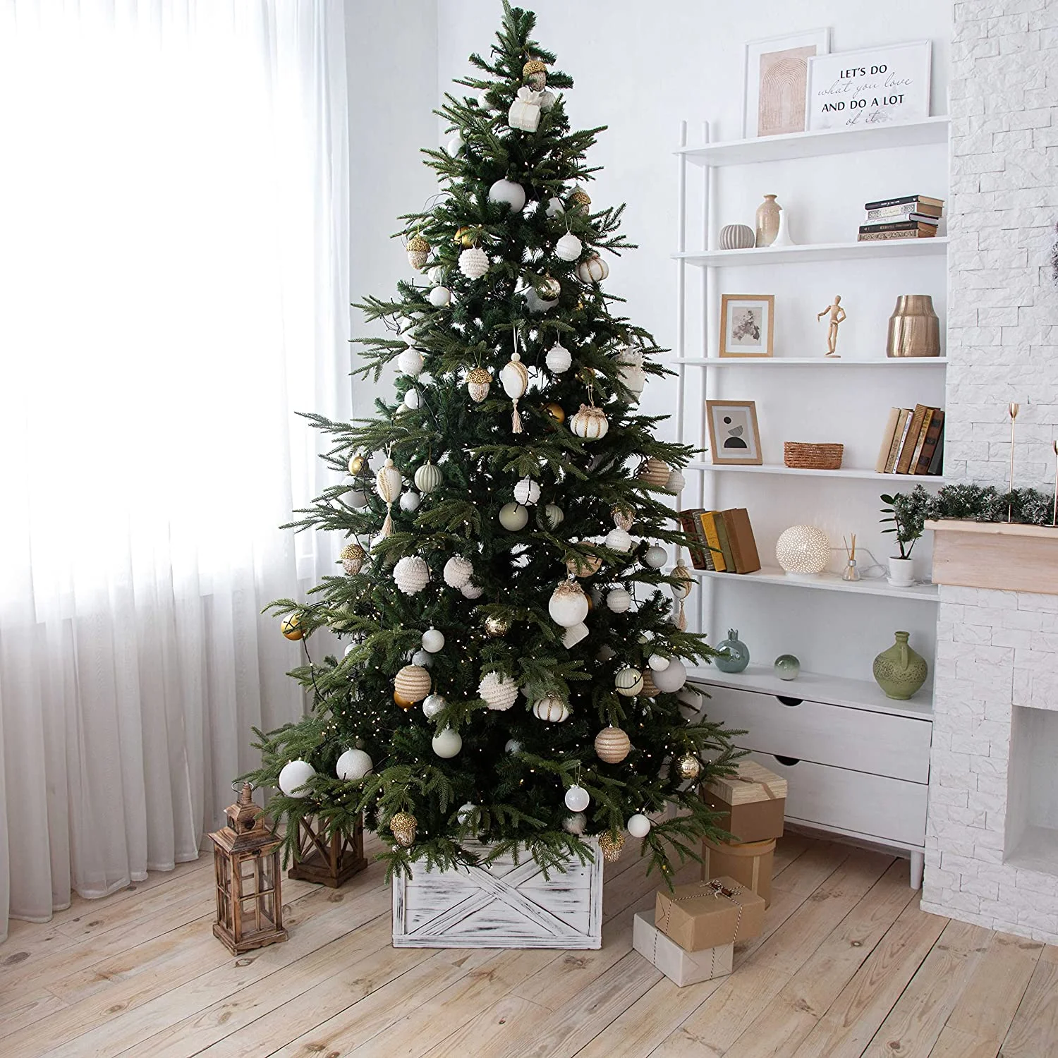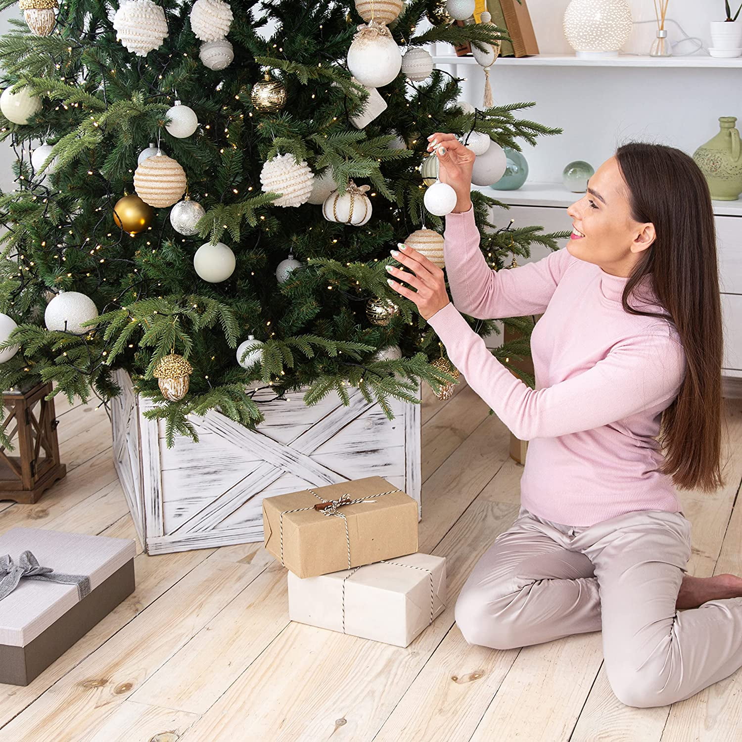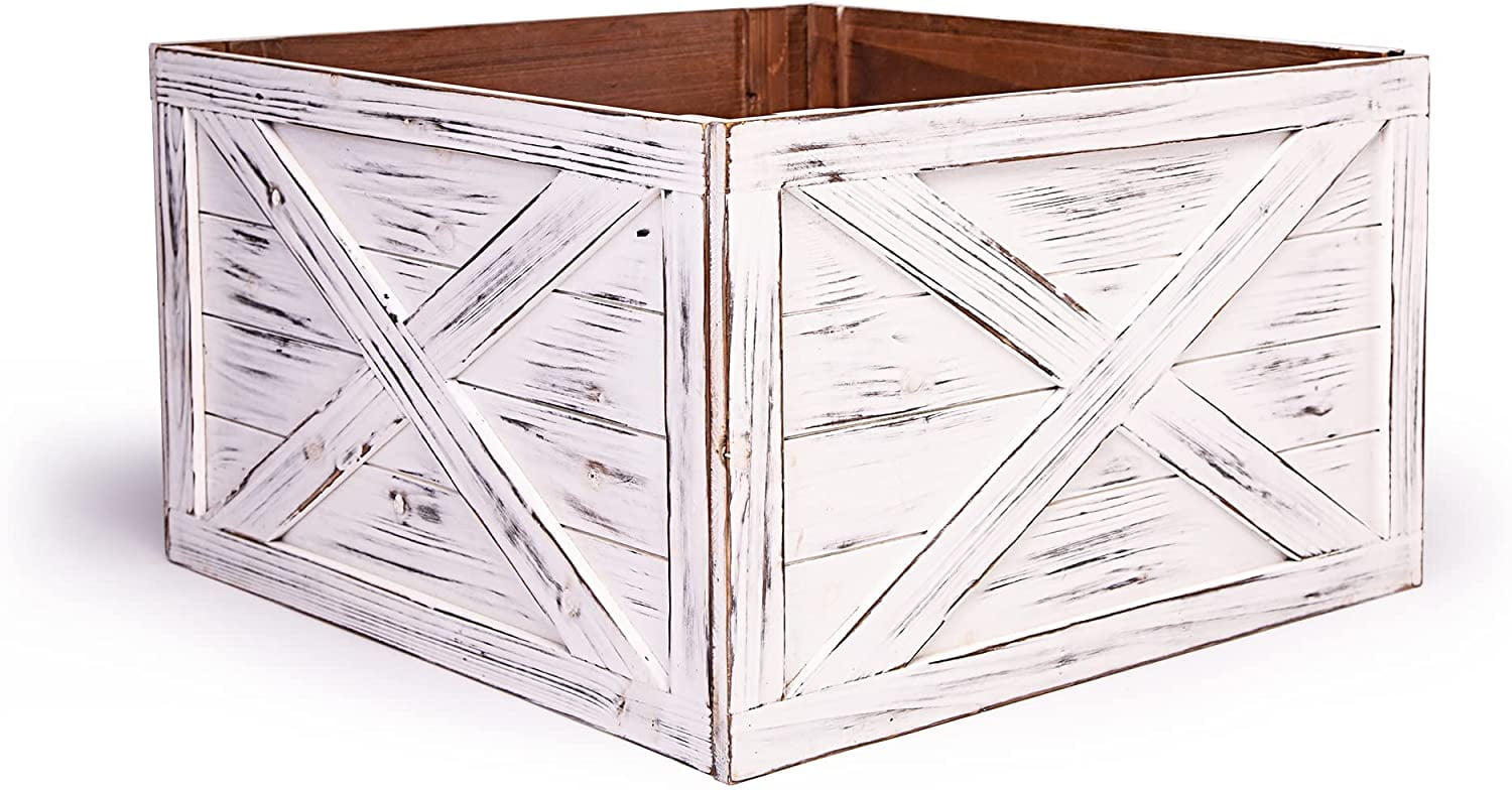 Add a touch of farmhouse design to your Christmas tree with this rustic-finished wood tree ring. This Christmas tree base cover will bring a touch of vintage and modern accents into your home. ADJUSTABLE DIMENSIONS: Fully assembled, the tree skirt panel base is 22.5 inches by 23 inches with an interior diagonal length of 31 inches perfect for large trees up to 12ft in height. The decorative tree skirt stands 14 inches in height. BENEFITS: Hides unsightly or ugly Christmas tree stands by hugging the bottom of your tree. Perfect for Pets – Keeps your dog, cat, or other animals away from your Christmas tree base. Stops pets from drinking water from the base or chewing on the tree. Prevents fur, hair, feathers, and dander from getting onto the tree. PACKAGING: The wood tree collar arrives in a neat cardboard box.