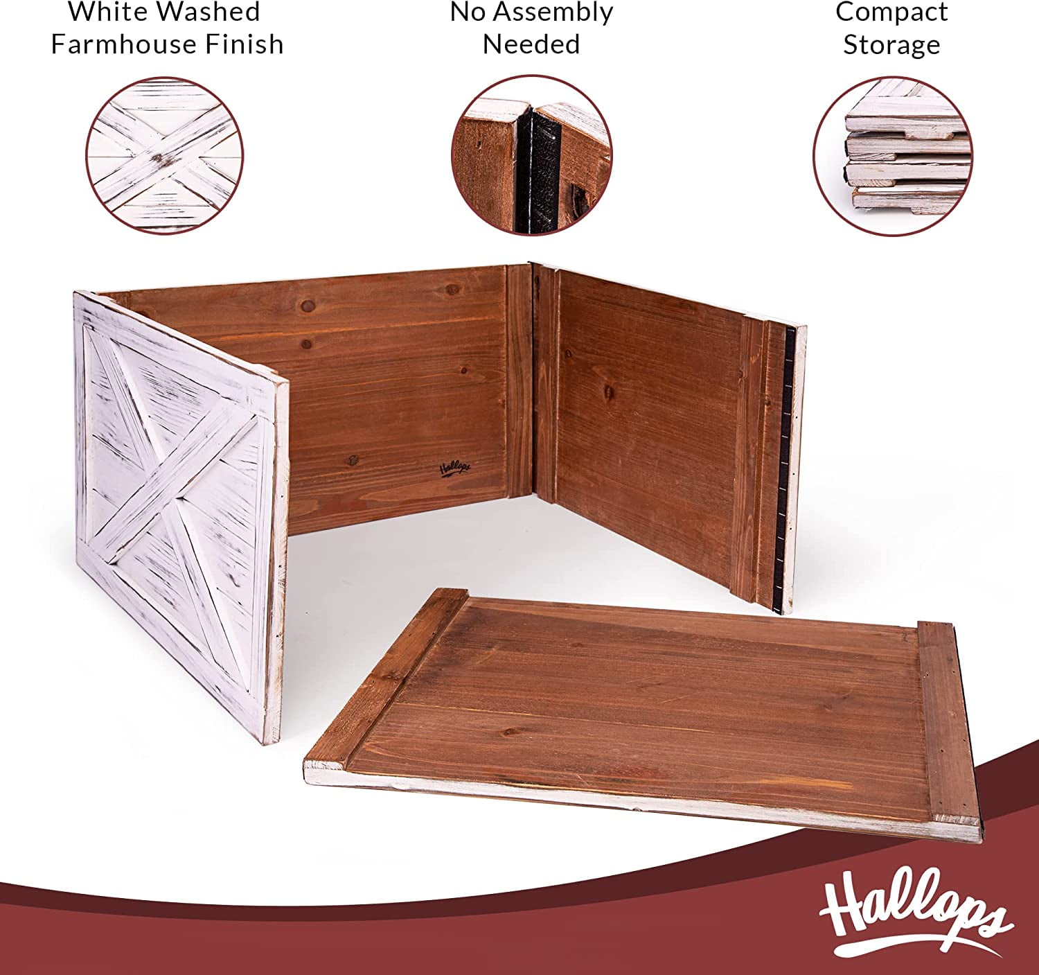 Farmhouse Rustic Design: The Christmas tree collar has a brown wood Finish In clear coating Perfect Size: The farmhouse christmas tree collar has sides Of 23.5 Inches X 23 Inches and height Of 14 Inches. The product has adjustable tree collar. Easy Assembly And Compact Storage: The rustic tree collar has a quick Velcro Assembly And 4 Stackable Panels For Compact Storage Great For Pets: The Hallops christmas tree box collar keeps Your Dog Or Cat Away From Christmas Tree Base Or Water In Tree Stand The christmas tree box base is environmentally Friendly & Sustainably Sourced Real Wood