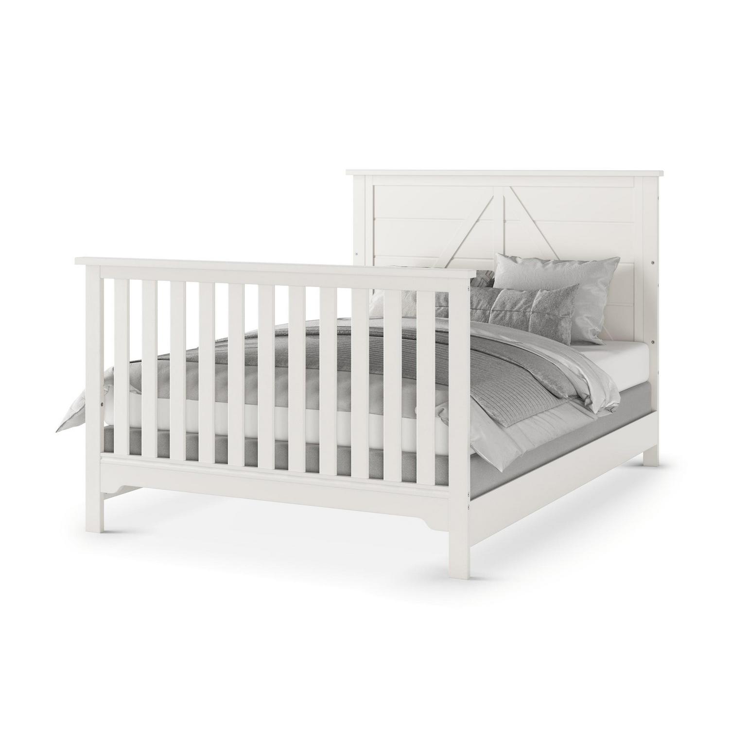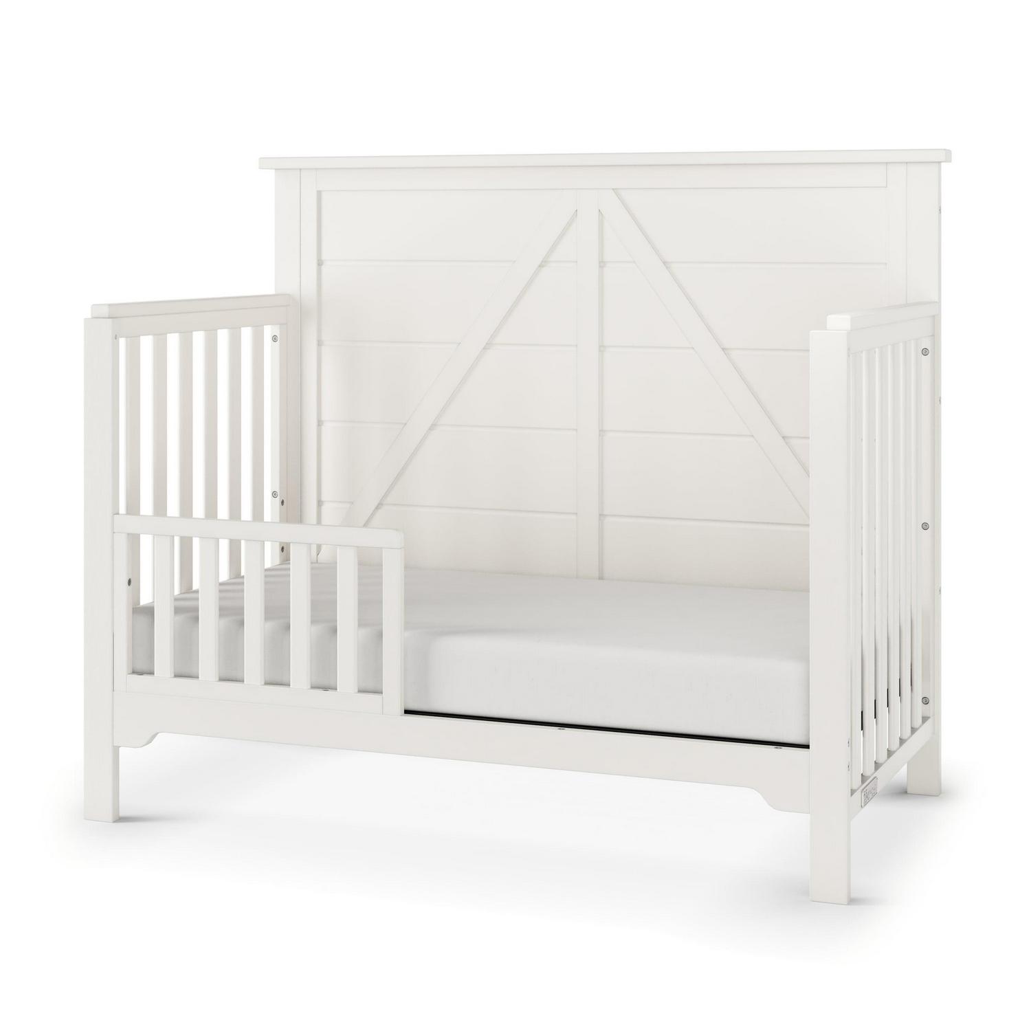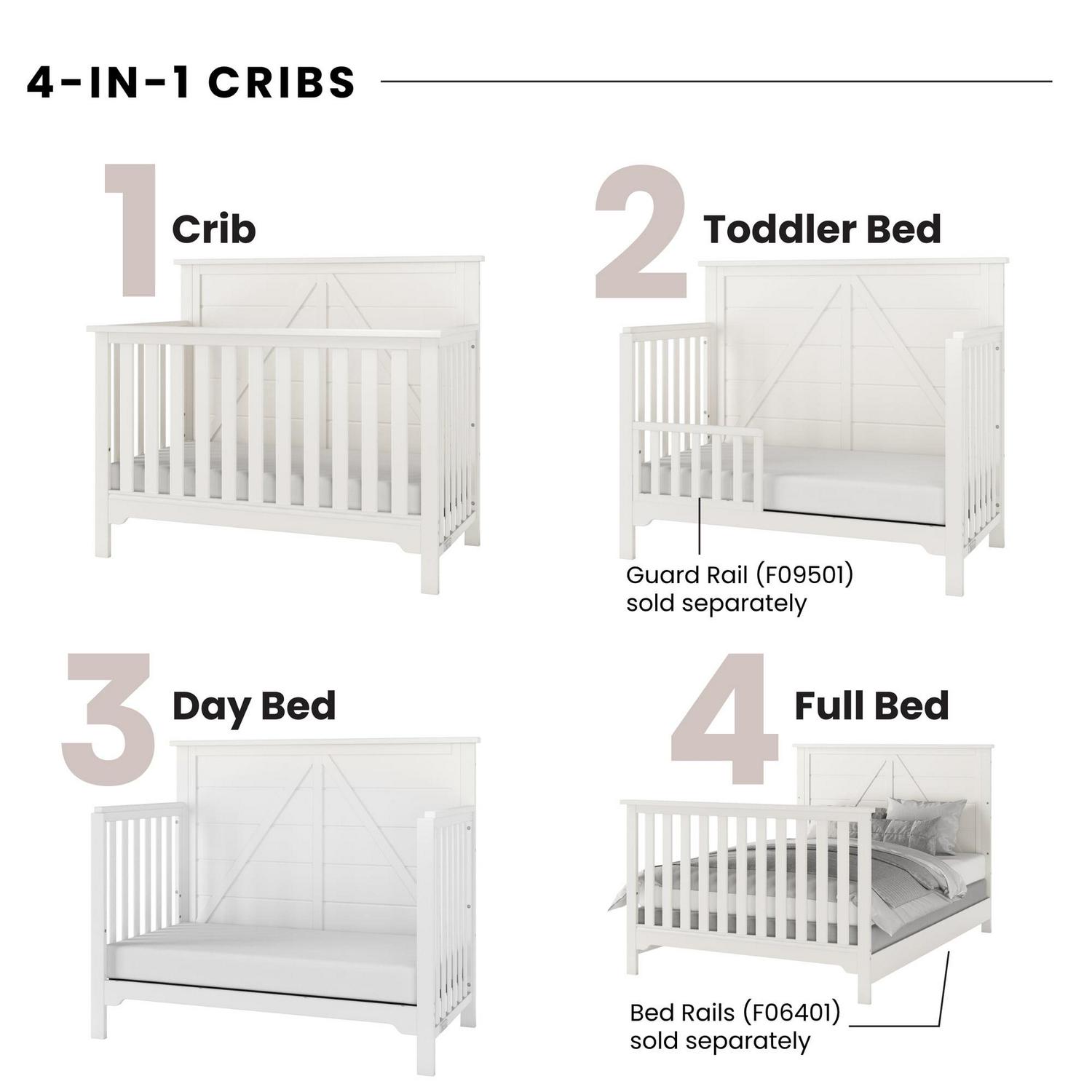 Create a warm and cozy, country oasis in your nursery with the Forever Eclectic Woodland Convertible Crib. The crib features a clean, rustic design that seamlessly blends timeless style and function as it transitions with your child as they grow. Crafted of strong, sturdy pine wood and veneers and features a unique wire-brushed stained finish, clean lines and plank style shiplap paneling detail in the headboard 4-in-1 Convertible crib grows with your child by converting into a crib, daybed, toddler bed and full-size bed (coordinating guard/bed rails sold separately) Strong metal mattress support adjusts to 3 positions to accommodate the growing needs of your child Fits most standard size crib mattresses (sold separately) Converts from a crib to a toddler bed using the coordinating toddler guard rail (F09501) sold separately Full-size bed conversion rails (F06401) sold separately Assembly required 2-year manufacturer’s warranty Meets ASTM and CPSC standards Measures 55.75 L x 30.75 W x 47 H, assembled Available in Brushed Truffle, Brushed Pebble and Brushed Cotton non-toxic, safe finishes Mix and match with other Forever Eclectic pieces to create a look that s individually inspired and uniquely yours.