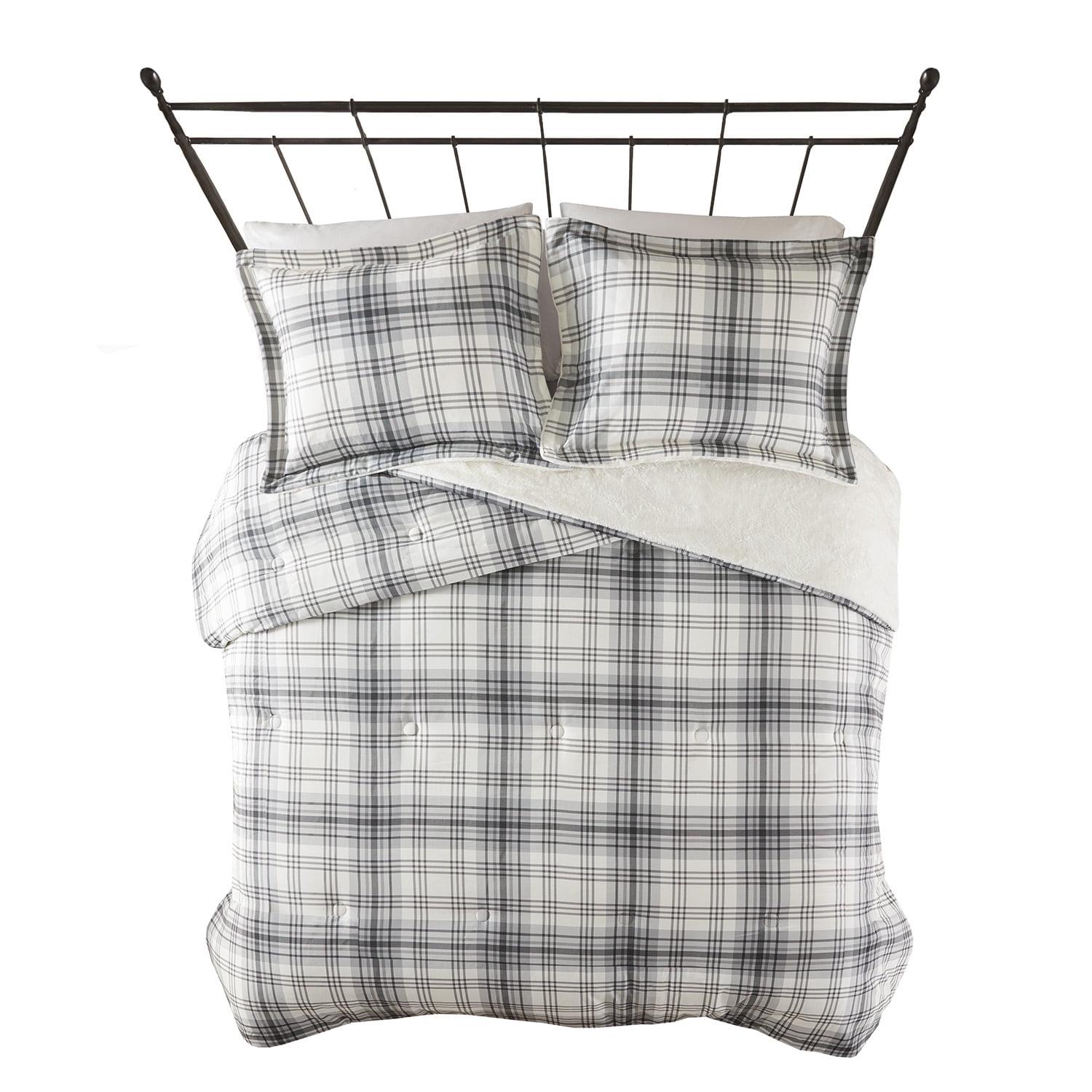 – Comforter and 2 matching shams are printed grey/cream plaid with faux mink fur on the reverse side for warmth
