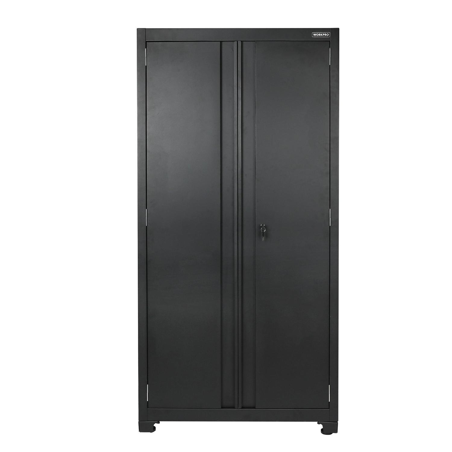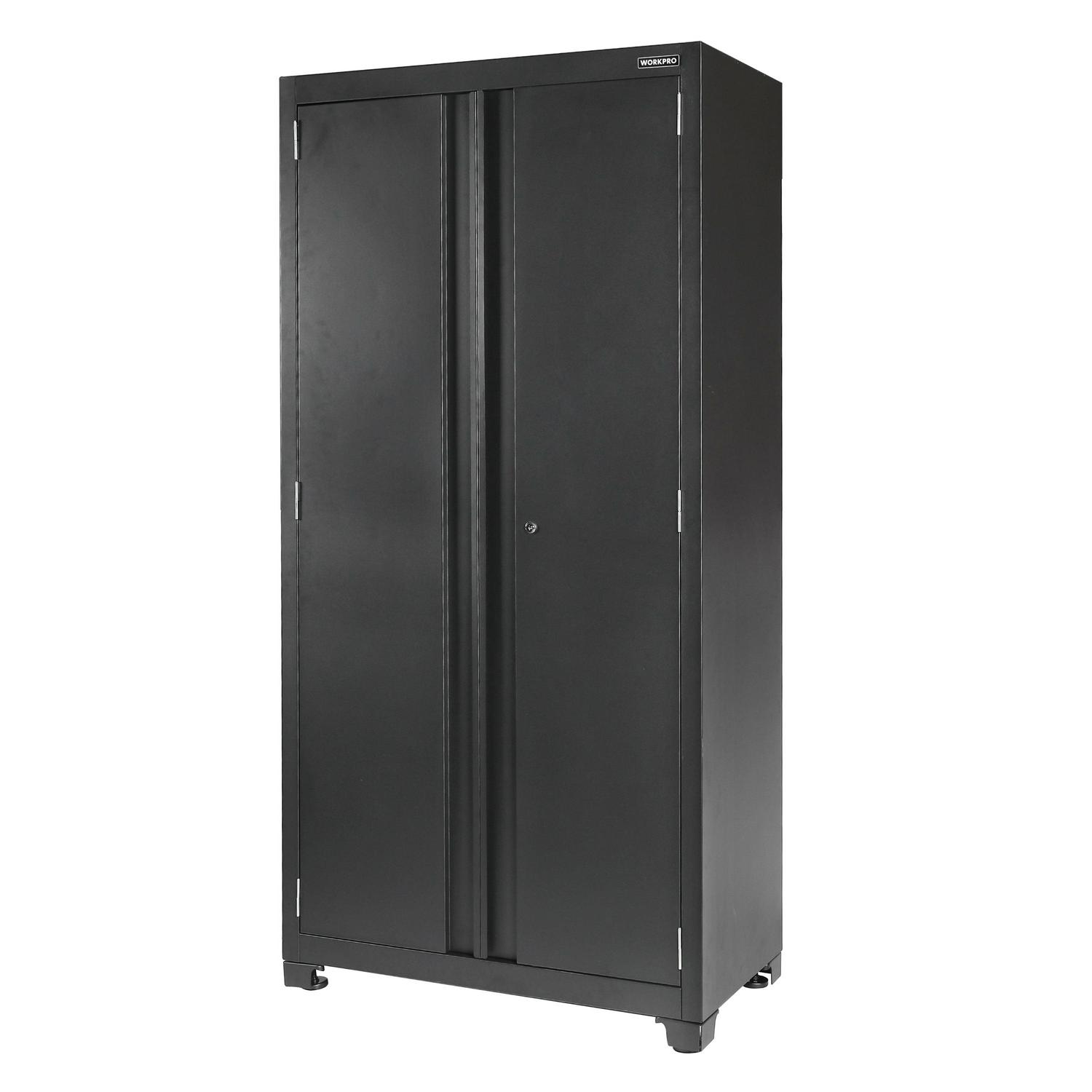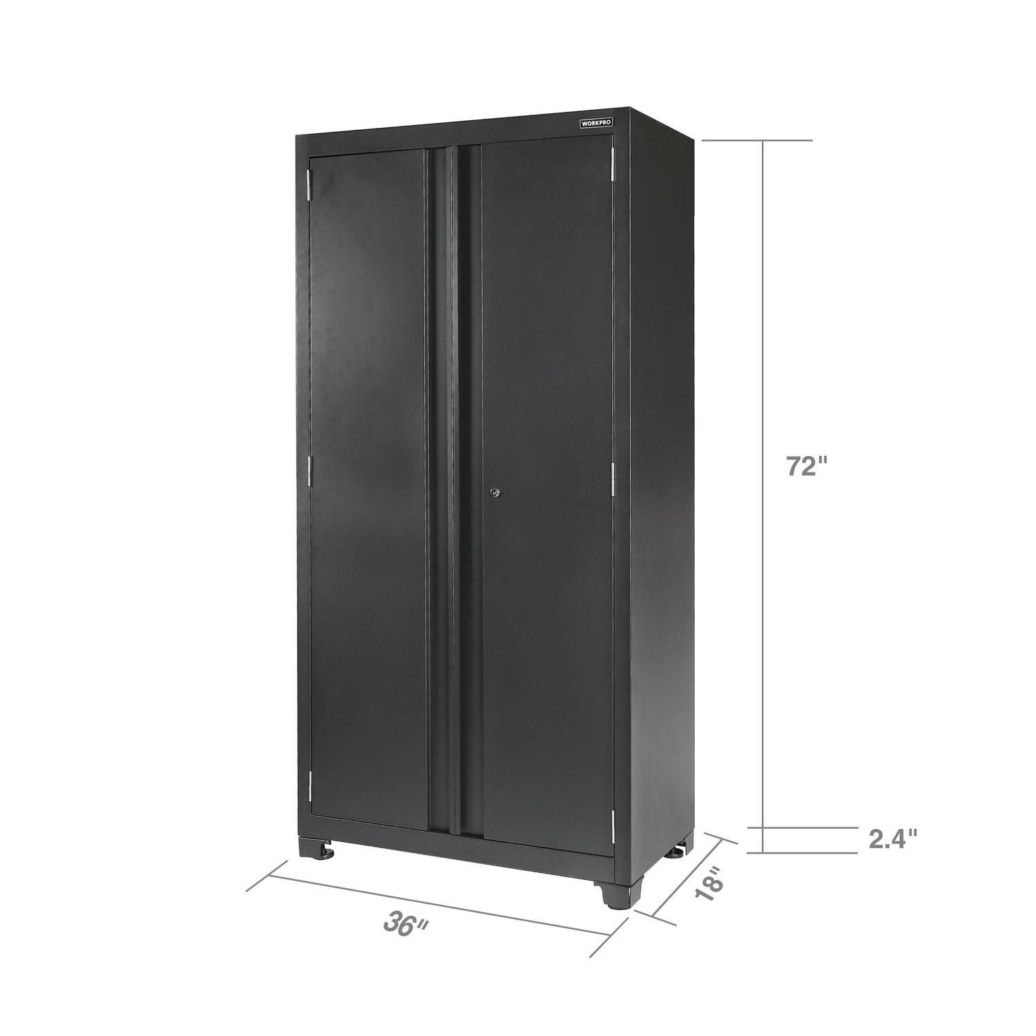 The WORKPRO 36-inch 3-Shelf Heavy-Duty Garage Storage Cabinet is the perfect solution for keeping tools, equipment, and other supplies organized and off the floor. The WORKPRO cabinet is constructed with heavy-duty steel with a durable powder coat finish to withstand the endless DIY and improvement projects on your list. Each of the three adjustable shelves and cabinet base have a weight capacity of 150 lbs for a total weight capacity of 600 lbs. The cabinet doors are equipped with magnetic top and bottom plates that hold the doors shut as well as a 2-point security lock for added security so you can feel confident in storing your valuables in this cabinet. Featuring a mountable structure and adjustable feet for leveling and stability on uneven surfaces. Free up valuable space and organize your garage with the WORKPRO 36-Inch Heavy-Duty Garage Storage Cabinet. Matching WORKPRO wall and rolling base cabinets are available at Crowdfused.