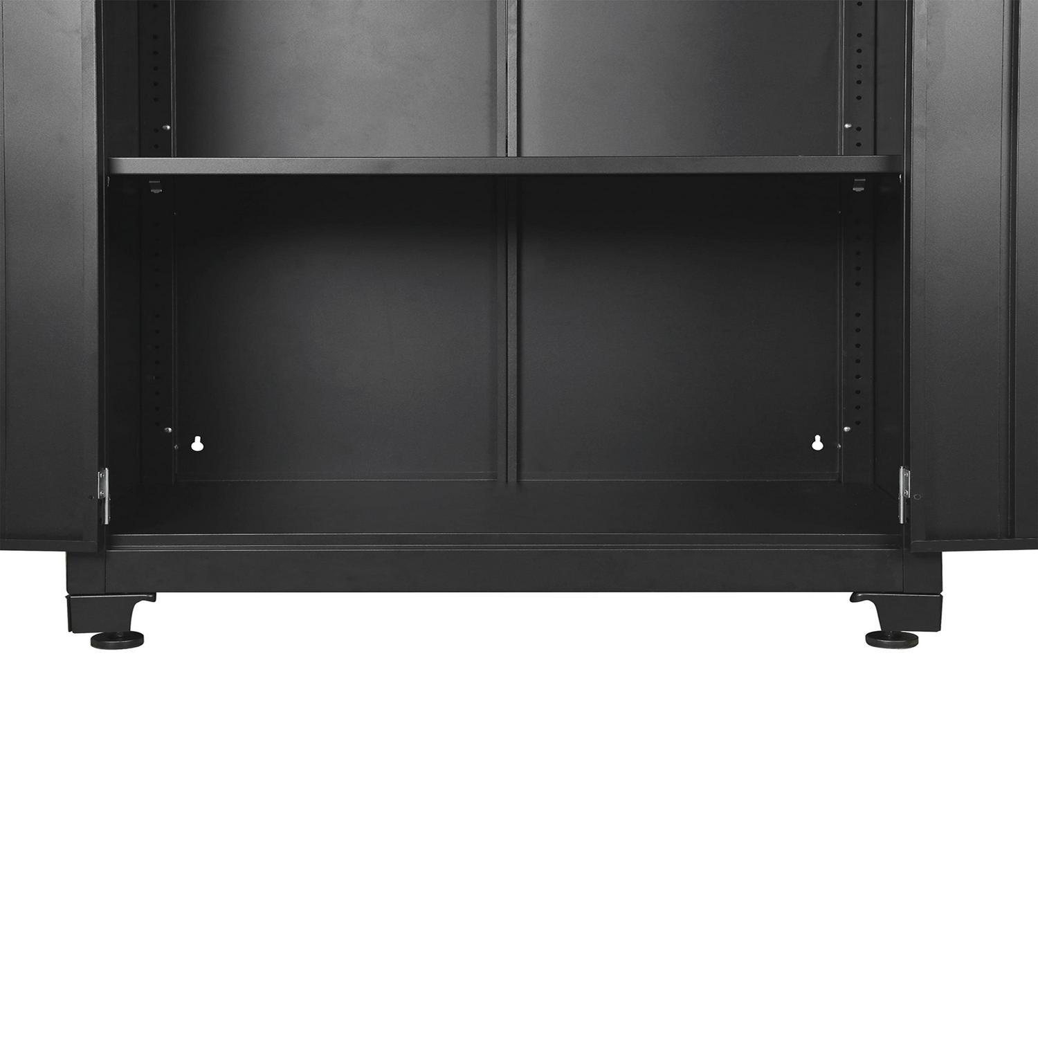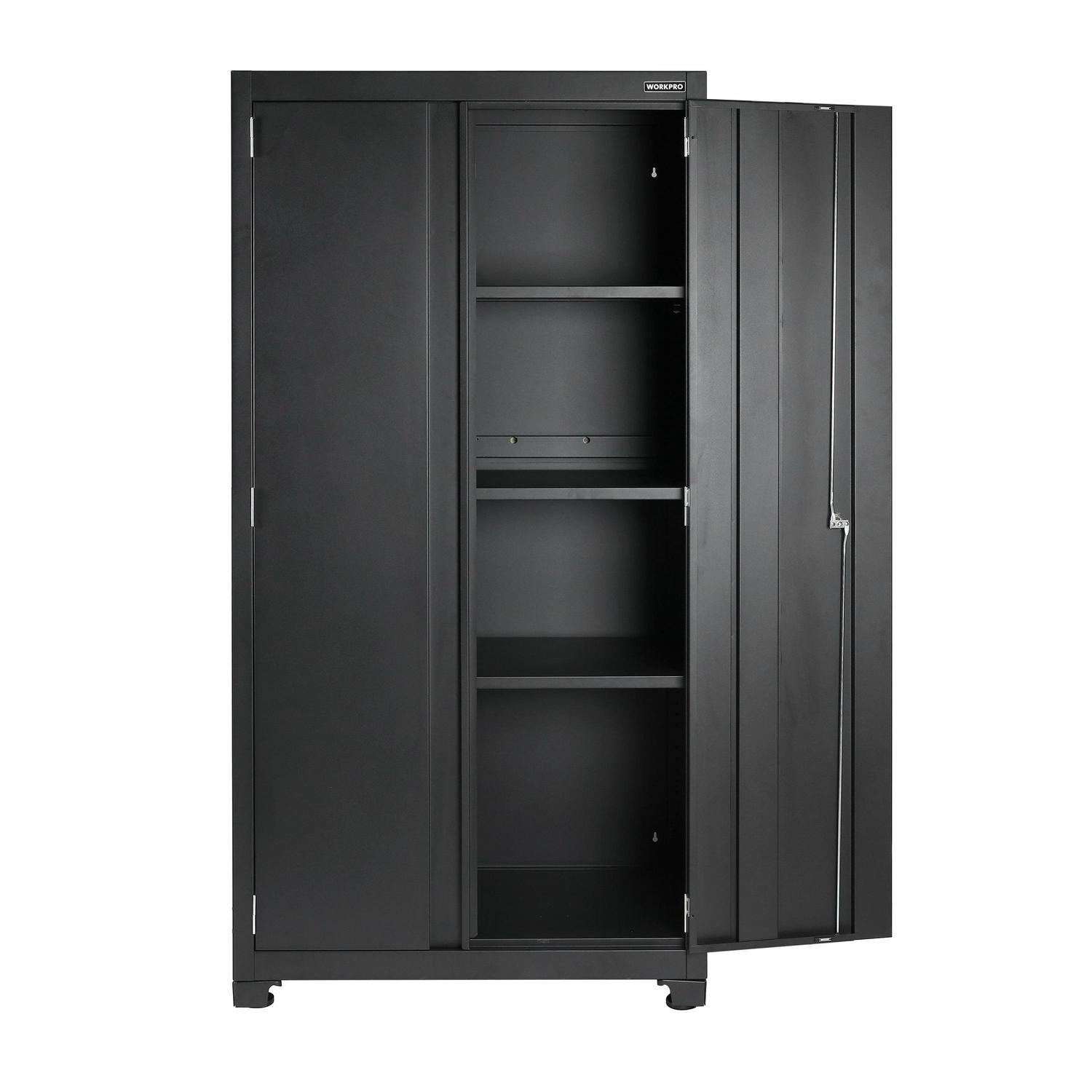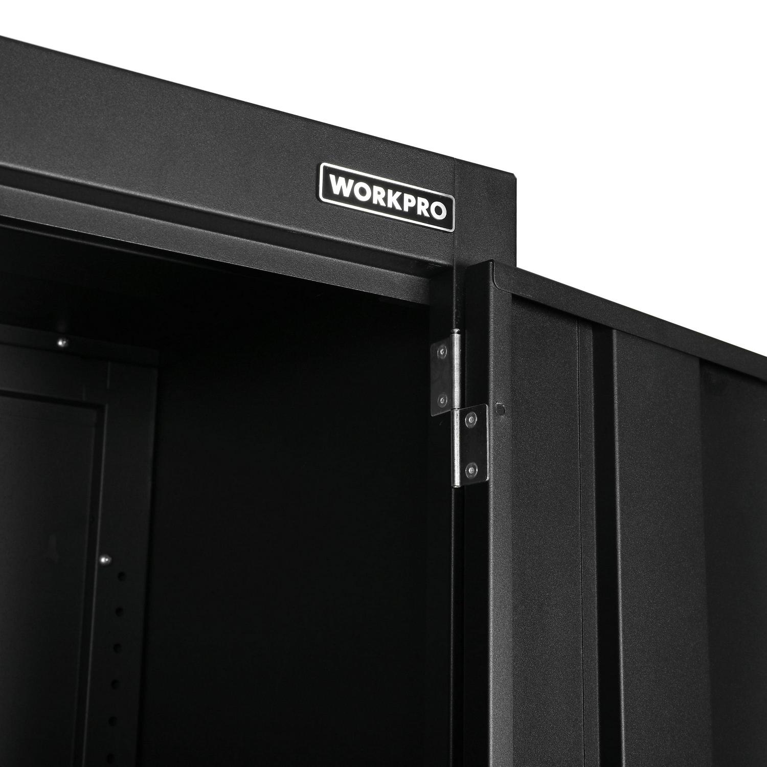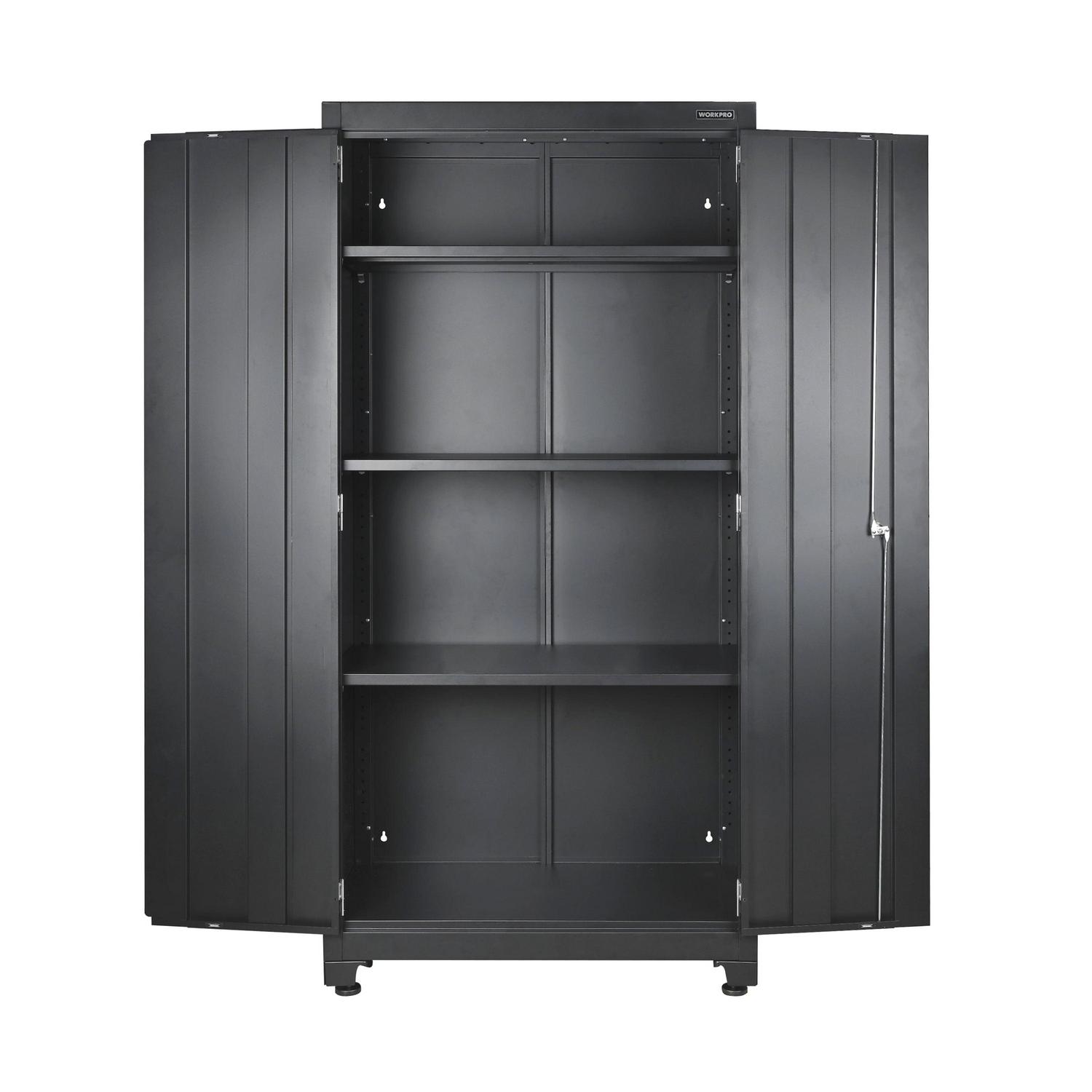 The WORKPRO 36-inch 3-Shelf Heavy-Duty Garage Storage Cabinet is the perfect solution for keeping tools, equipment, and other supplies organized and off the floor. The WORKPRO cabinet is constructed with heavy-duty steel with a durable powder coat finish to withstand the endless DIY and improvement projects on your list. Each of the three adjustable shelves and cabinet base have a weight capacity of 150 lbs for a total weight capacity of 600 lbs. The cabinet doors are equipped with magnetic top and bottom plates that hold the doors shut as well as a 2-point security lock for added security so you can feel confident in storing your valuables in this cabinet. Featuring a mountable structure and adjustable feet for leveling and stability on uneven surfaces. Free up valuable space and organize your garage with the WORKPRO 36-Inch Heavy-Duty Garage Storage Cabinet. Matching WORKPRO wall and rolling base cabinets are available at Crowdfused.