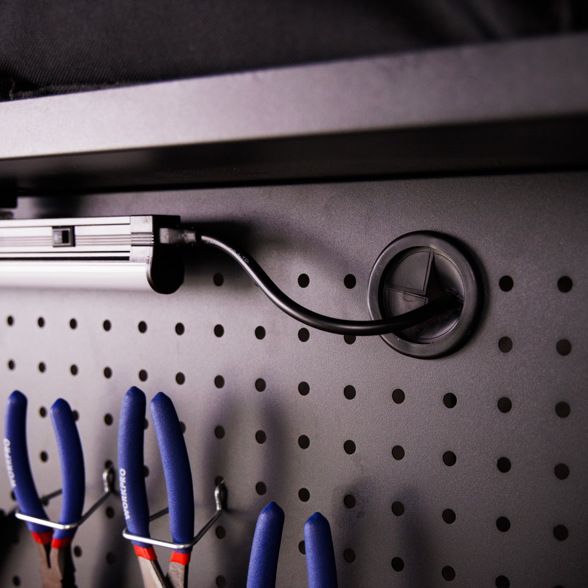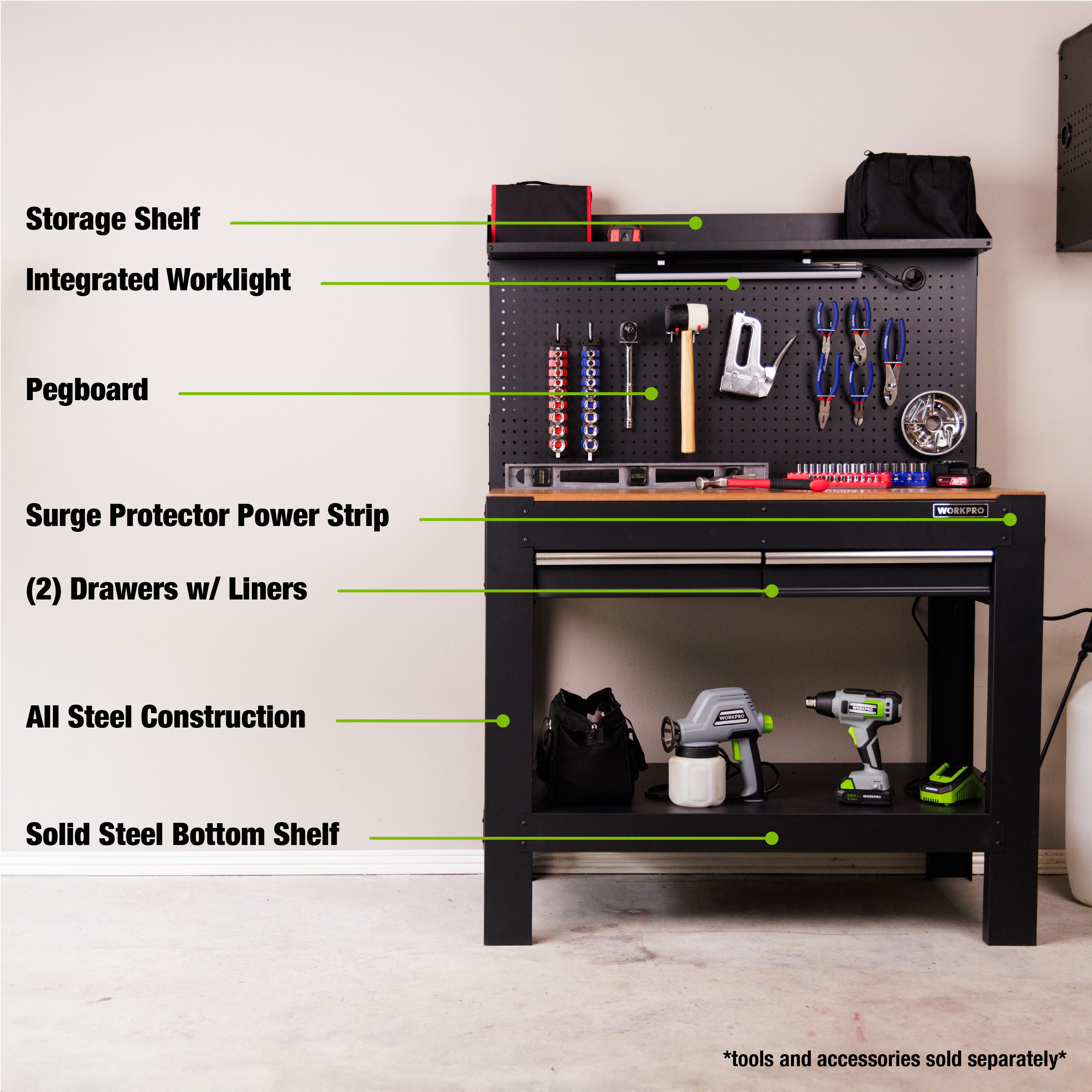 Experience the next level of craftsmanship with our state-of-the-art WORKPRO Multipurpose Workbench. Designed for professionals, hobbyists, and DIY enthusiasts, this steel workbench brings functionality and convenience to your workspace, ensuring every project is executed with precision. This bench offers two storage options both pegboard and drawers. Let your creativity shine under the bright LED lights and power up your projects with ease!