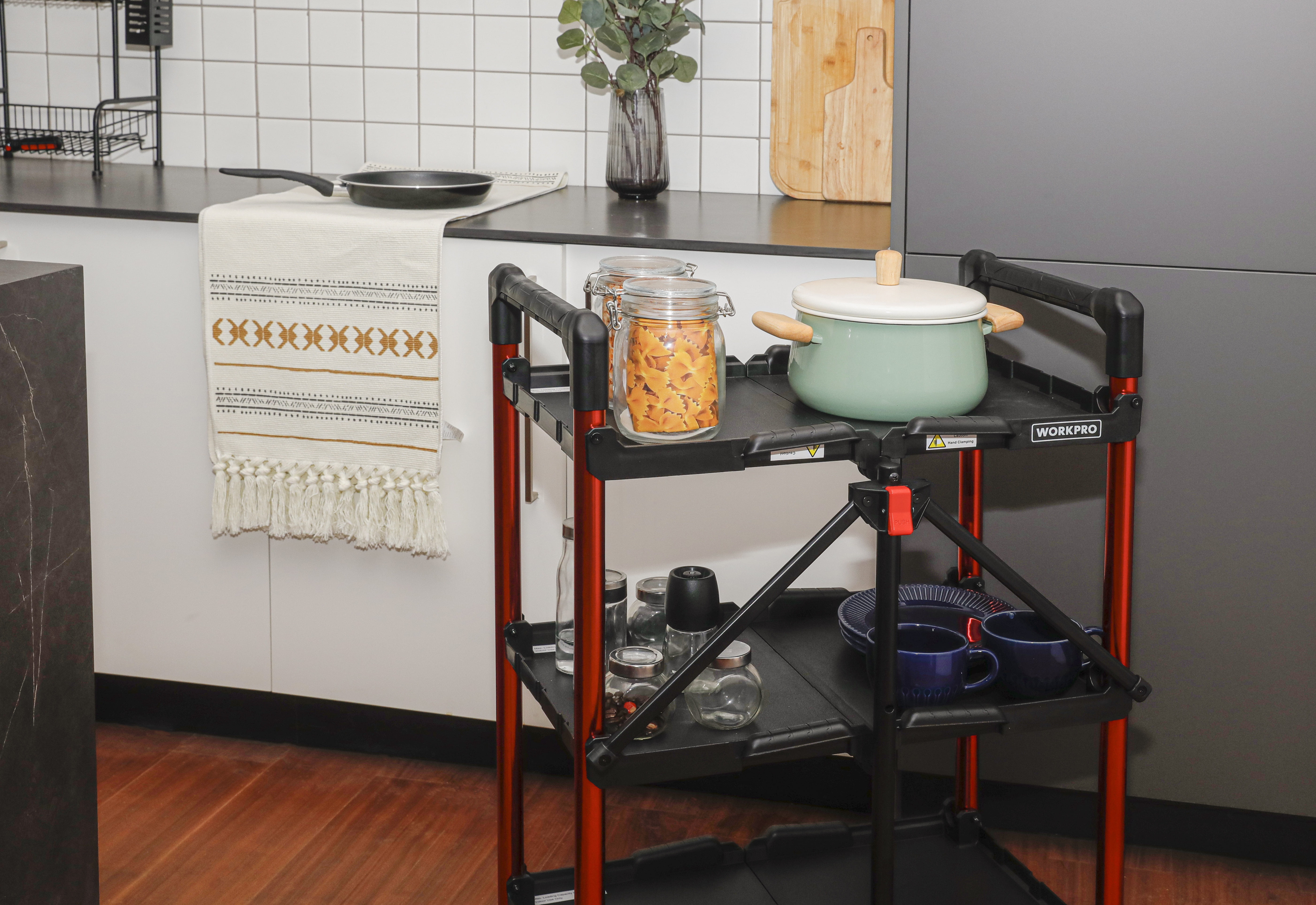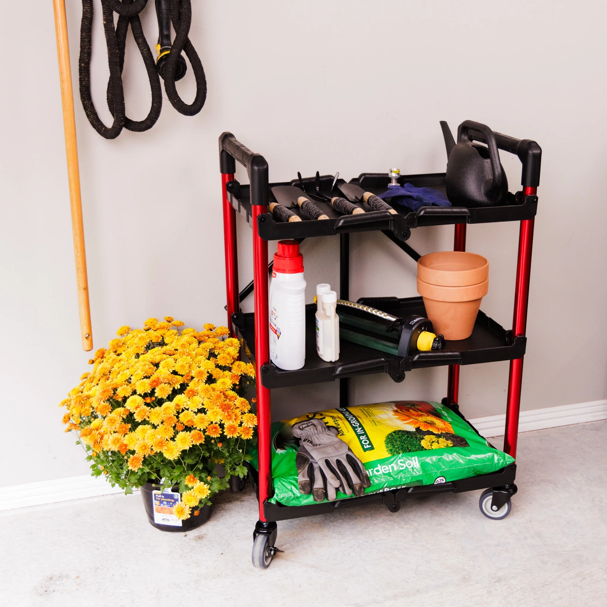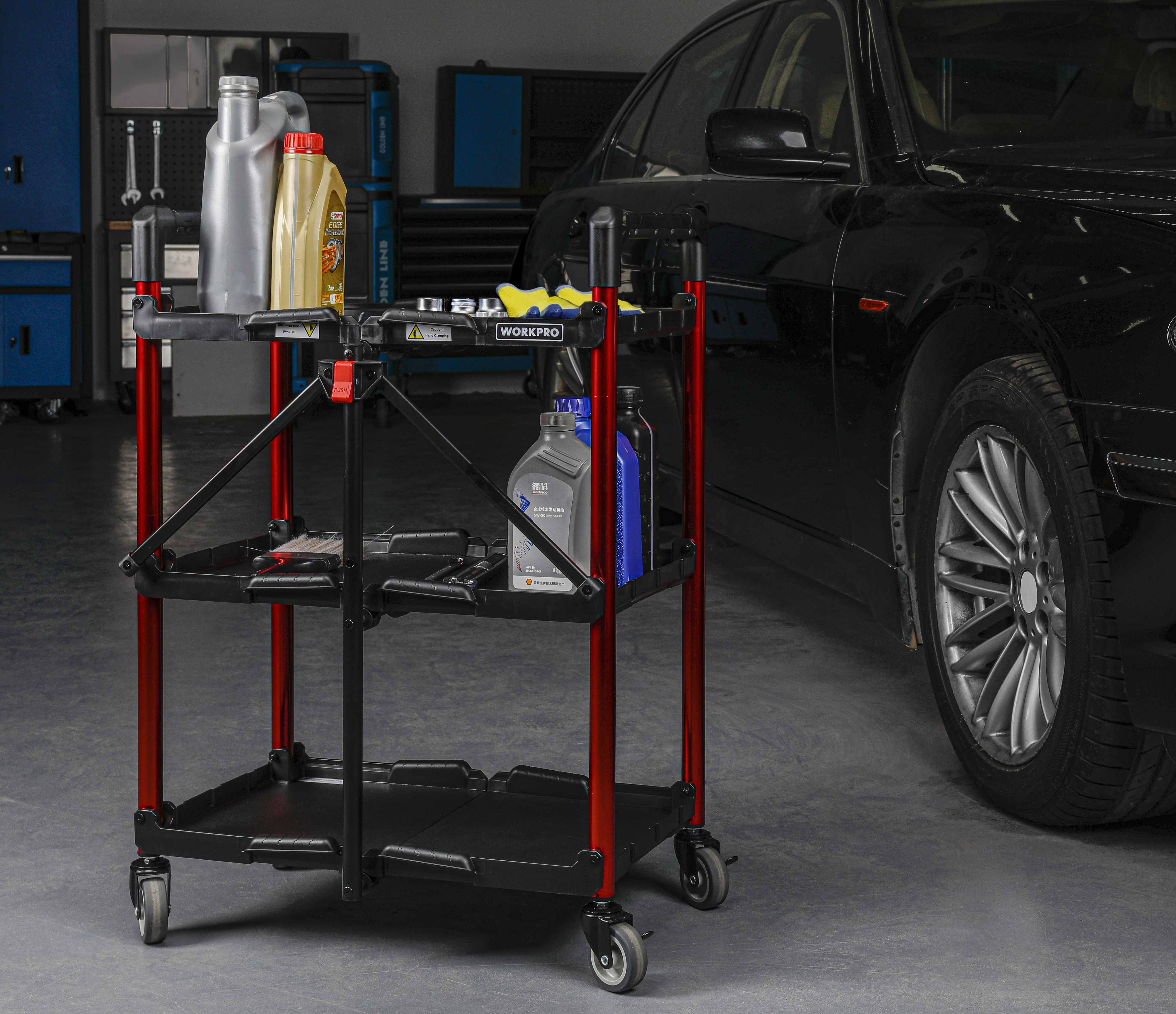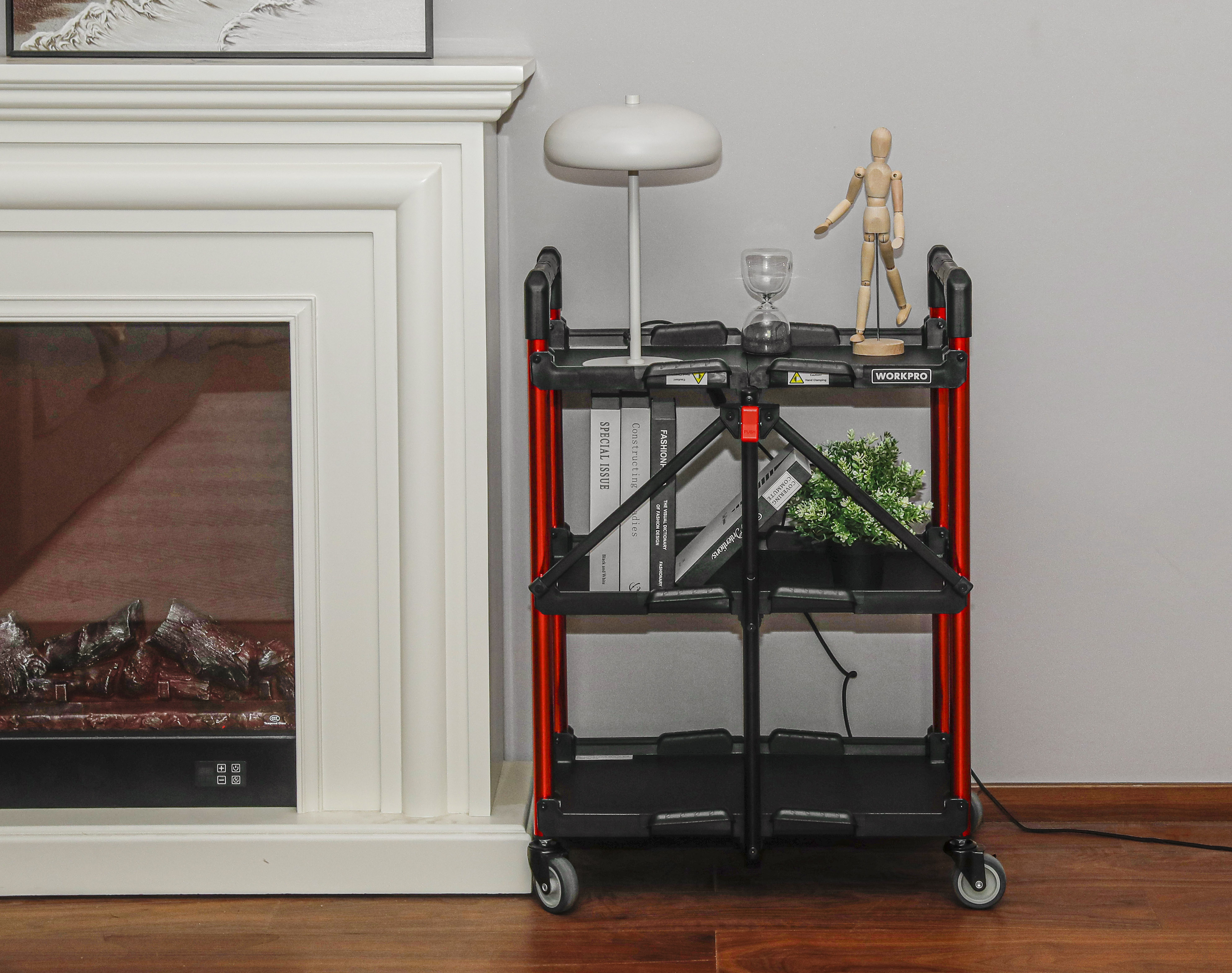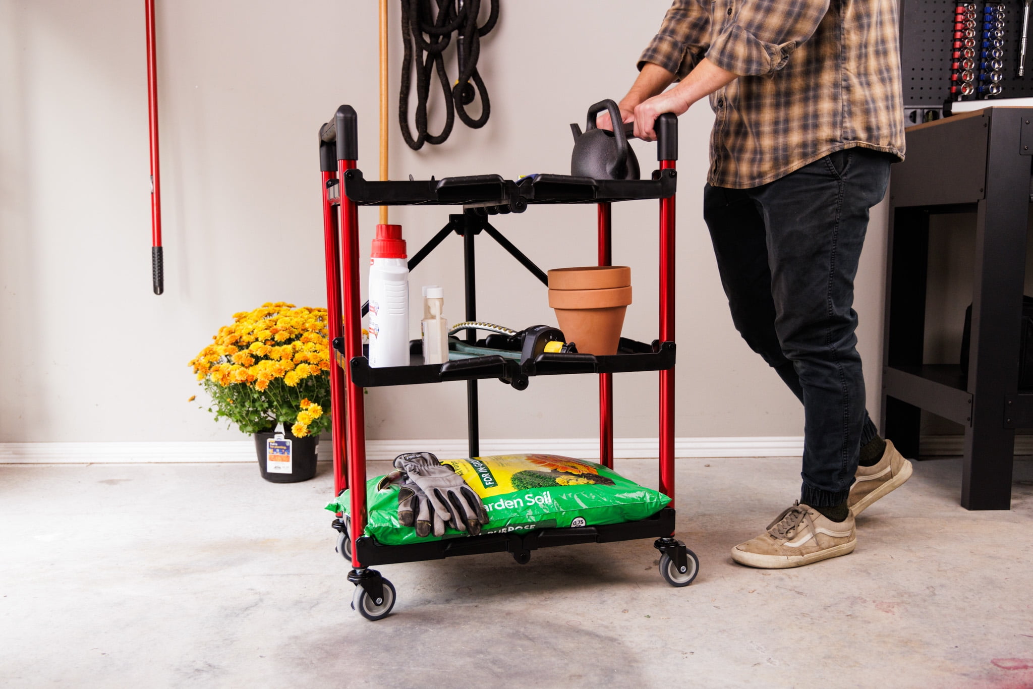 This WORKPRO service cart keeps all your tools and equipment in one place when needed for maintenance responsibilities Features a secure locking mechanism so it doesn’t collapse; 50 lb per shelf Quick easy collapsible feature for space saving storage 3 collapsible shelves designed to offer you plenty of space when moving equipment, tools, files, garden supplies and more Can be folded down to 8 inches to store away easily Black