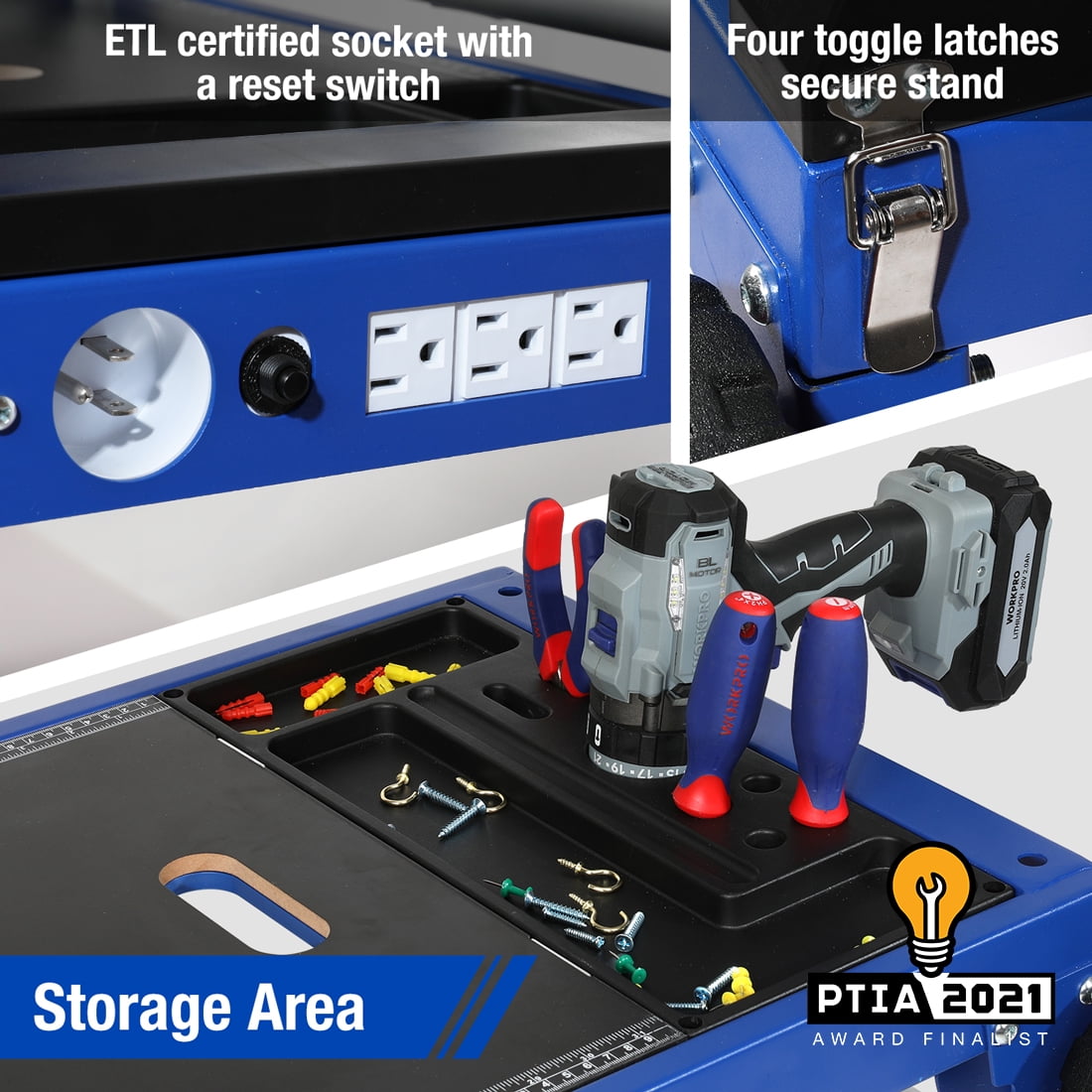 Quick Folding Design – What’s more attractive is that the workbench owns telescoping legs which have 3 nodes, allowing you to adjust it to 3 different heights. Large non-slip feet generate a broad, ultra-stable stance to stay where you place them. Robust Steel Frame & Reversible Panel – One side has anti-skid grain, facilitating a person to stand above or stack heavy goods. The other side has a scale up to 31-1/2″”(81cm) and a protractor. Super Mobility – The swivel casters enable the workbench to have the function of perfect steering. The large-size anti-skid wheels adopt high-quality materials, which guarantees the workbench to slide smoothly, and easily roll through many pits or bumps. Storage Compartment & Sockets – It has 3 three-head output sockets, 1 three-head input socket and a reset switch. A wide and thick handle relieves the pressure on the palm of your hand when you drag the workbench. Storage compartments for placing parts, screwdrivers, drills, etc. also provide additional convenience to you.