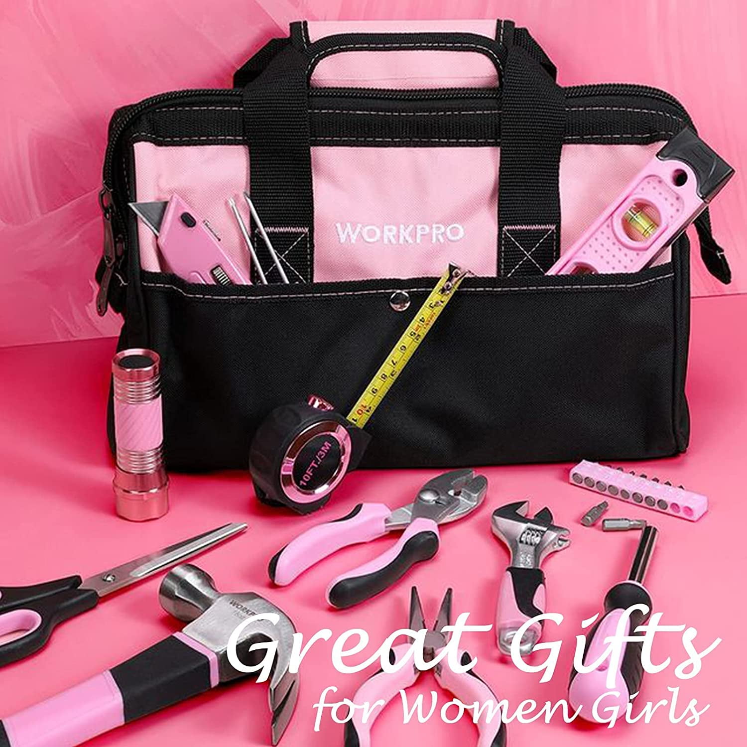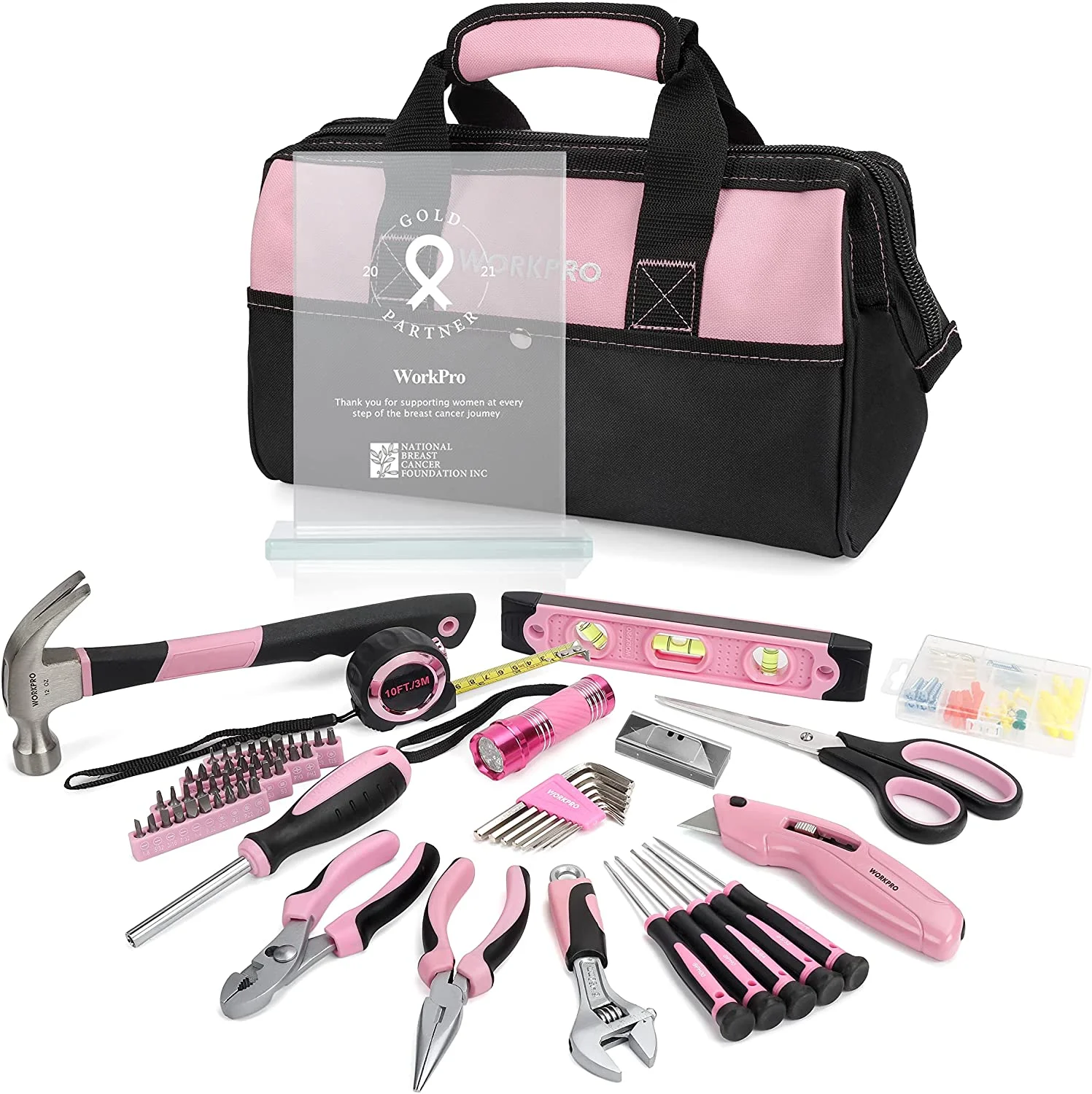 WORKPRO Pink Tool Kit, 106-Piece Lady’s Home Repairing Tool Set with Wide Mouth Open Storage Bag – Pink Ribbon