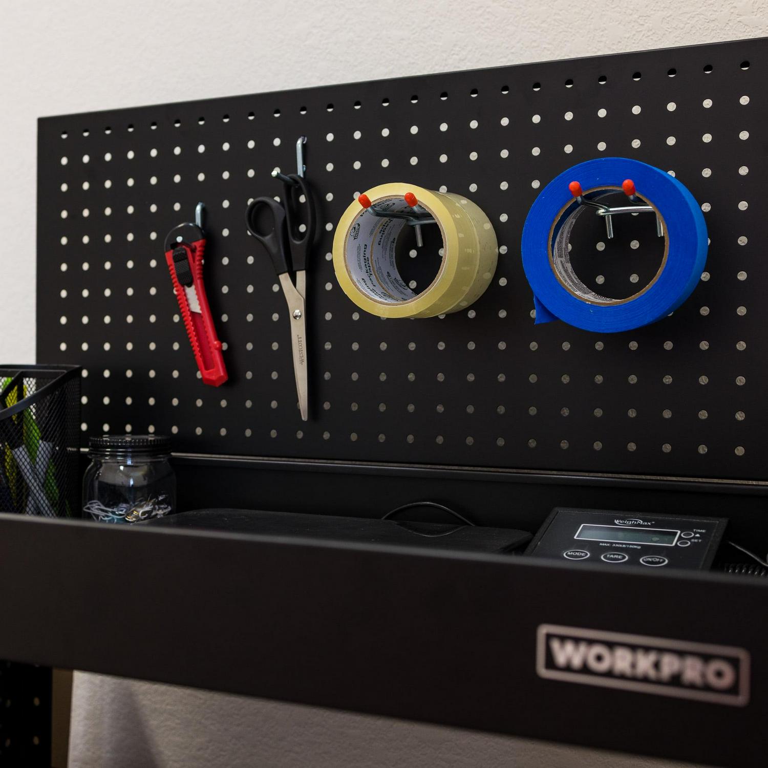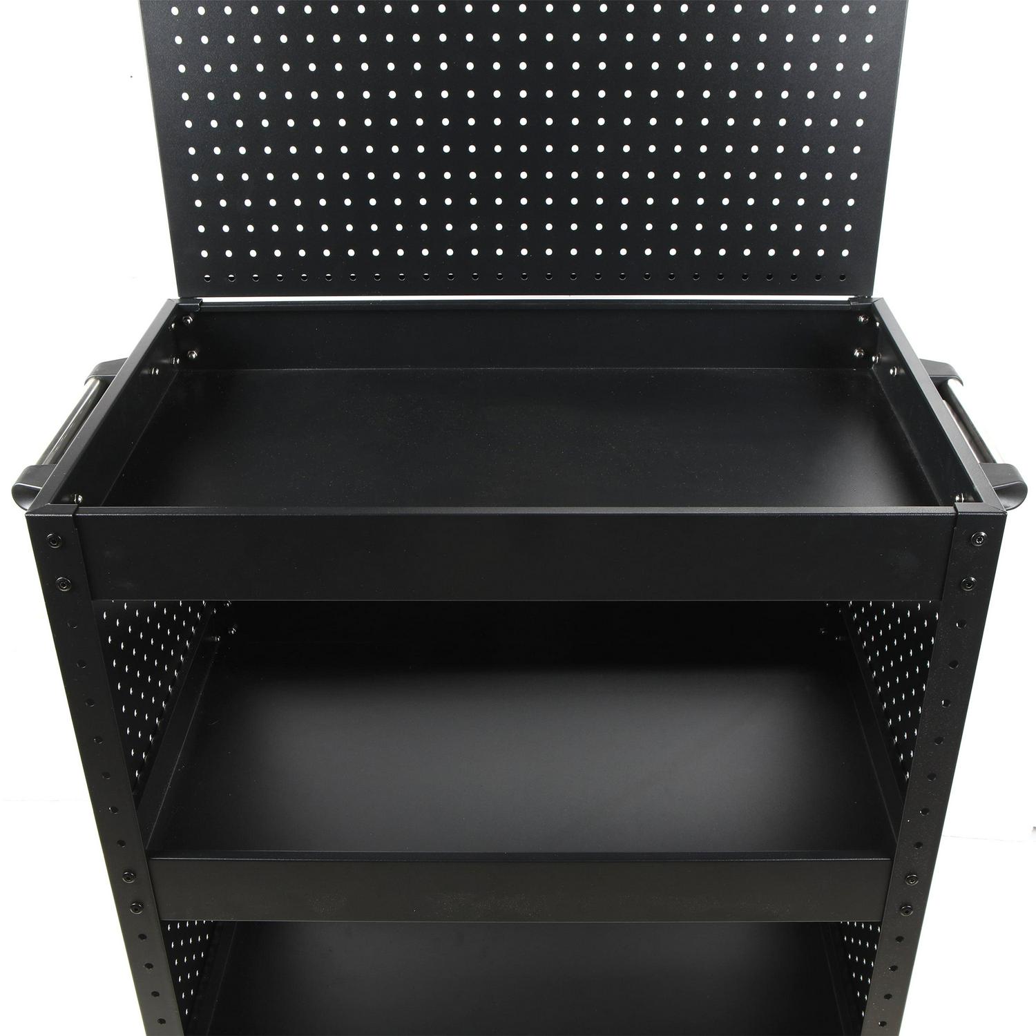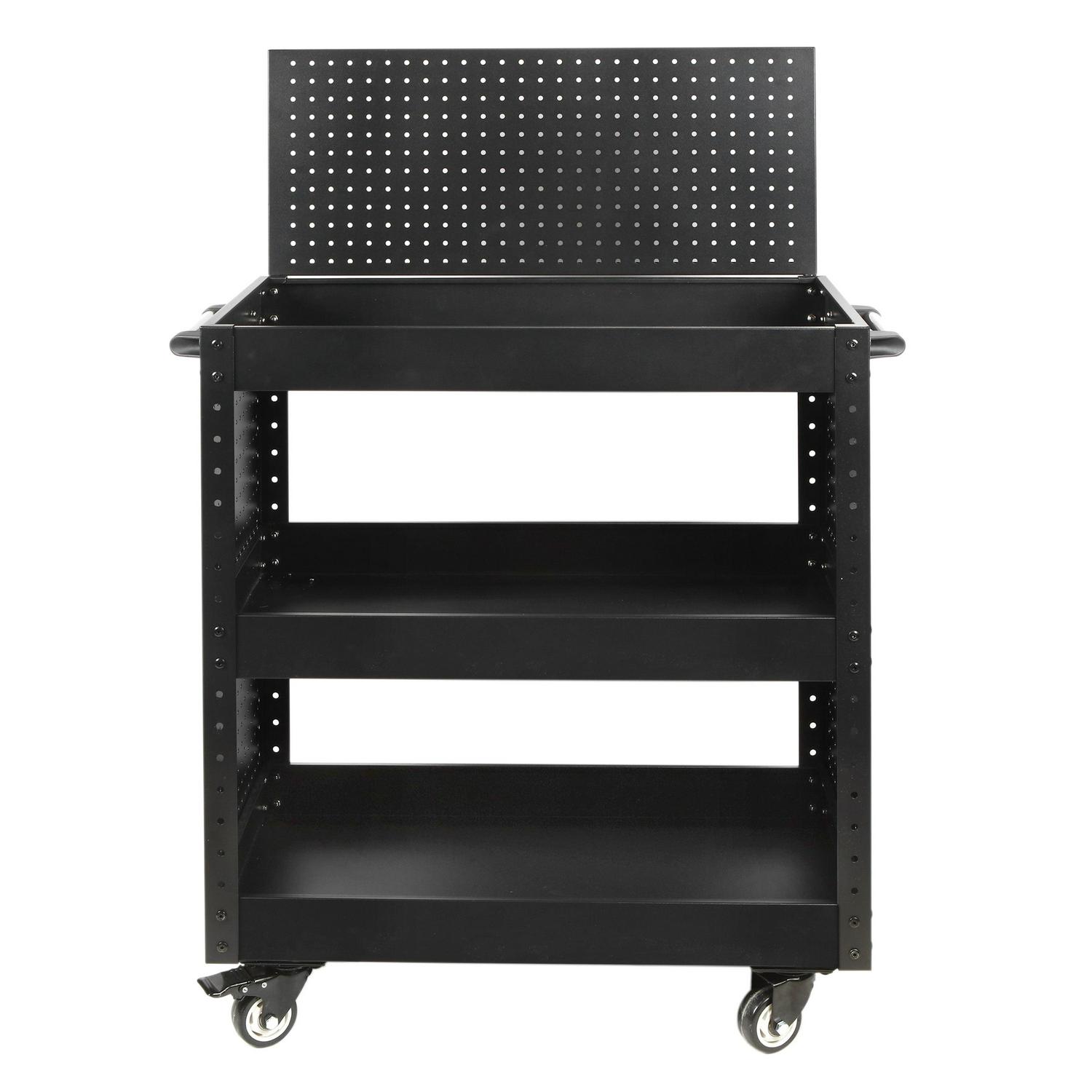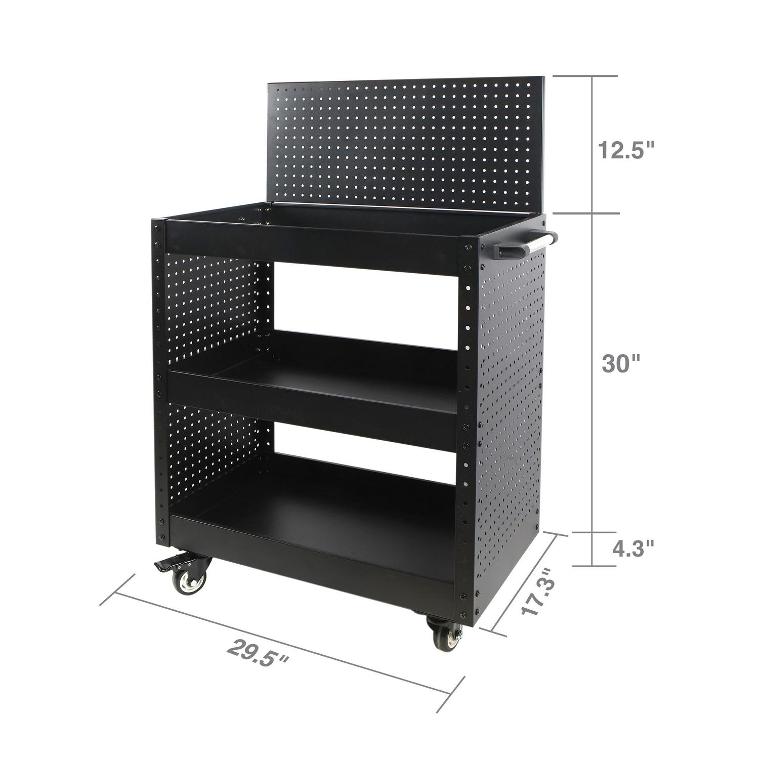 The WORKPRO rolling service utility cart with steel pegboard backer and sides is a great way to move items from point A to point B in your workshop, warehouse, office, or home with ease. This utility cart is constructed of heavy-duty powder-coated steel and equipped with four swiveling casters. A 12-inch x 29-inch pegboard backer can be installed on the top of the cart. The sides of the cart are also equipped with full pegboard panels. Standard pegboard accessories can be used to carry tools and equipment from one work area to the next. The utility cart is also equipped with three storage trays. The middle tray is height adjustable and all three have a lipped edge to prevent any items from rolling off. Each shelf has a 165-pound weight capacity. Assembly instructions and hardware included. Service cart for easy project transportation. Utility Cart that is perfect for grilling, cooking, mechanic workshops, salons, greenhouses, or at home in your garage!