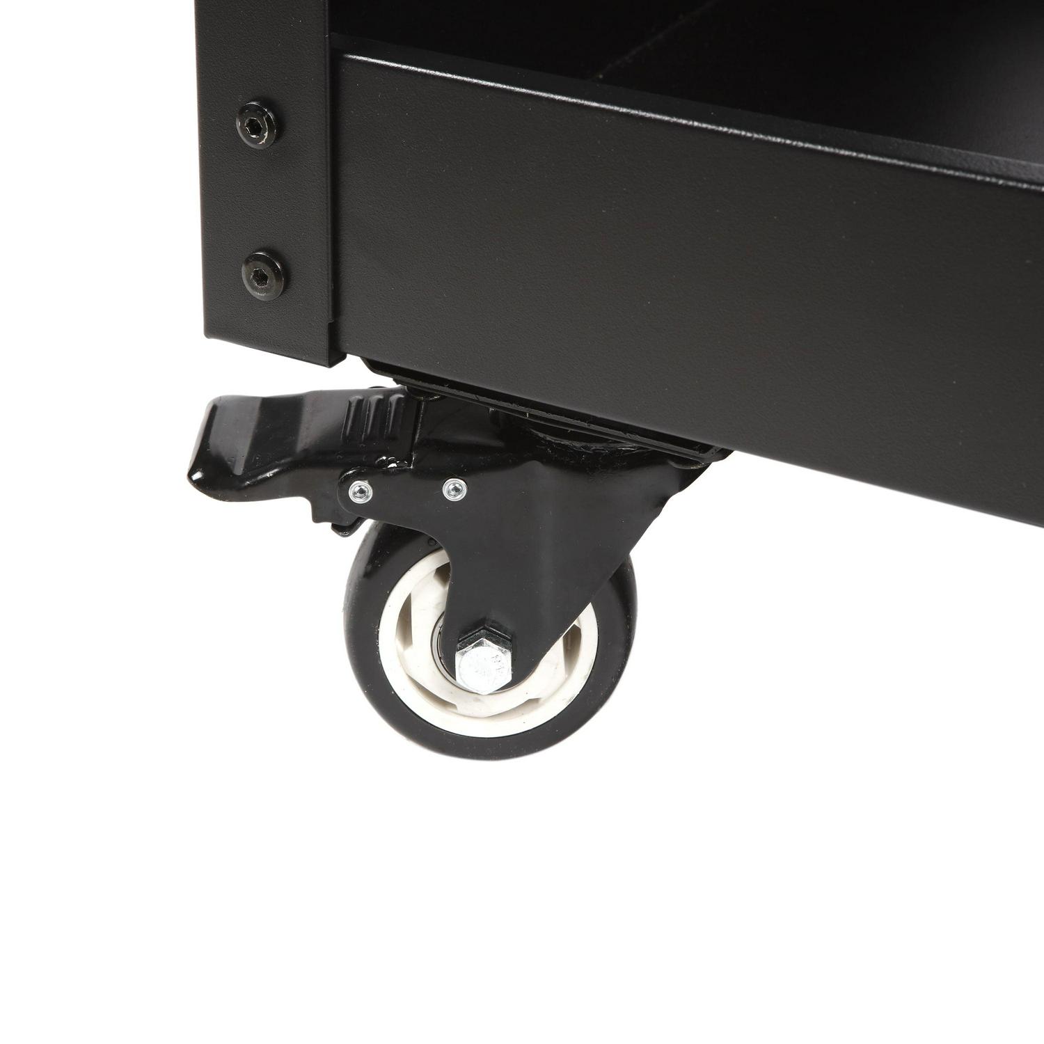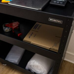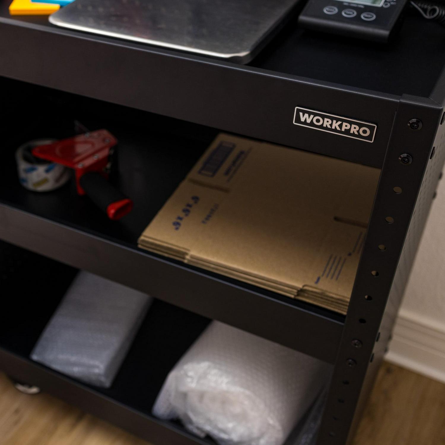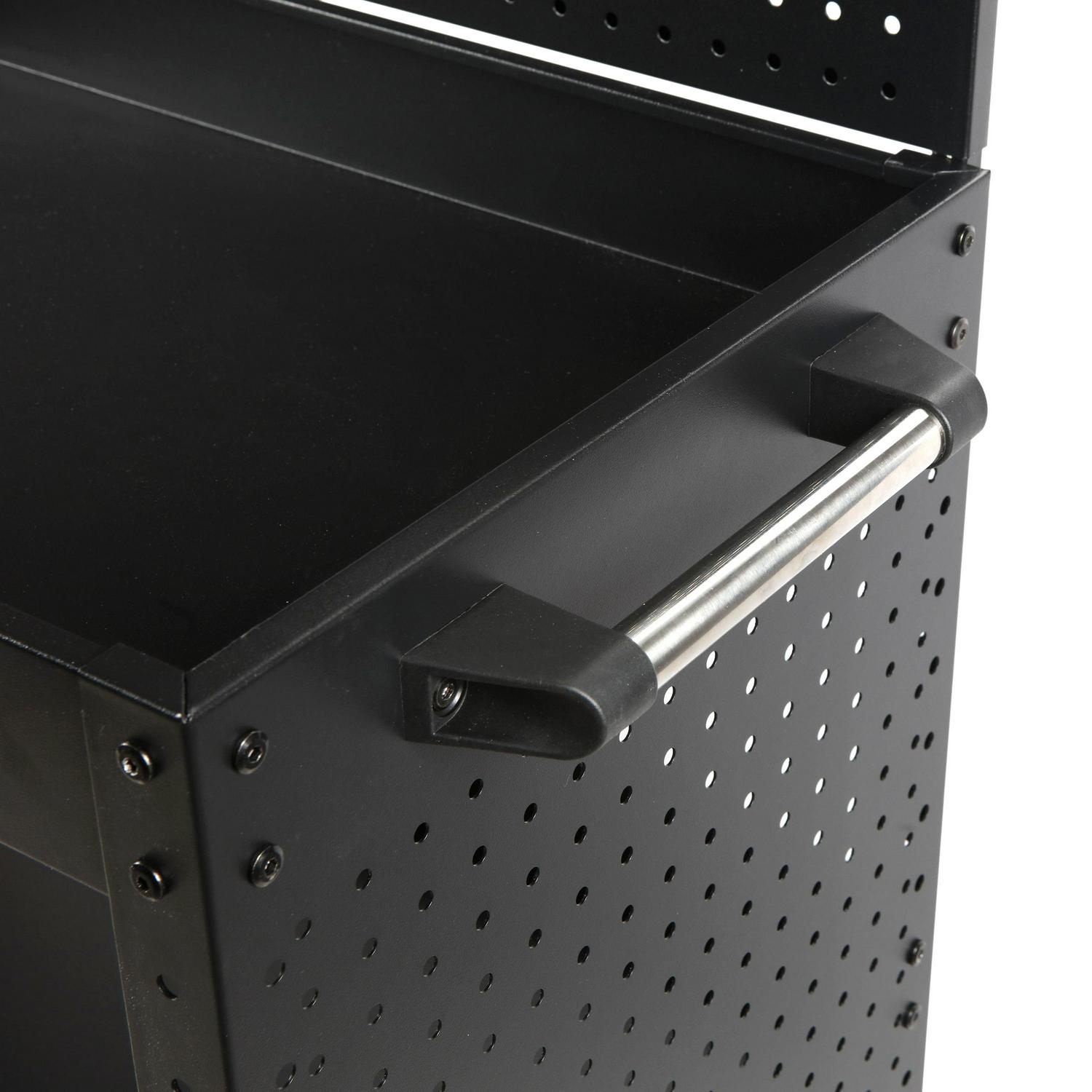 The WORKPRO rolling service utility cart with steel pegboard backer and sides is a great way to move items from point A to point B in your workshop, warehouse, office, or home with ease. This utility cart is constructed of heavy-duty powder-coated steel and equipped with four swiveling casters. A 12-inch x 29-inch pegboard backer can be installed on the top of the cart. The sides of the cart are also equipped with full pegboard panels. Standard pegboard accessories can be used to carry tools and equipment from one work area to the next. The utility cart is also equipped with three storage trays. The middle tray is height adjustable and all three have a lipped edge to prevent any items from rolling off. Each shelf has a 165-pound weight capacity. Assembly instructions and hardware included. Service cart for easy project transportation. Utility Cart that is perfect for grilling, cooking, mechanic workshops, salons, greenhouses, or at home in your garage!