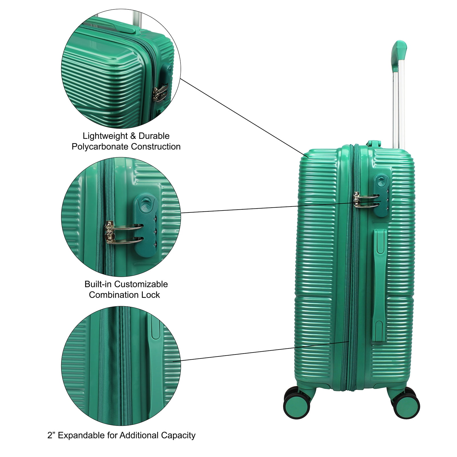 Experience effortless travel with this robust luggage set, featuring a durable polycarbonate shell construction that ensures long-lasting protection for your belongings. With a convenient two-inch expansion feature, the luggage adapts to your packing needs, while the telescopic handle system and easy glide spinner wheels provide smooth maneuverability through busy terminals. Keep your items secure with the integrated 3-digit combination lock, and enjoy added convenience with top and side grip handles for easy lifting. Inside, the fully lined interior offers optimal organization with a zipper divider, shoe pockets, a mesh accessory pocket, and compression straps to keep everything in place during transit.