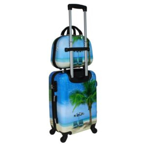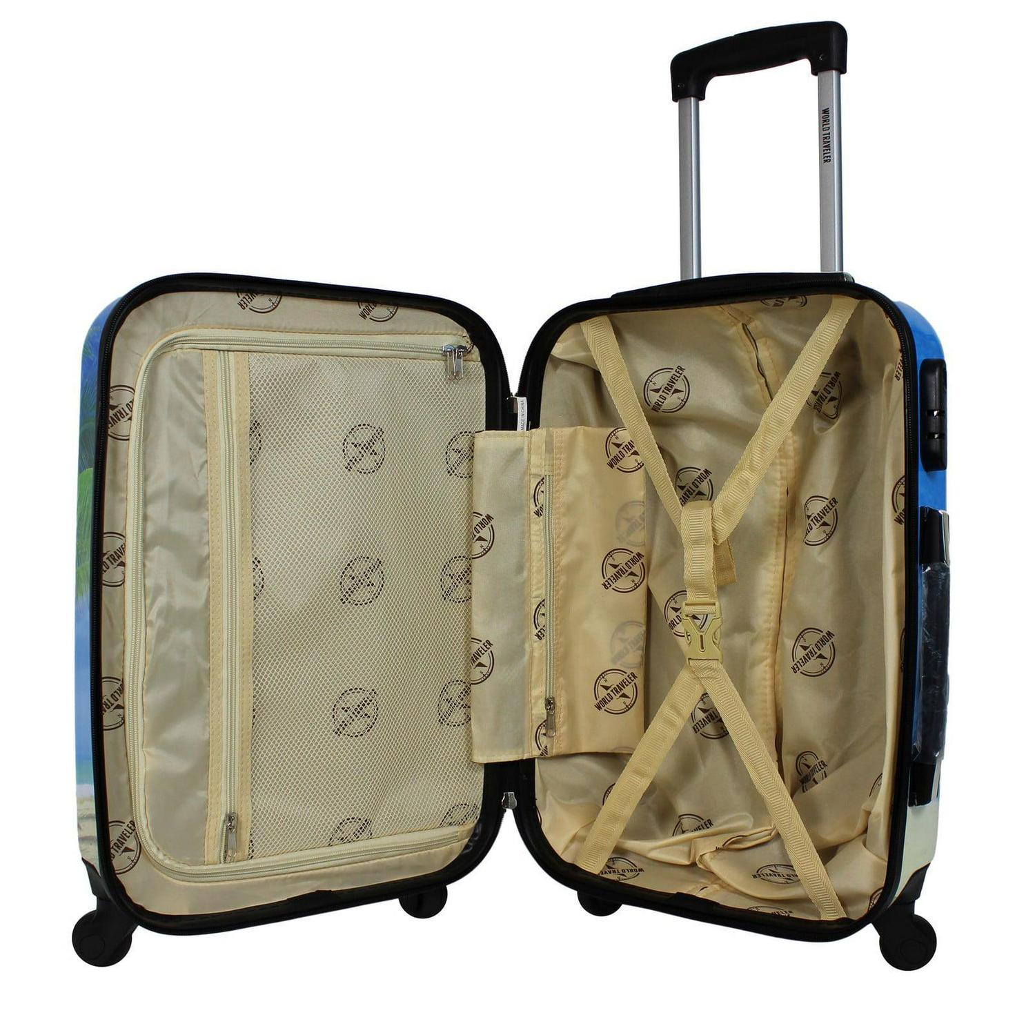 This World Traveler palm tree hardside 2-Piece Carry-On Spinner luggage set is made of impact resistant Polycarbonate and features a shoulder tote bag, built-in 3-digit combination lock, four(4) spinner wheels, a retractable telescopic handle, top and side grip handles, and a fully lined interior with zipper divider and compression straps.