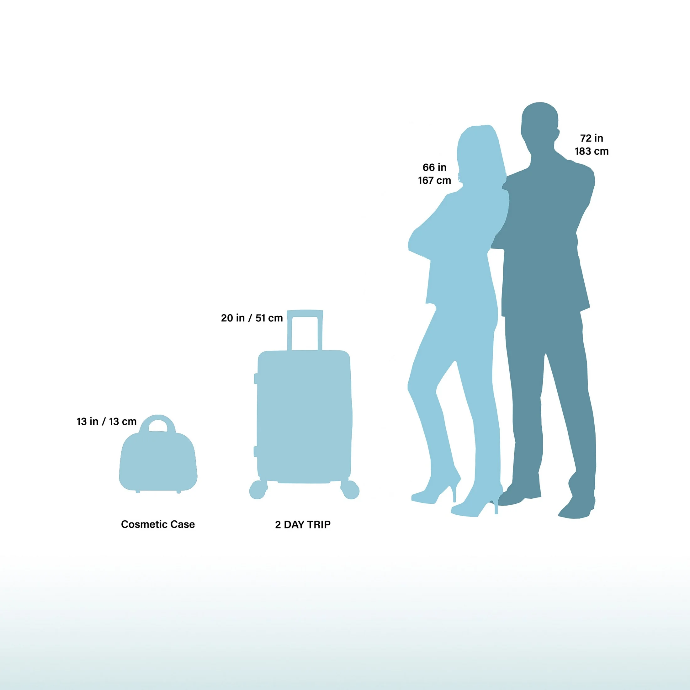 The luggage Set includes a 20″ carry-on and a 13″ shoulder tote Durable polycarbonate shell construction, Telescopic push-button handle system, Easy glide spinner wheels Top and side grip handle, Fully lined interior features a zipper divider, and compression straps The Beauty case features a rear strap that slides over the luggage handle, a zipper divider, and accessory pockets Carry-On Luggage Dimension: 20″ H x 13.5″ L x 9″ W – 6.4 lb. (22″ H including wheels) Beauty case dimensions: 11″ H x 13″ L x 7″ W – 1.85 lb.
