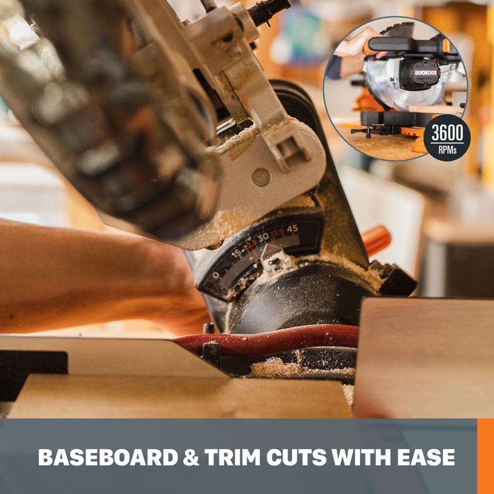 The Worx Nitro WX845L 20V Power Share 7.25 in. Cordless Sliding Compound Miter Saw has the power, expanded functionality, and run time needed to tackle advanced DIY projects or to use for professional work. This 20V Miter Saw is part of the Worx Nitro line of battery-powered tools, which, when paired with Power Share PRO high-capacity batteries, offer extended run times, plus more power and performance than other battery-operated tools on the market. 8-1/4 in. of maximum cutting capacity (@ 90°) gives this Sliding Miter Saw professional-grade operability (5-3/4 in. @ 45°). Work holding clamps on both sides of the blade and the extension wings hold projects of all sizes securely in place for safer, more efficient cutting, making this saw great at cutting flooring, crown molding, door frames and more. The bevel knob ranges from 0-45° allowing for perfect miter cuts, and cutting depth adjustments make partial cuts, dadoes and rabbets easy (maximum cutting thickness: 2-1/4 in @ 90°, 1.63 in. @ 45°), while the miter detents are handy for cutting the most common angles. This Sliding Miter Saw spins the 7-1/4 in. blade (5/8 in. arbor) at 3600 RPM of no-load speed. And when using a 4.0Ah Power Share PRO battery it offers longer run times than typical 20V Miter Saws. (Up to twice as long as standard 2.0Ah batteries.) It weighs only 21 lbs. so it s easy to transport from the workshop to the jobsite, saving you the time and hassle of bringing projects back and forth.