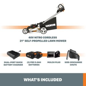 The Worx Nitro WG753 40V Power Share Cordless 21″ Self-Propelled Lawn Mower with Rear Wheel Drive and 2X 5.0Ah Batteries has a highly-efficient brushless motor running 50% longer, churning out 25% more power, and providing 10% more life than brushed motors. With two high-capacity Power Share PRO batteries, this self-propelled mower is a worthy replacement to gas mowers. And does so without any of the drawbacks of gas, like the cost, mess, fumes, excessive volume, or extra maintenance. Full of quality-of-life features, like rear-wheel drive with a variable-speed control so the user can pick a pace that s comfortable for them. Single-lever height adjustments and mode changes make switching between cutting heights (7-positions, 1.6 in.-4 in.) and cutting modes (bag/mulch/side-discharge) quick and easy. LED lights provide greater visibility when mowing at dusk or in other low-light conditions. Auto-Intellicut technology increases the speed of the blades when it detects thicker grass, then slows them back down when the mowing gets easier to conserve battery usage. And the one-touch fully-collapsible handle makes for compact, stand-up storage in the garage. The bag capacity is 2 Bushels, the wheels are 8 in. (front) and 10 in. (rear). The durable steel cutting deck is a wide 21 in. (20 in. cutting width) and great for lawns with rough terrain, and features Nutricut dual-stage mulching capabilities to return both water and nutrients back to your lawn.