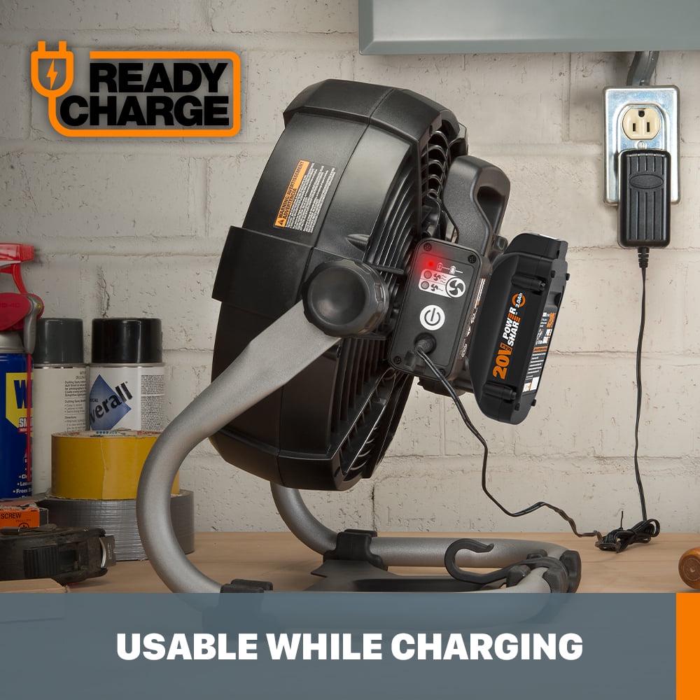 Every workspace needs a fan. Get one that you can take from job to job, or move around the workshop. The Worx Nitro 20V Power Share Cordless Work Fan with Ready Charge is perfectly designed to meet that requirement. Small and lightweight enough to be portable, powerful enough to cool down or ventilate a room. Use it anywhere on battery power for up to 6 hours on Low speed, or 2 hours on High, with a standard 2.0Ah battery. Or take advantage of its Ready Charge functionality and plug it in and charge the battery while the fan is still in use. Low speed operates at 0-1500 RPM/310 CFM, High at 2500 RPM/450CFM. To put it in perspective, that s as much high-volume air output as a heavy-duty leaf blower. Yet this fan s blade diameter is only 9 in, and it weighs just 5 lbs., so it s easy to transport and store. The head rotates 360 degrees so you can blow or ventilate in whichever direction you need to. The convenient hanging hook means you can place it up high and hang it from a shelf, beam, pipe, or pretty much anything. It also has mount holes on the back so you can install it on the wall for a more permanent placement. This cordless work fan is part of the Worx Nitro Series of battery-powered tools, engineered to deliver more performance and run time than other battery-operated tools on the market.