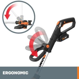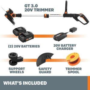 The Worx cordless 20 Volt max Lithium powered string trimmer delivers new levels of power, precision and function. Those 20 V of max Lithium battery power give the WG163 longer run times and more power. The 12 In. cutting diameter means more trimming in less time. Convert to an edger in seconds, with dual-positioned in-line wheels that make edging a breeze. The innovative command infeed instant line feeding system keeps you productively moving on your lawn projects. Make easy height adjustments to the telescopic shaft using the quick-release trigger lever. Turn the trimmer head with an easy pull and turn to lock and convert to edging in seconds. The max Lithium battery power means more battery capacity, longer runtime, no self-discharge, no slow loss of power, less weight, more power and quicker charging times. Charge the battery within 3 hours and it ll be ready when you need it with no-self discharge. From function to features, the 20 V Worx GT 3.0 features 100% single-line feed which means no bumping to extend the line. An adjustable space guard not only helps protect vegetation, it also acts as an edger guide. A front auxiliary handle has 7 locking adjustments for maximum comfort while trimming or edging. Weighing in at less than 6 lbs., the GT 3.0 20 V trimmer and edger lets you create a professional-looking yard with less work, less fatigue and in less time.