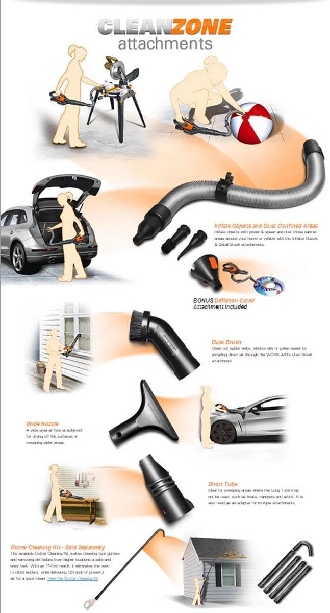 The WORXAIR is a multi purpose blower and sweeper with convenient attachments to create a clean zone around the entry points to your home. Did you know, 85 percent of the dirt in your home is tracked, blown or carried in from entry points like your garage, deck, porch or workshop. With the WORXAIR, clean up is easier and faster when you don’t have to move a single thing. The 20 volt MAX Lithium battery gives you cordless clean up without any smelly exhaust or tangled cords. The WORXAIR has all kinds of attachments for cleaning, clearing, sweeping, dusting, inflating, deflating and even drying all sorts of things around your home. It is an ultra fast cleaning system. Create that clean zone around your home with a flexible tube and a variety of nozzles designed to reach tight spaces for detailed clearing and cleaning of debris. Use the inflator nozzle to blow up mattresses and pool toys. The WORXAIR even comes with a deflator cone to quickly and easily deflate those bulky inflatable’s in the home, for the RV or boat. Outside the home, the dust brush is excellent for clearing spider webs, cleaning window sills from pollen and dirt and sweeping sills. The wide nozzle creates a wide airflow for drying flat surfaces or sweeping wider areas. Also, the WORXAIR is a great auto detailing companion. Use it to dry wheels and tires and even your entire car. Create and maintain a clean zone around your home Cordless convenience with the powerful 20 volt MAX lithium battery Ultra lightweight and compact to fit and go anywhere Includes 8 attachments for an array of clean up or inflating tasks 120 mph air speed with 80 cfm air flow and only 3.5 lbs.