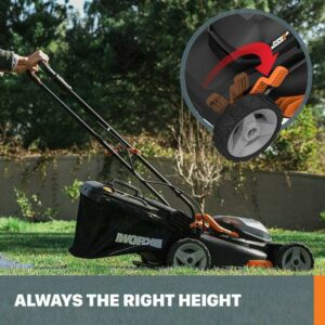 The 2-in-1 Bag & Mulch 40V Lawn Mower from Worx has all the power and advantages of a traditional mower, without the drawbacks. Battery-powered mowers are quieter, more efficient and cost effective, and cleaner to use for both you and the environment. And with double the power and double the runtime, this mower offers gas-like performance. The two 20V batteries in this model to give it 40V of power, and this version comes with two 4.0 Ah batteries. That s twice as much charge as the standard 2.0 Ah rechargeable batteries, for twice the runtime. You can mow up to 1/8 acre per charge. And we tossed in a dual-port charger, so you can fill up quickly. It takes 2 hours to charge both or if you just need one battery for another Worx PowerShare tool, you can charge one in just an hour. This is a modern mower with modern features. Intellicut gives you extra torque when the grass is thicker, and then lets you dial it back down to conserve energy when the terrain is smooth. The six cutting height positions range from 1.5 -4.0 , and the cut-to-edge placement of the blades lets you get closer to the house or garden for less trimming later.
