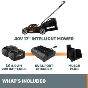 – [INCLUDES] 17 40V Mower, (2) 20V 4.0Ah Batteries, 4A Dual Charger, 1.1 Bushel Collection Bag, Mulch Plug
